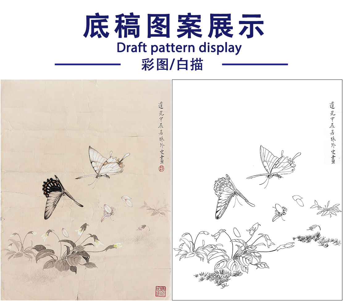 梁若珠花鸟工笔画白描底稿《花蝶图》临摹勾线高清打印画稿CL10