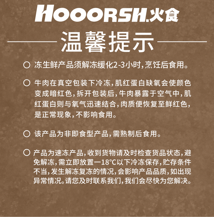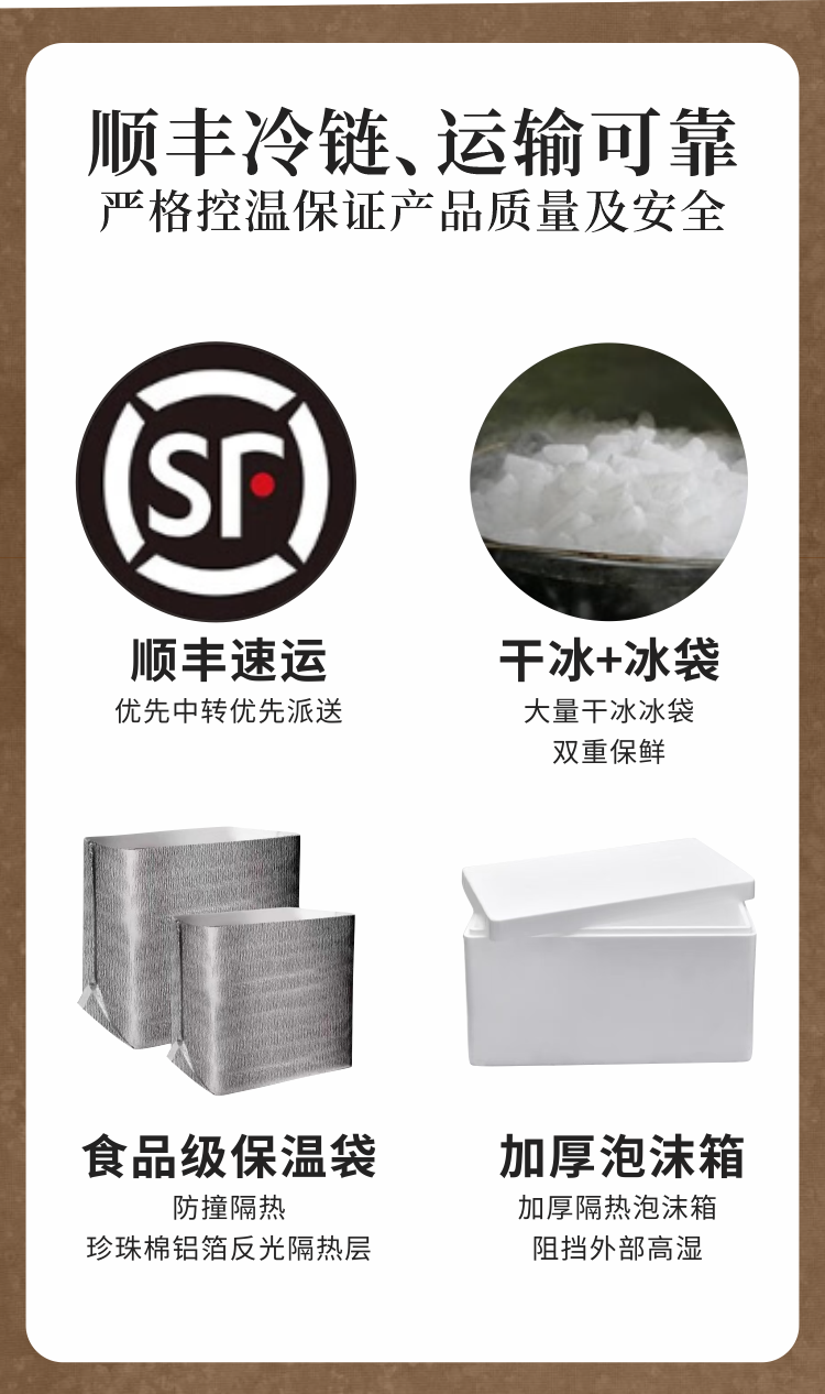 4. 生鲜冷冻产品不支持7天无理由退换货,不支持拦截、拒收,如因地址错误、收件地址不详细、快递联络不上收件人等情况,造成的包裹延迟派送或拒签造成的损失,由买家自行承担!