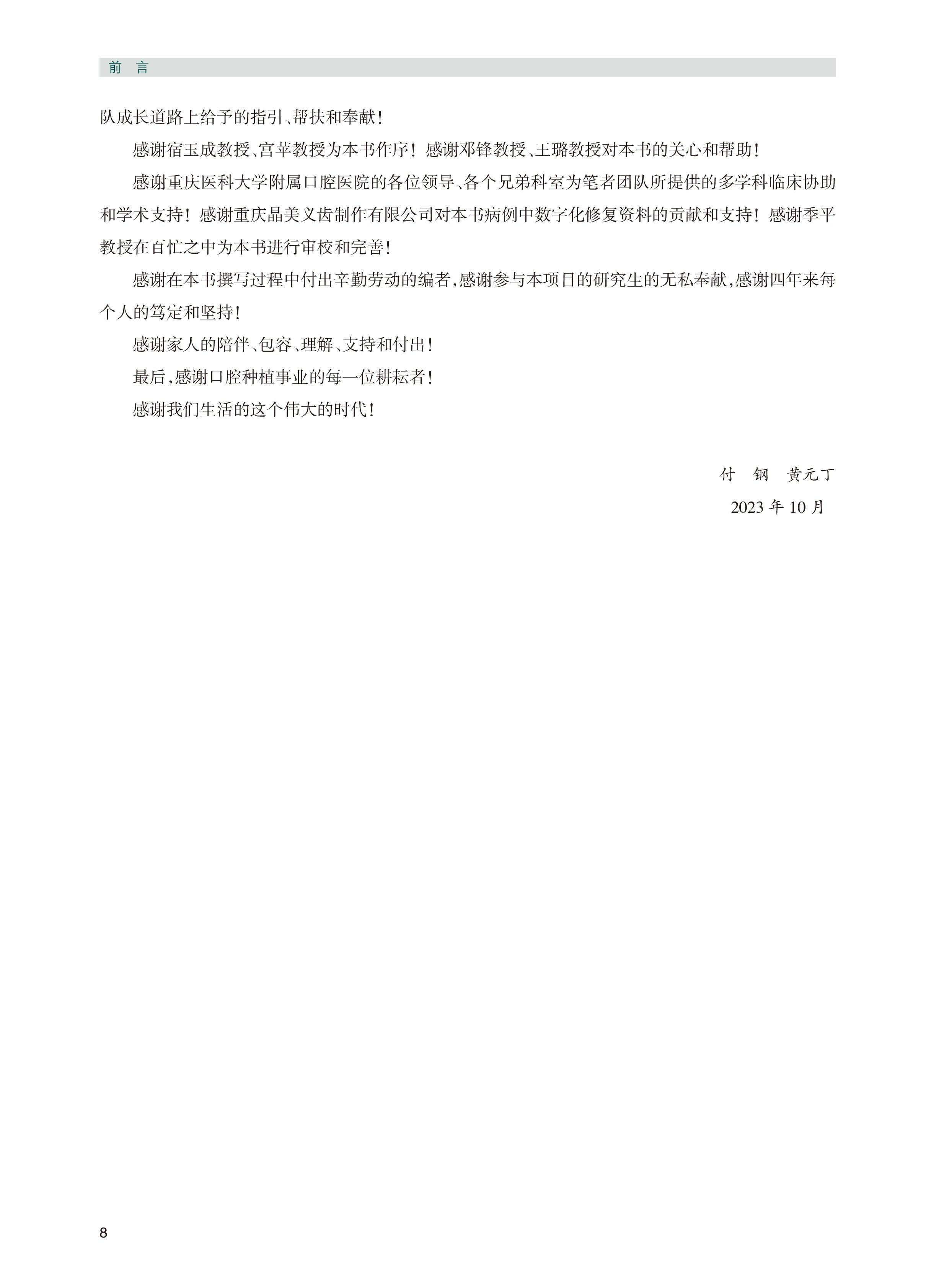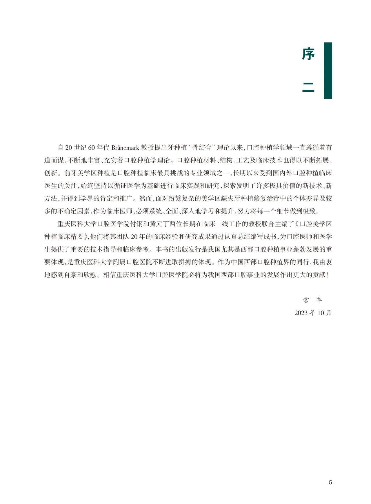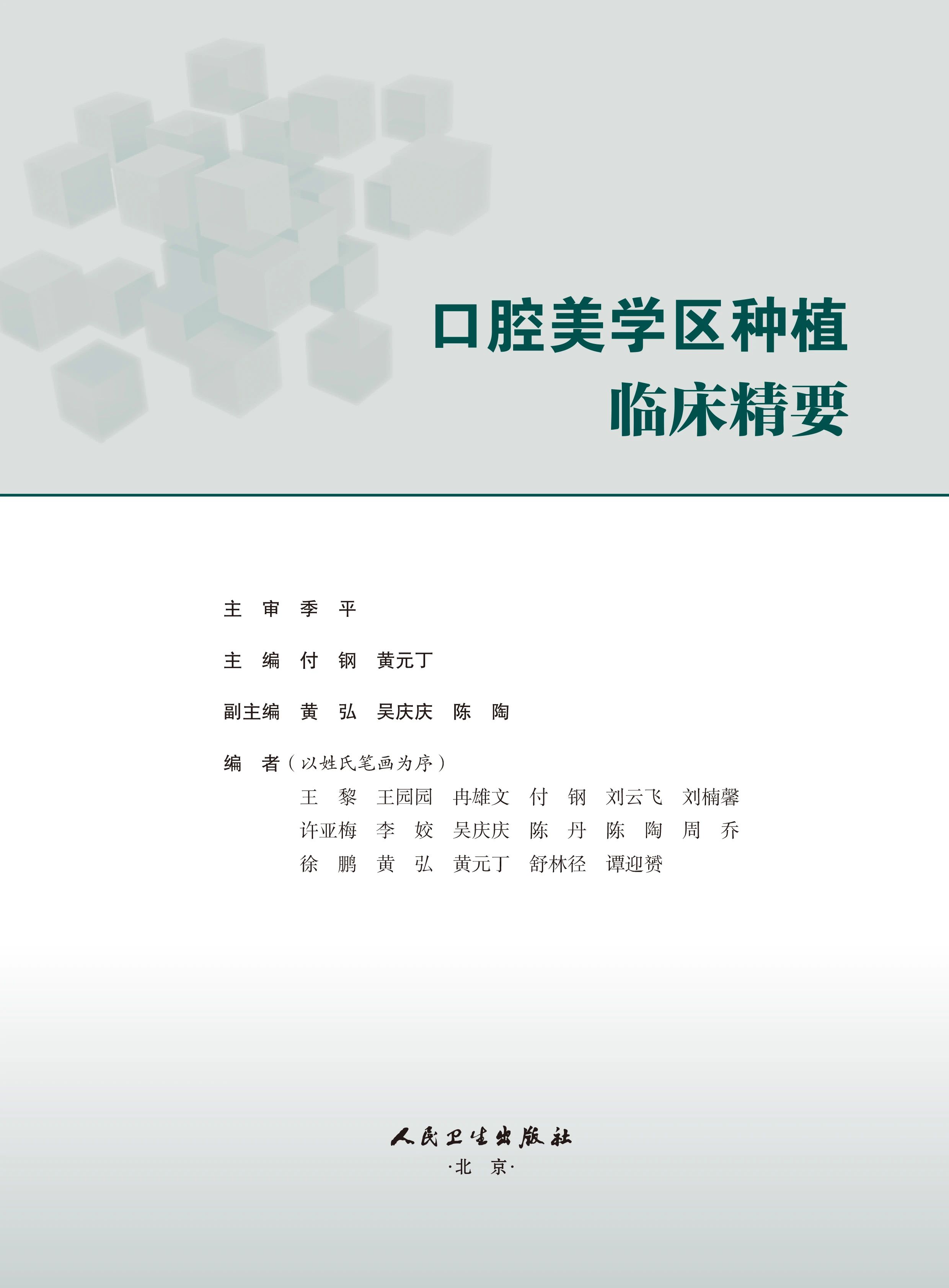 1 重庆医科大学附属口腔医院付钢和黄元丁教授及其团队总结20年临床经验和研究成果,全书贯穿以(美学)修复为导向的种植治疗原则,并针对前牙美学区的种植修复特点提出了“维持+重建”两大治疗理念。