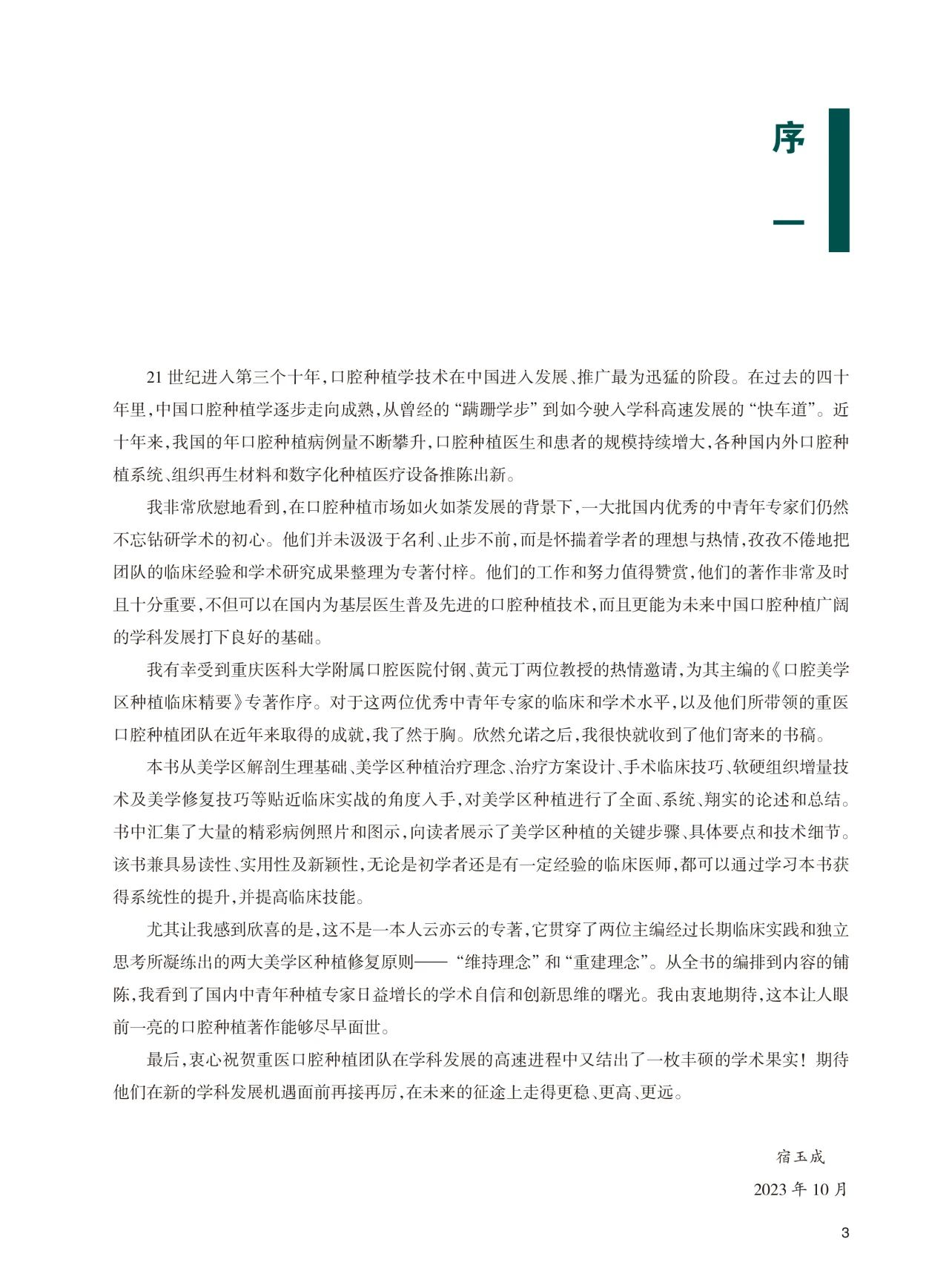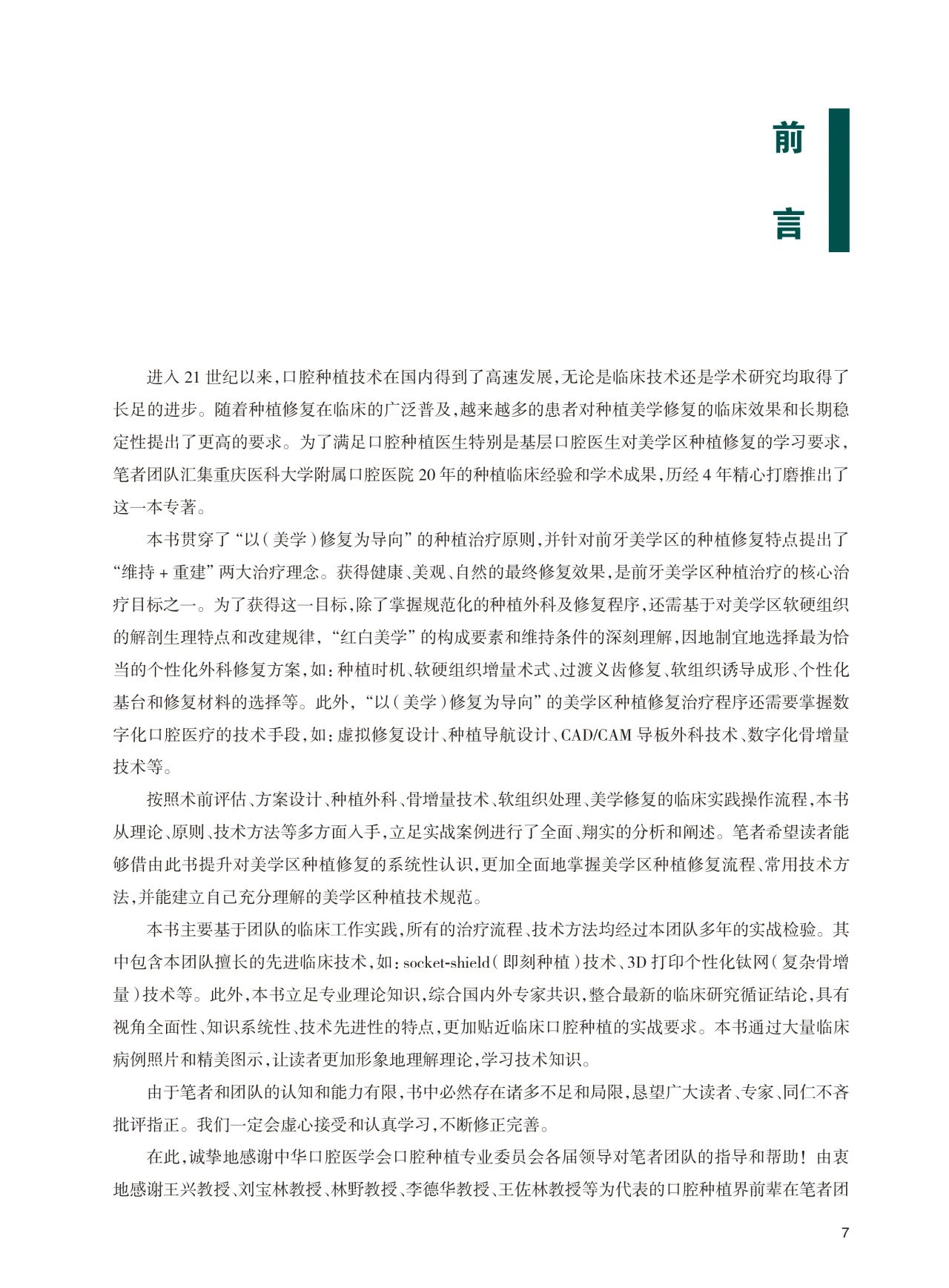 2 本书从美学区解剖生理基础、美学区种植治疗理念、治疗方案设计、手术临床技巧、软硬组织增量技术及美学修复技巧等贴近临床实战的角度入手,对美学区种植进行了全面、系统、翔实的论述和总结。