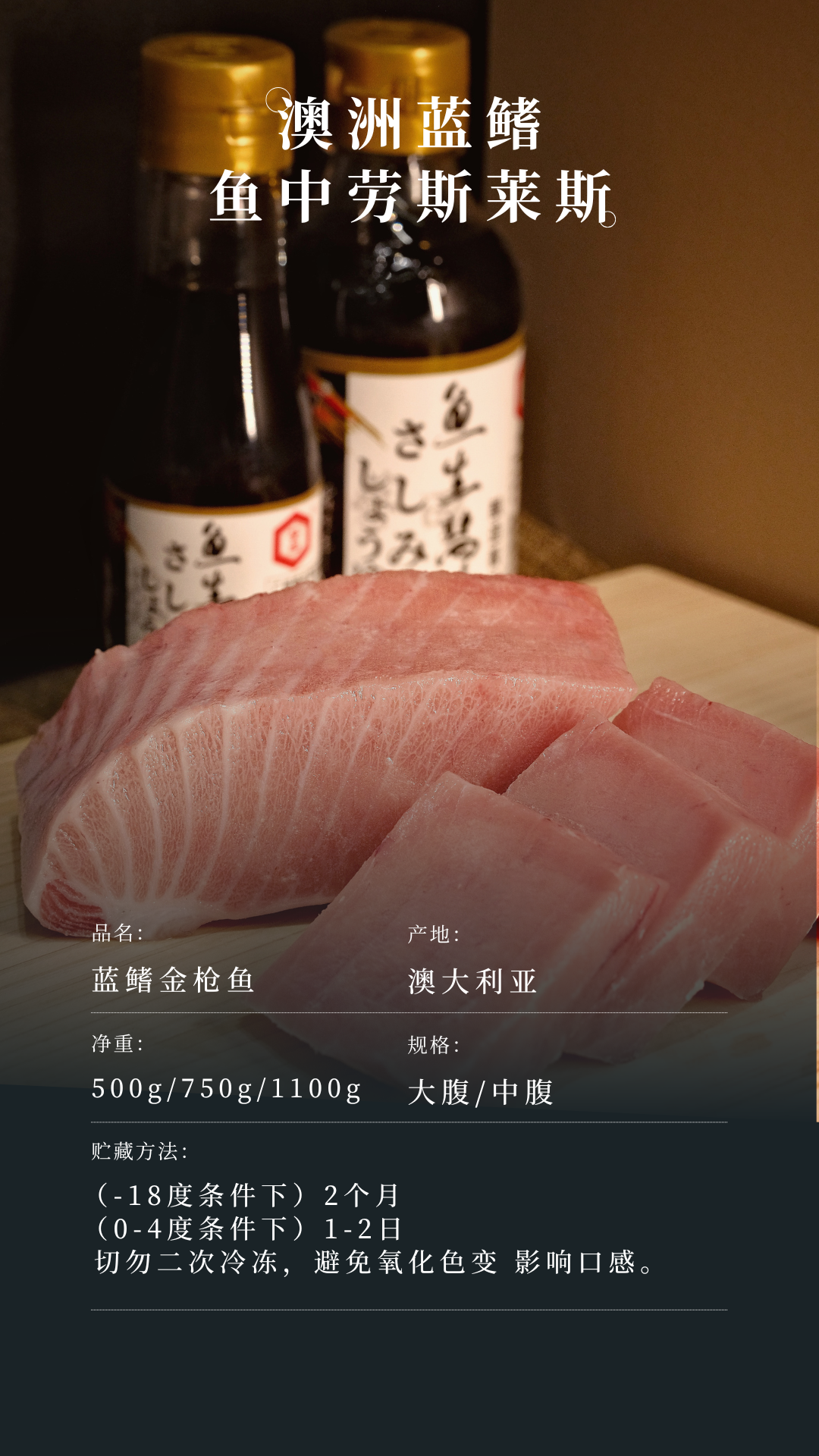 甄选蓝鳍金枪鱼,来自澳洲林肯港stehr渔场捕捞养殖,冷链空运到国内,肉质最大程度保障新鲜。