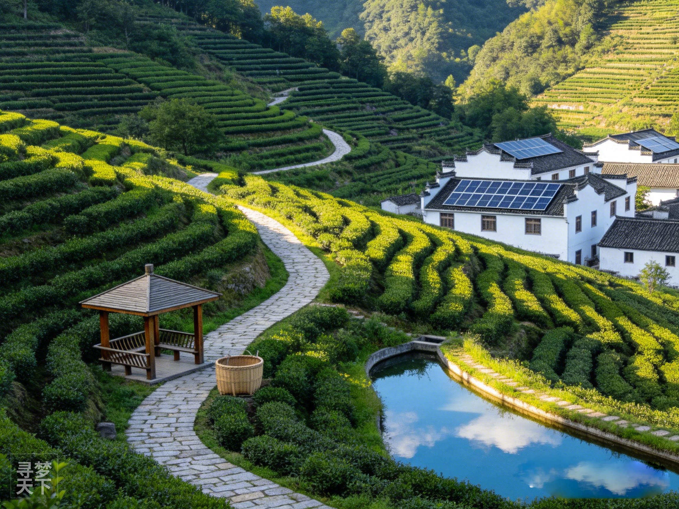 文新茶村:茶园梯田、晨雾、茶农采茶、茶山全景。
