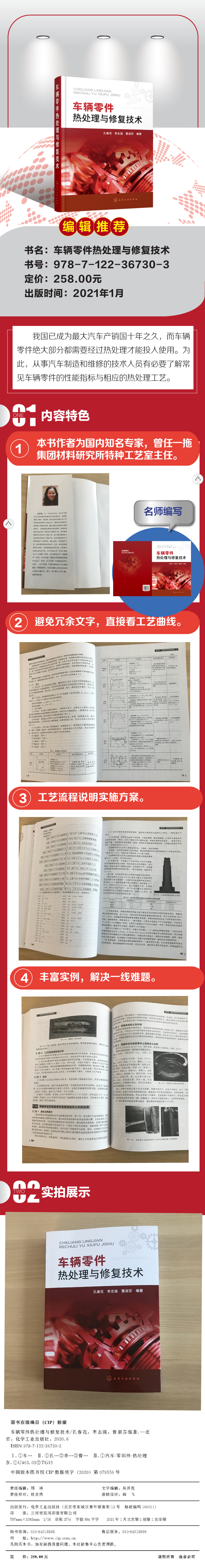 机械零件大部分需要经过热处理,尤其是车辆零件,根据工况不同,零件材料不同以及精度要求不同,车辆零件的热处理工艺以及产品寿命都有明显差别。作者汇集几十年一线工作经验,通过大量实例,展现不同工况下车辆零件的处理方法以及参数选择不同而导致的不同的表面质量参数和产品寿命的变化。