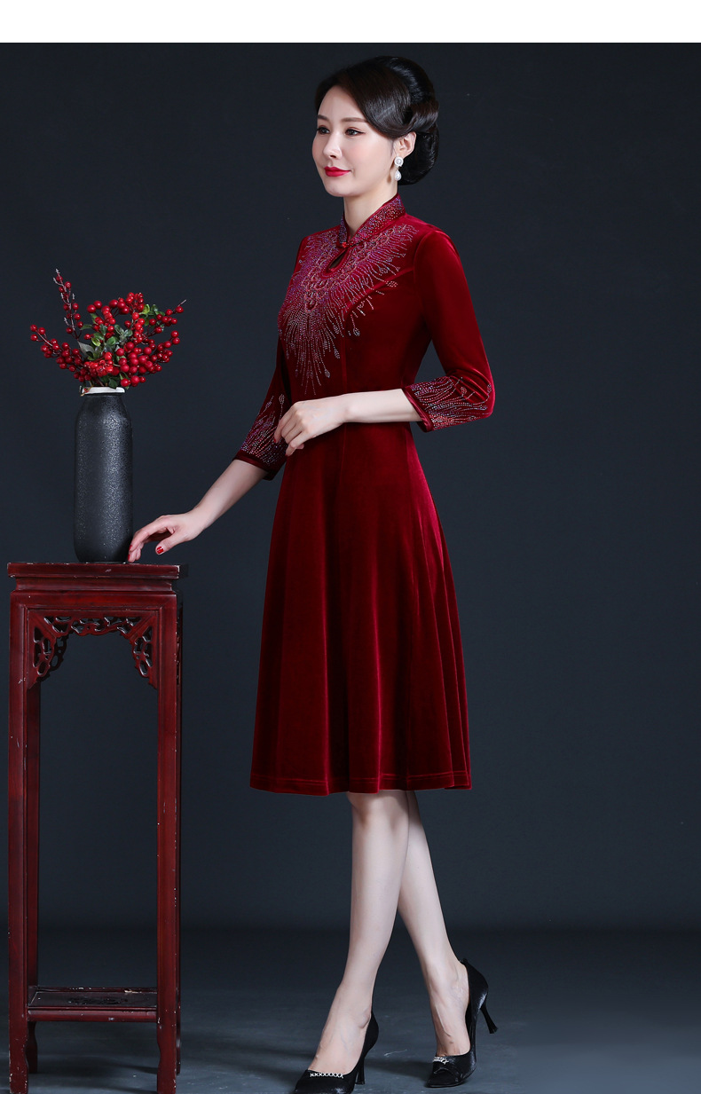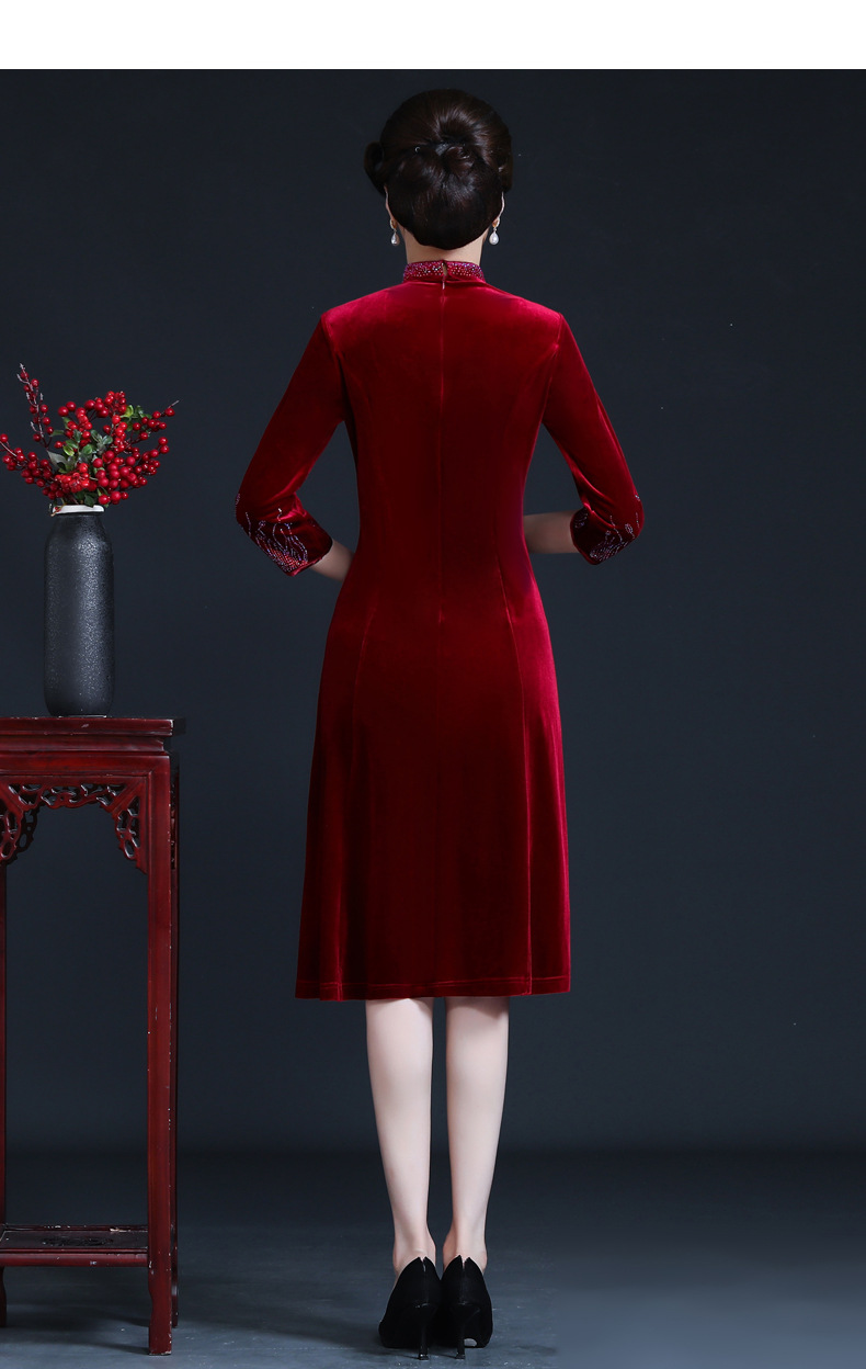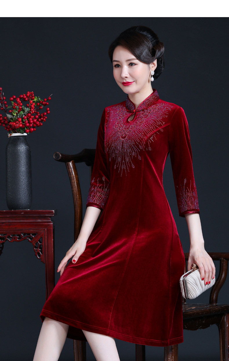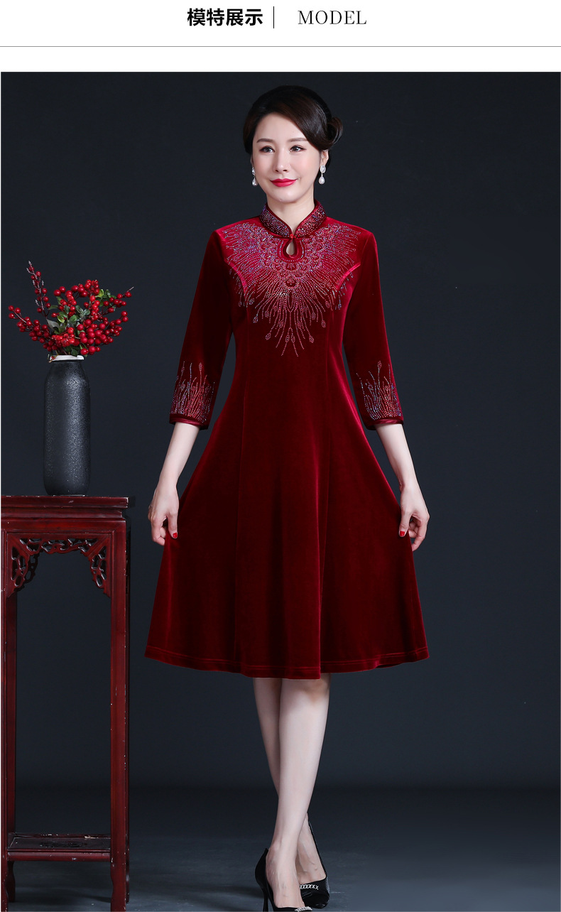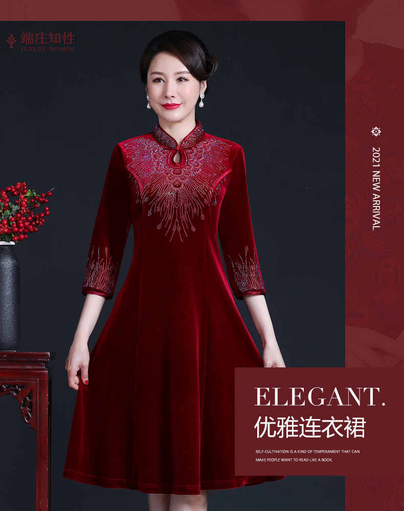 上海旗袍厂JC-JY-211新款金丝绒复古妈妈装旗袍婚礼婚宴旗袍七分袖连衣裙妈妈装秋