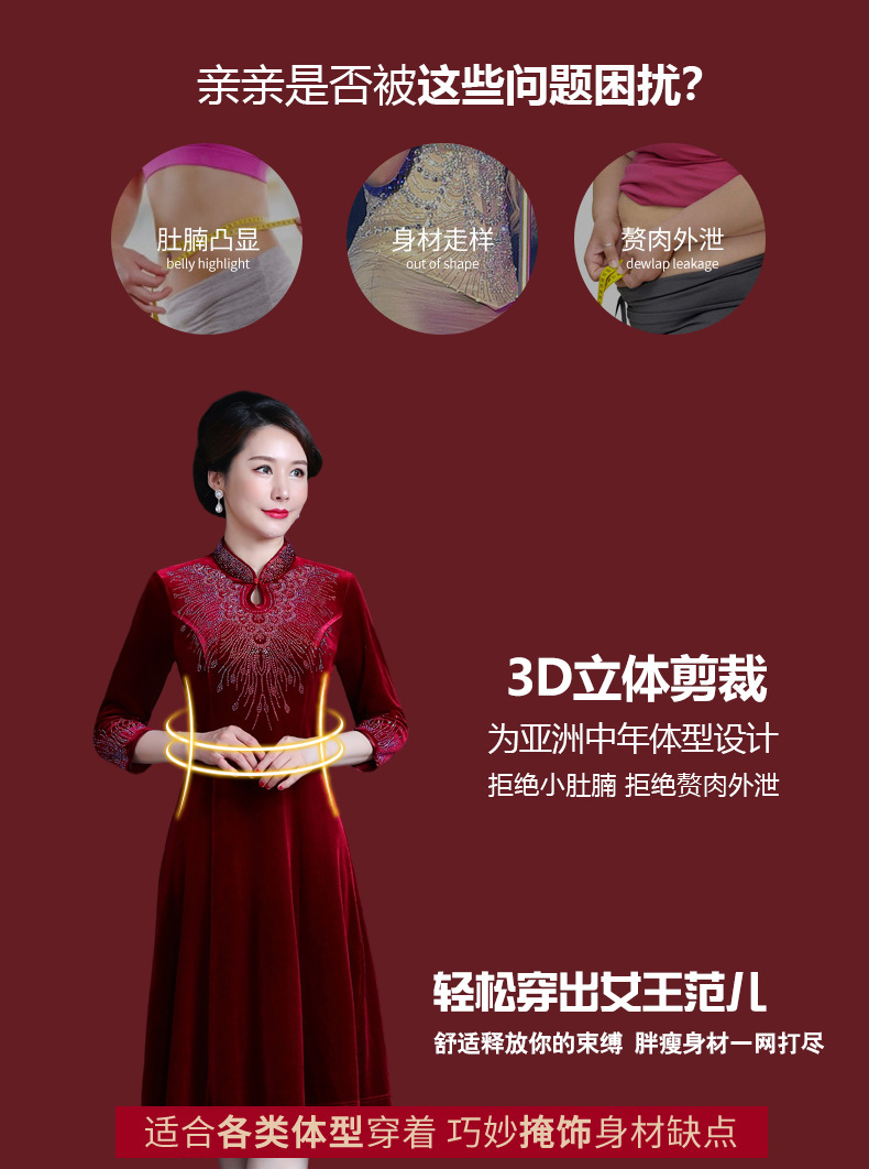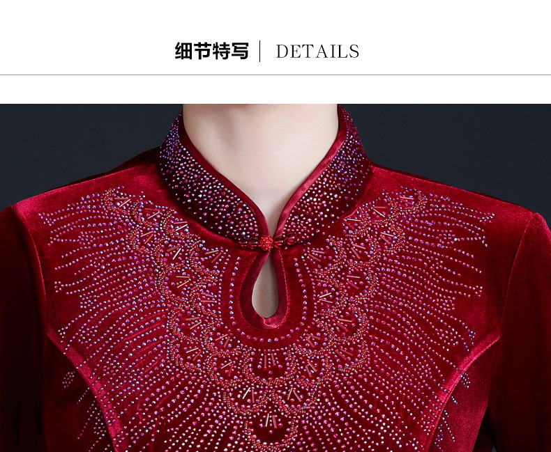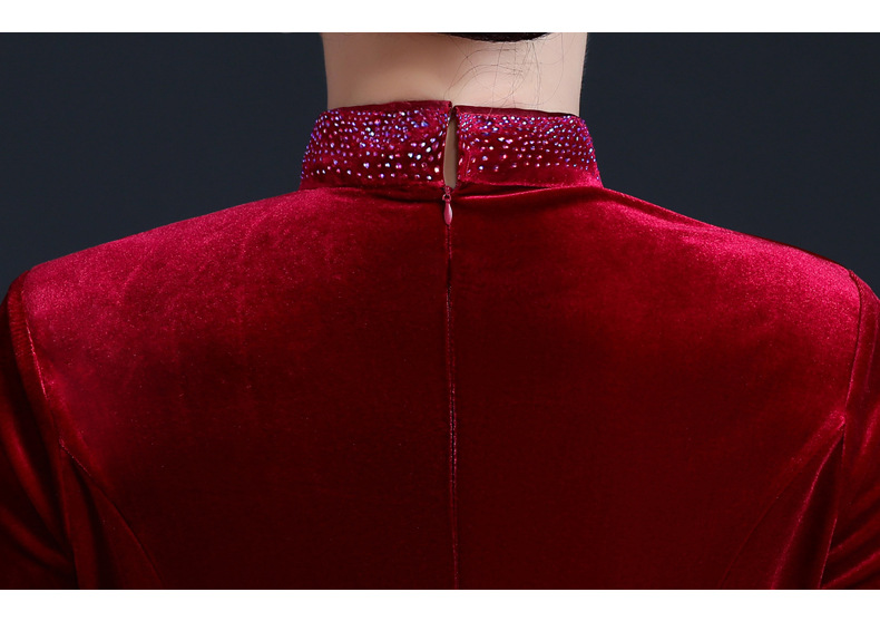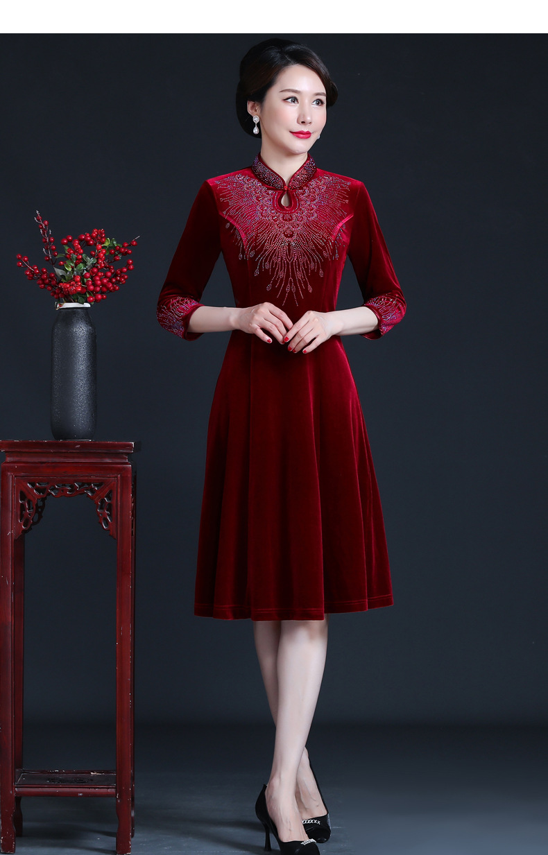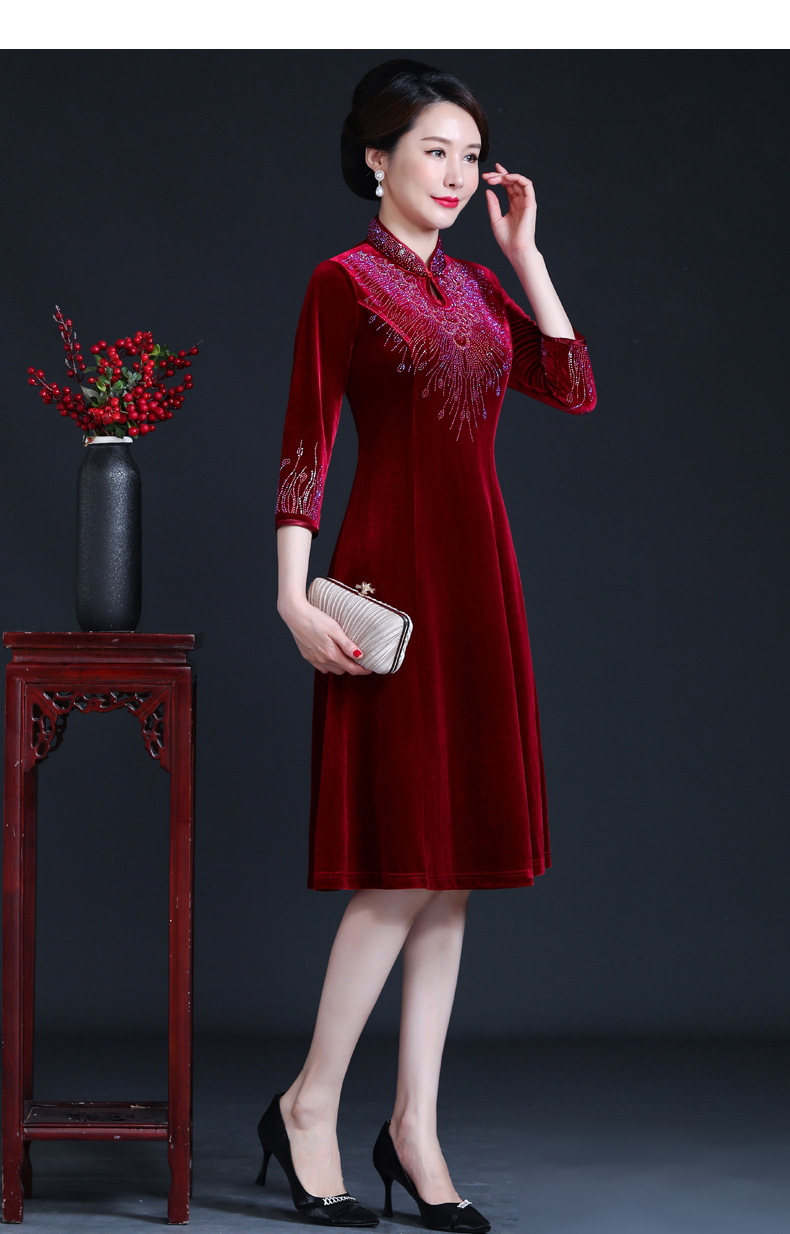 上海旗袍厂JC-JY-211新款金丝绒复古妈妈装旗袍婚礼婚宴旗袍七分袖连衣裙妈妈装秋