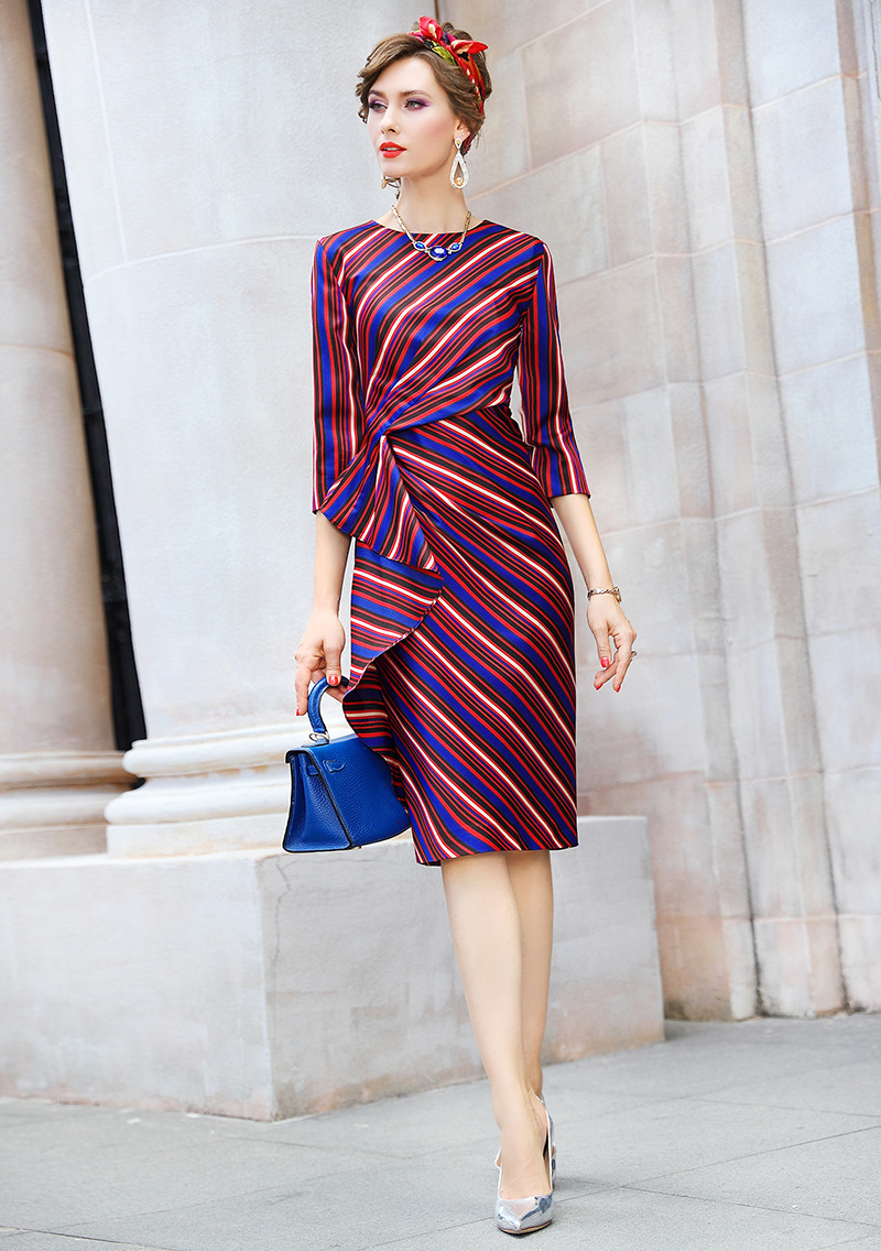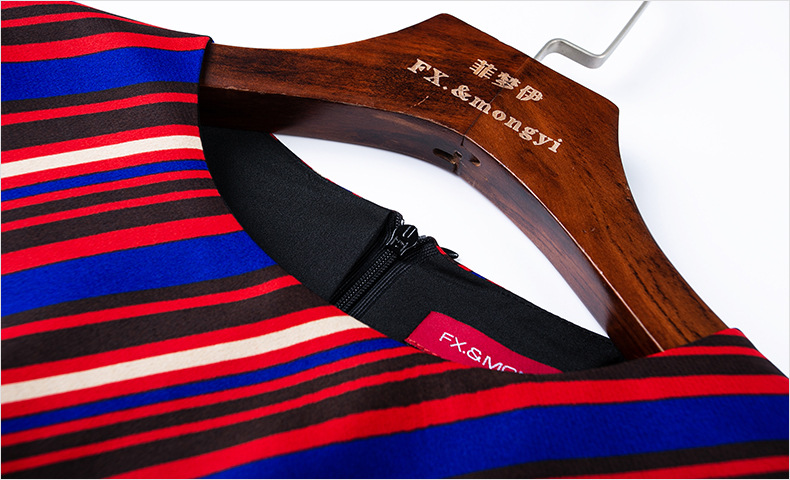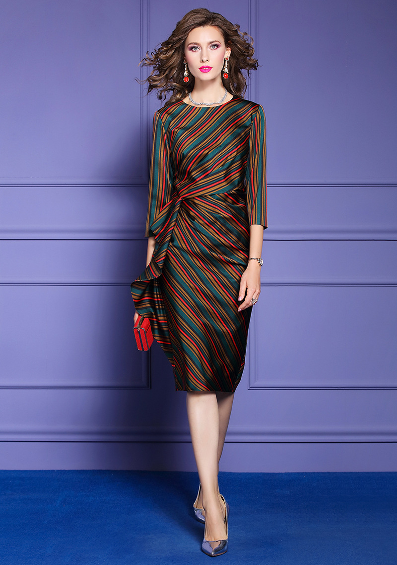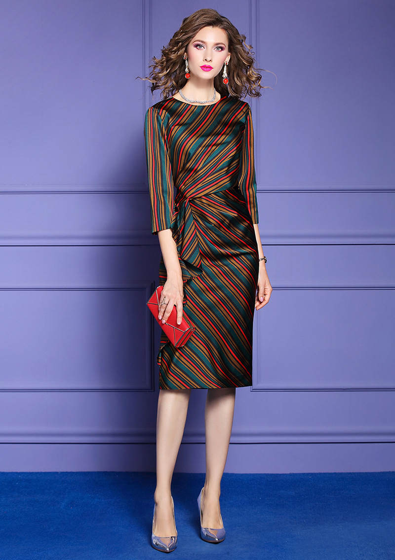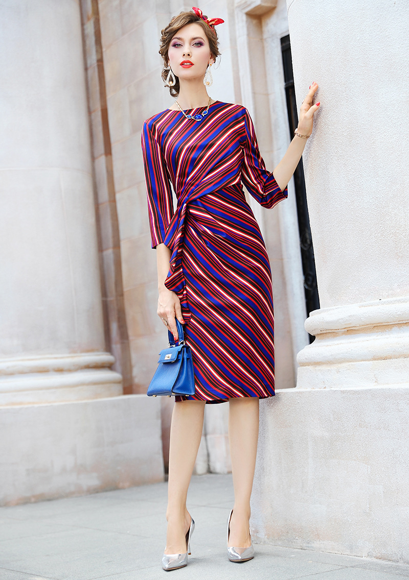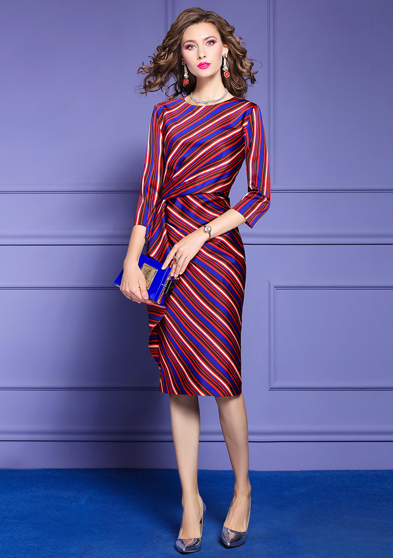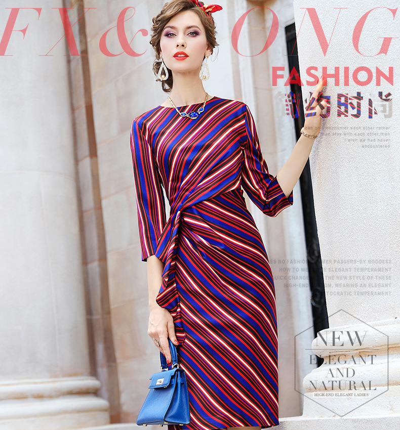 FMY-33498新款时尚名媛气质褶皱收腰圆领条纹连衣裙