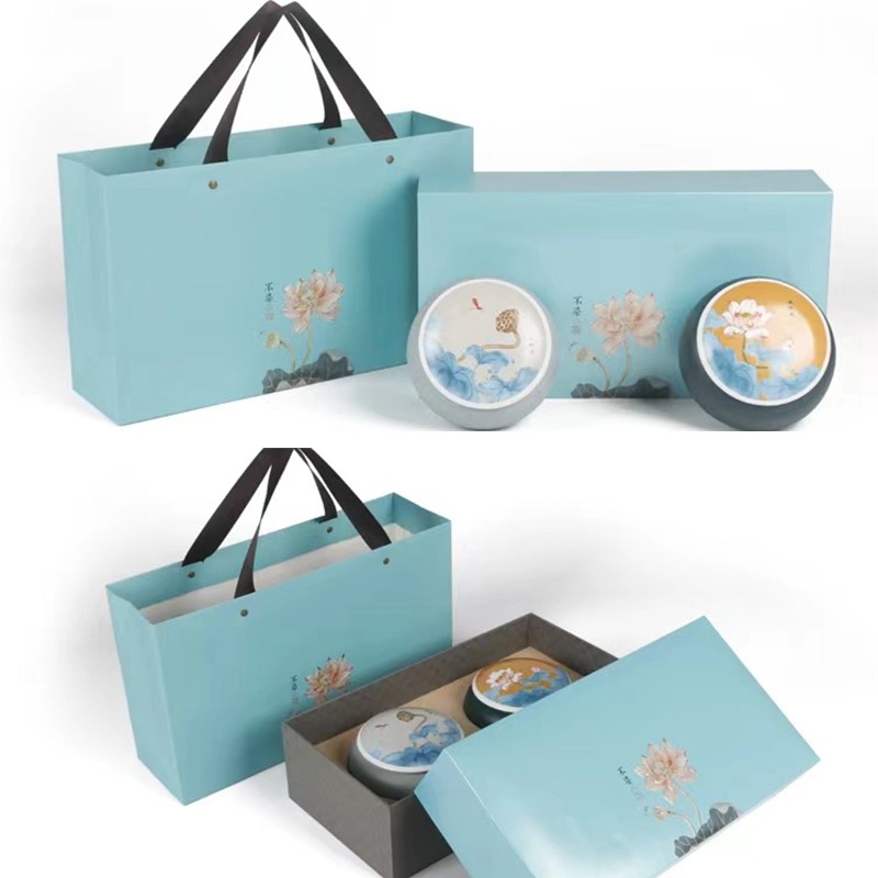 礼盒图案典雅,内里有安全设计保护茶器,盒体配色淡雅,搭配同款手提袋。