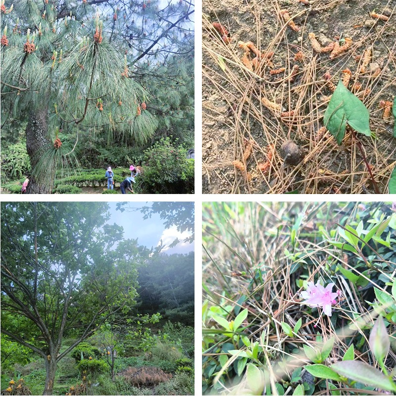 他指着茶园四周的松树说:“松花会飘落到茶树周围,天然营养,哈哈哈~”