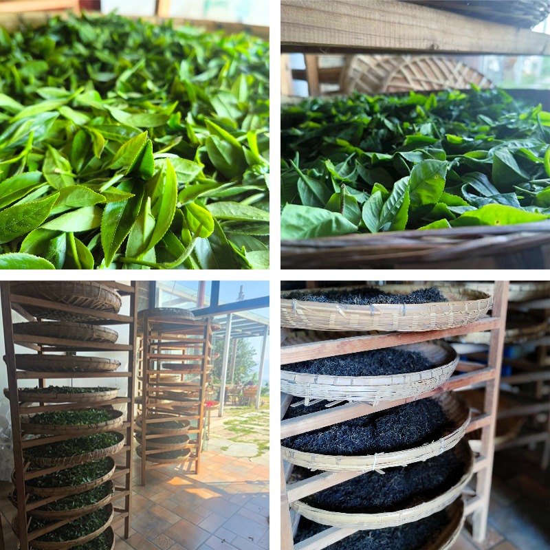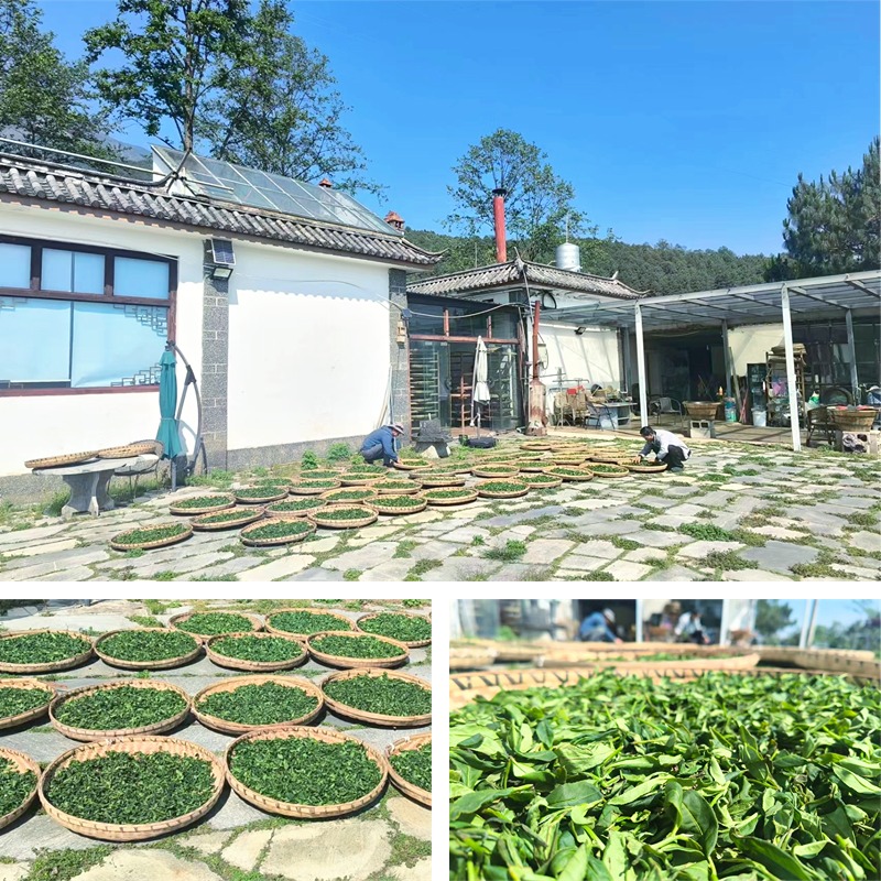 从日出到日落,新鲜采摘的茶叶在高原暖阳的炙烤下,叶色转为暗绿,表面光泽消失,鲜叶的青草气减退,透出萎凋叶特有的自然清香。