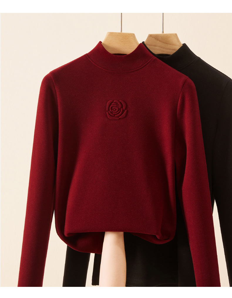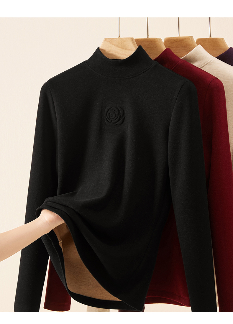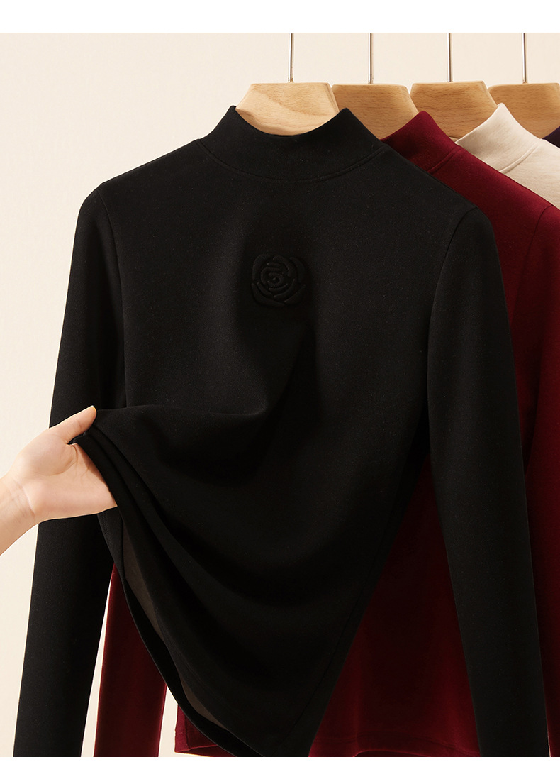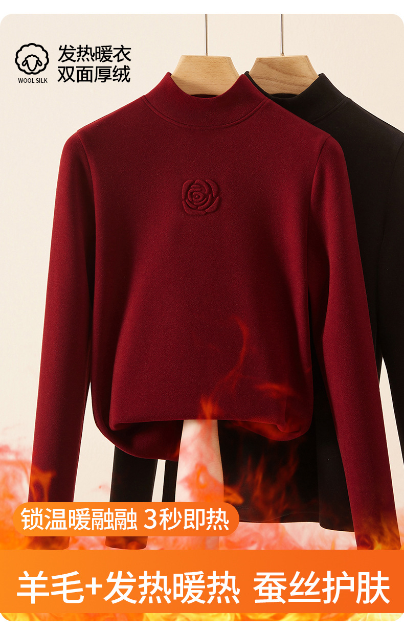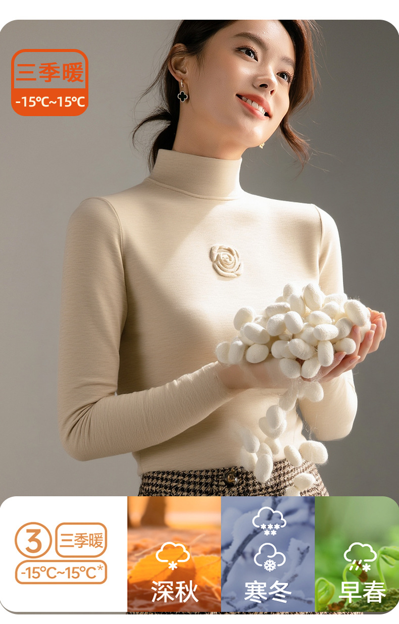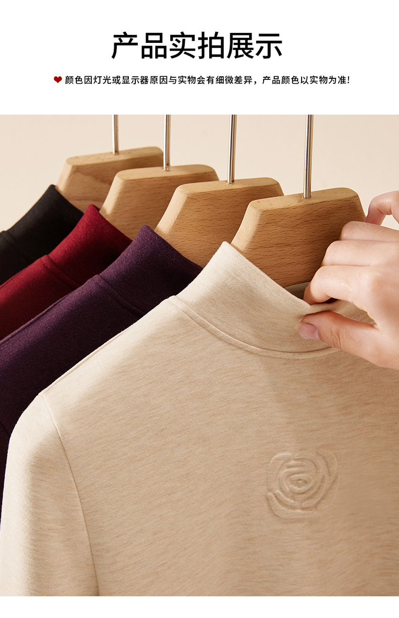 丁摩 新款玫瑰花打底衫女秋冬内搭含羊毛蚕丝加绒加厚保暖中领上衣5ZF-976