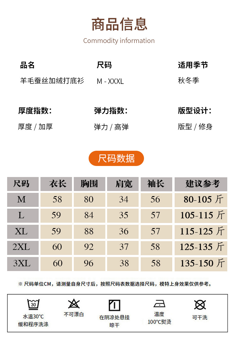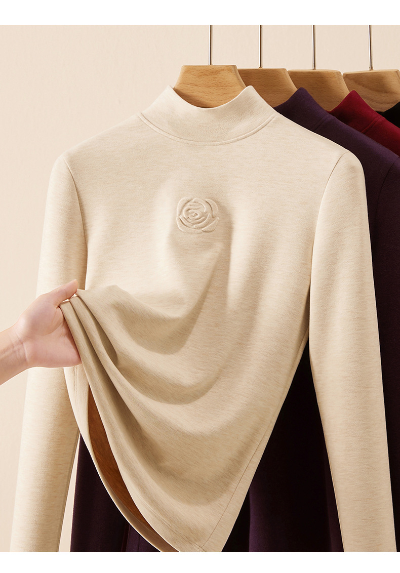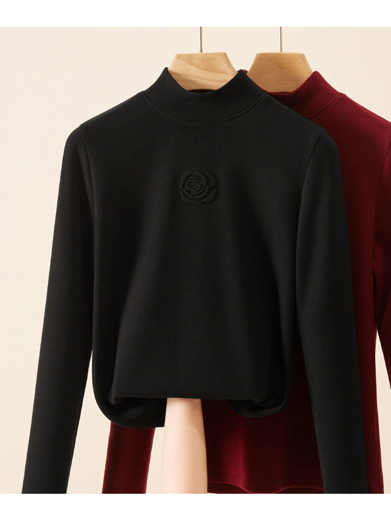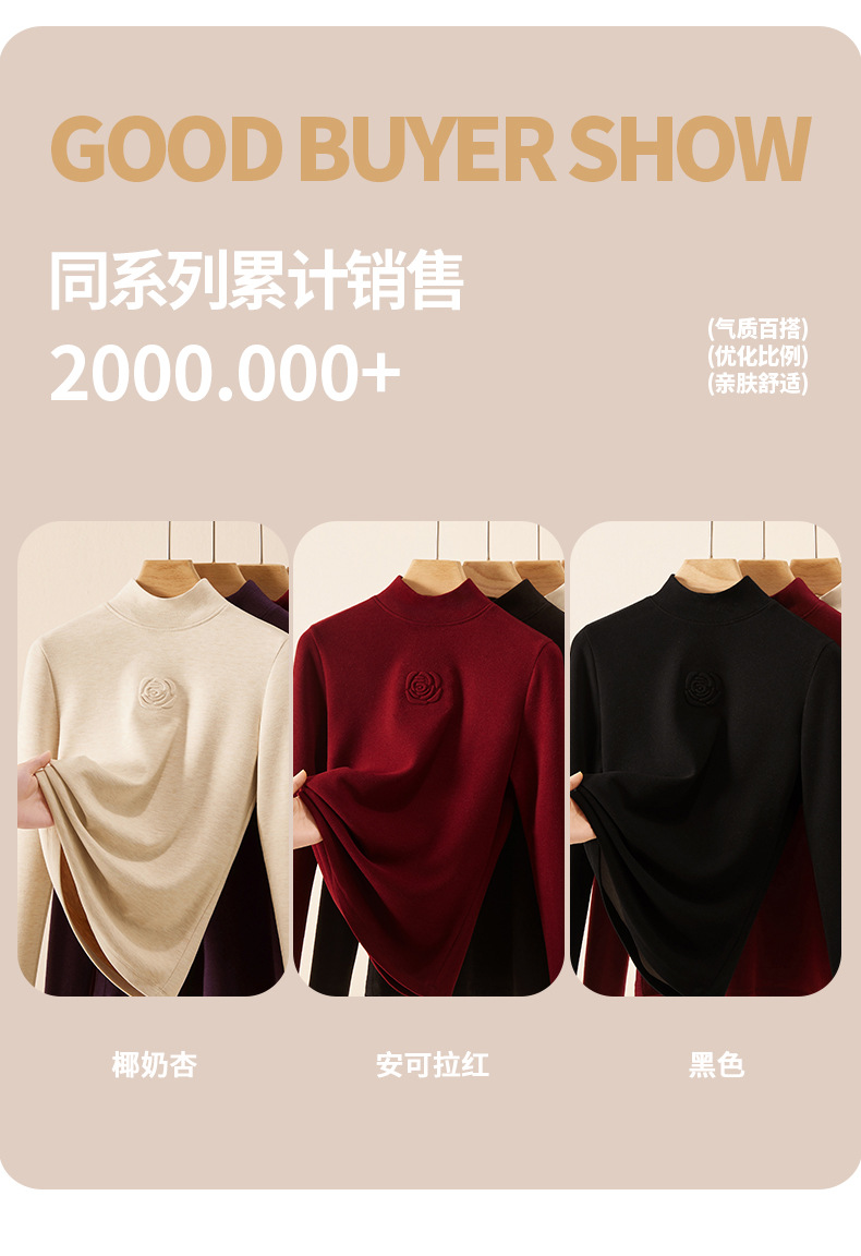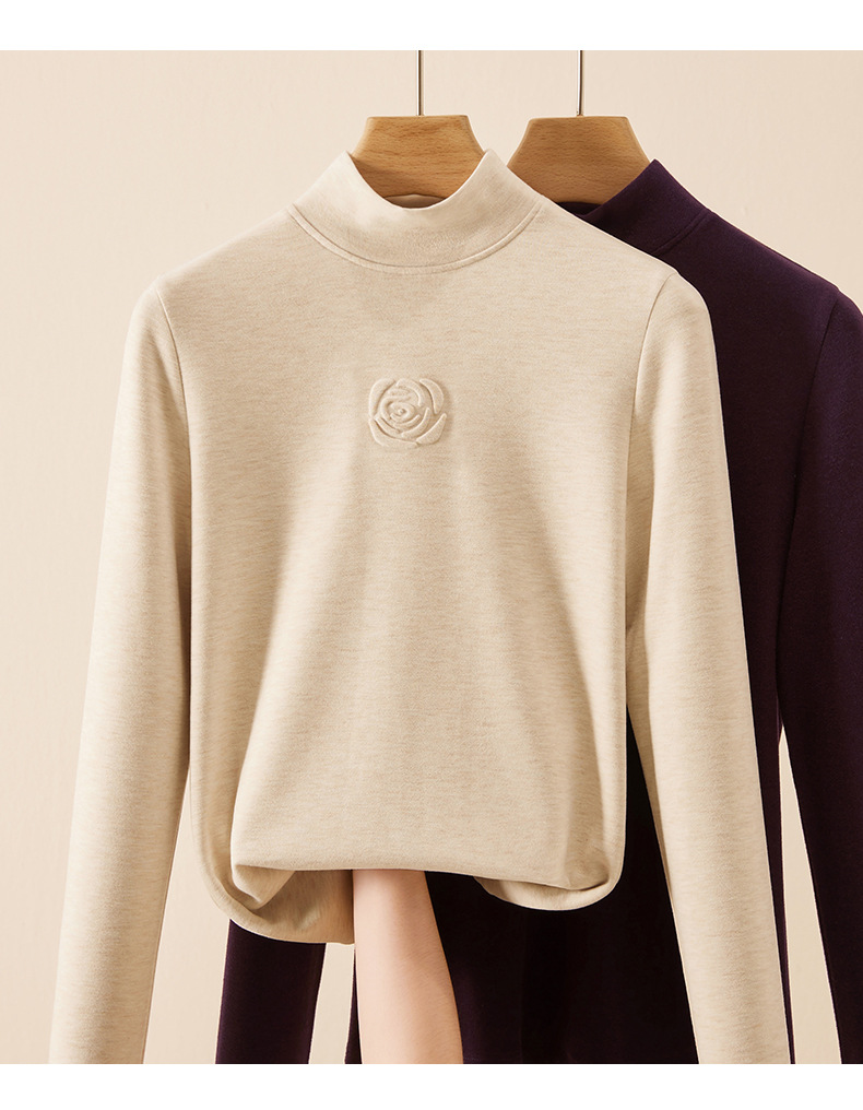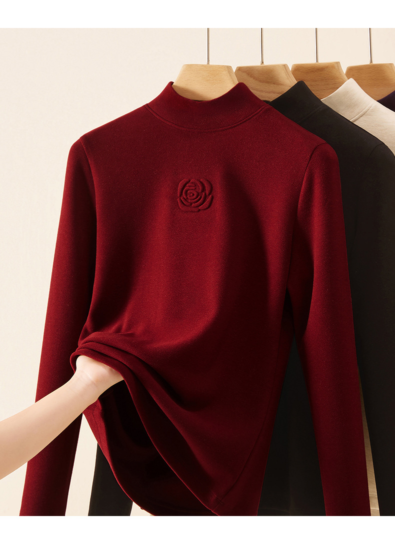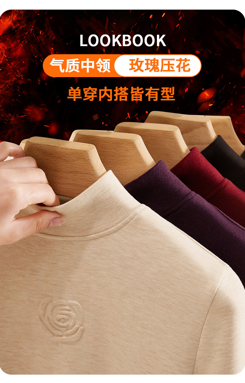 丁摩 新款玫瑰花打底衫女秋冬内搭含羊毛蚕丝加绒加厚保暖中领上衣5ZF-976