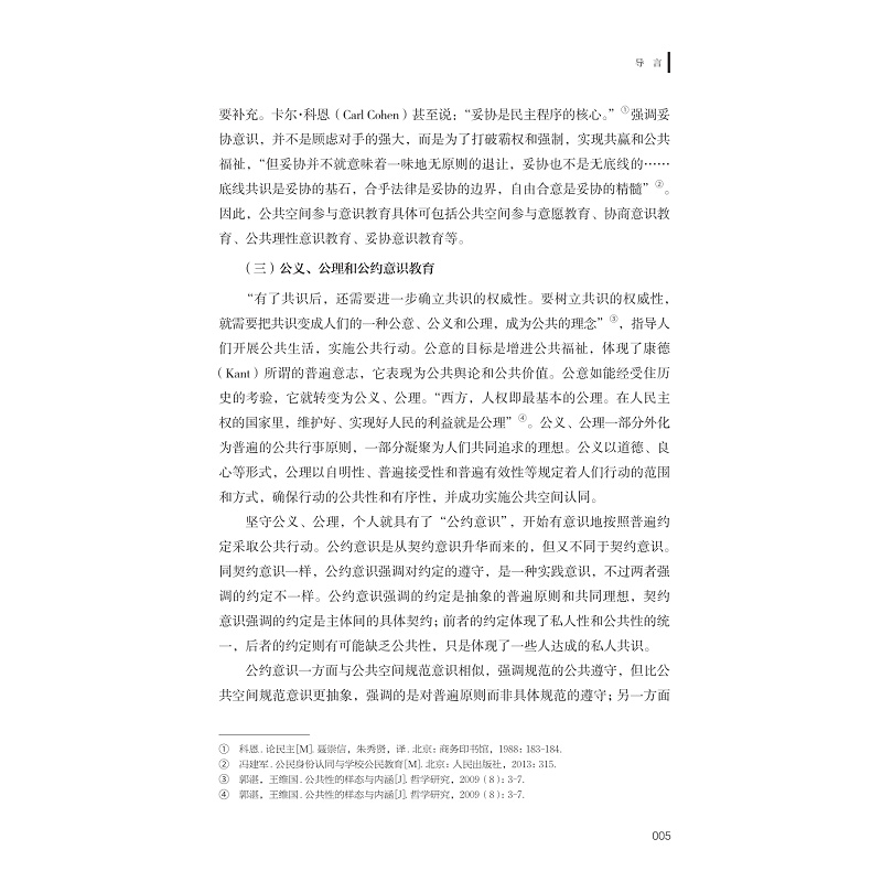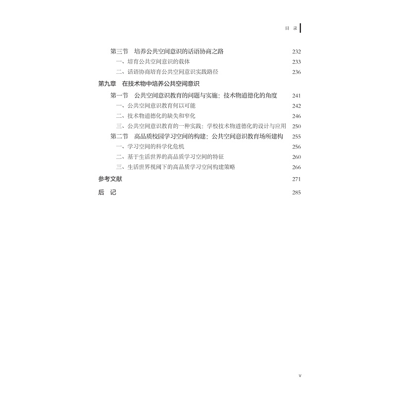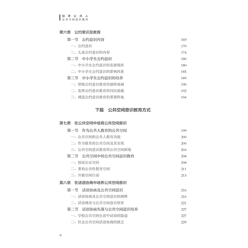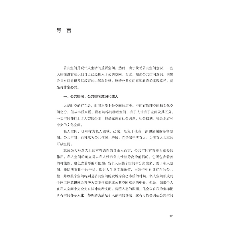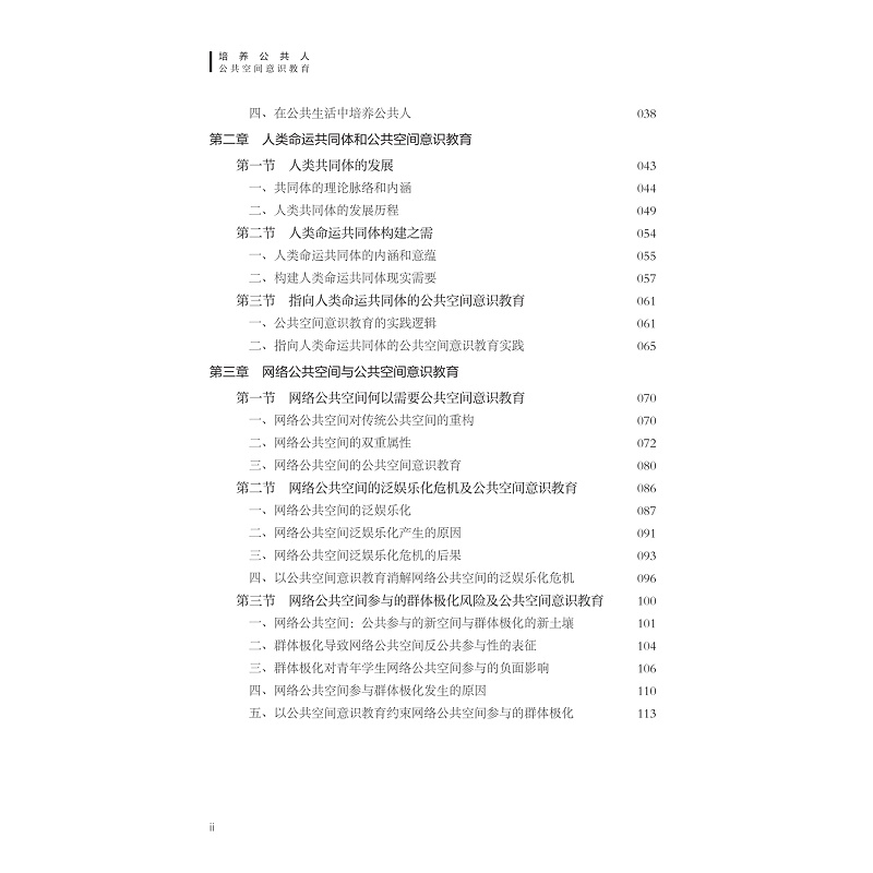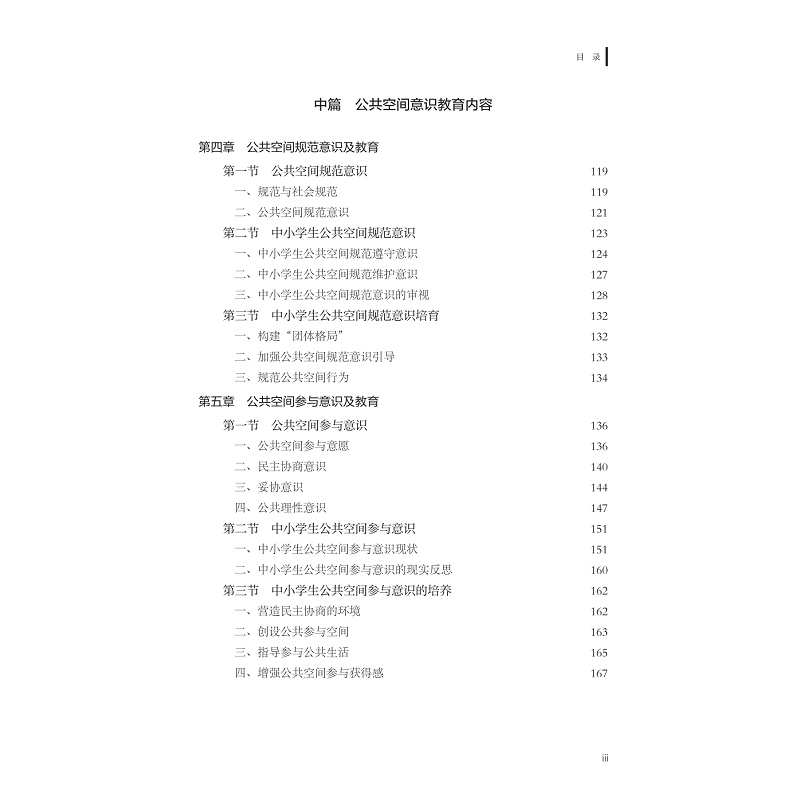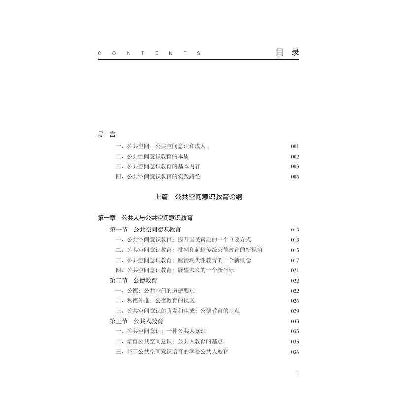公共空间意识是公共空间和个人之间产生积极互动和影响的桥梁和中介,是个体对于自己在公共空间中的地位,应享权利和应履行义务的自觉意识,是一种公共人意识。本书共有三篇,分别为上篇、中篇和下篇,每篇三章。上篇为“时代呼唤与公共空间意识教育”,分别从国民性改造和公共人培养、人类命运共同体建构的角度和网络空间素养提升的角度论述公共空间意识教育实施的必要性和基本路径。中篇为“公共空间意识教育内容”,分别从公共空间规范意识、公共参与意识、公约意识三个方面进行阐释公共空间意识教育内容。下篇为“公共空间意识教育方式”,分别阐释了如何在公共空间中培育公共空间意识,如何在公共活动中培育公共空间意识,如何在话语协商中培育公共空间意识。