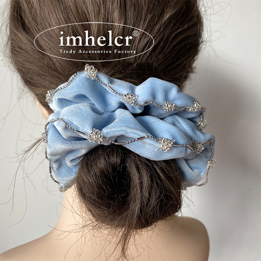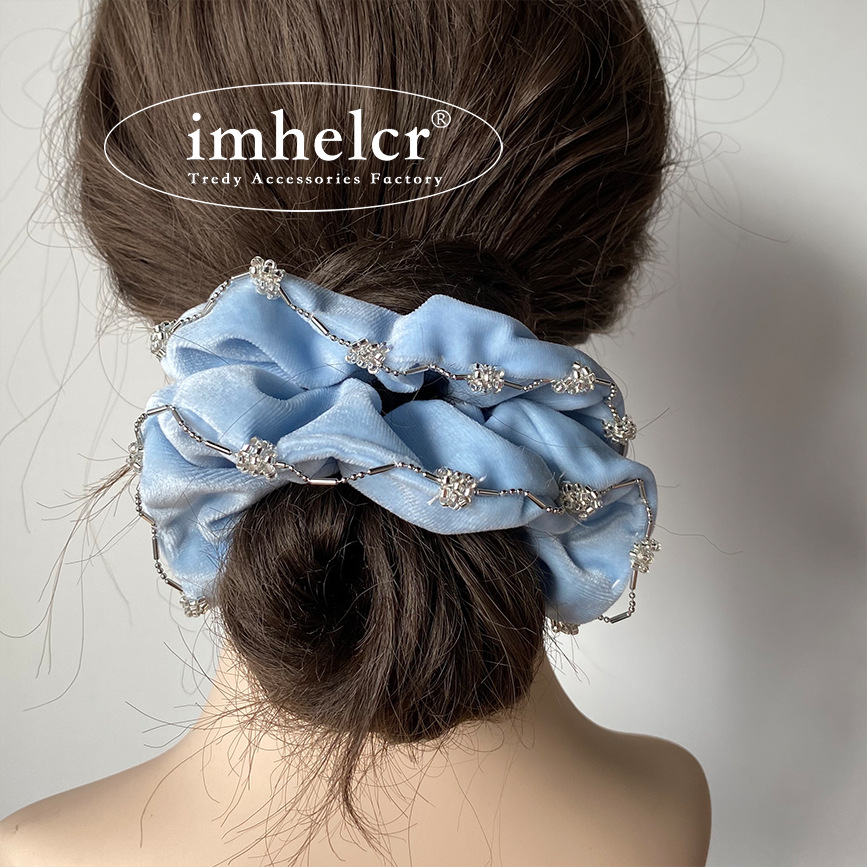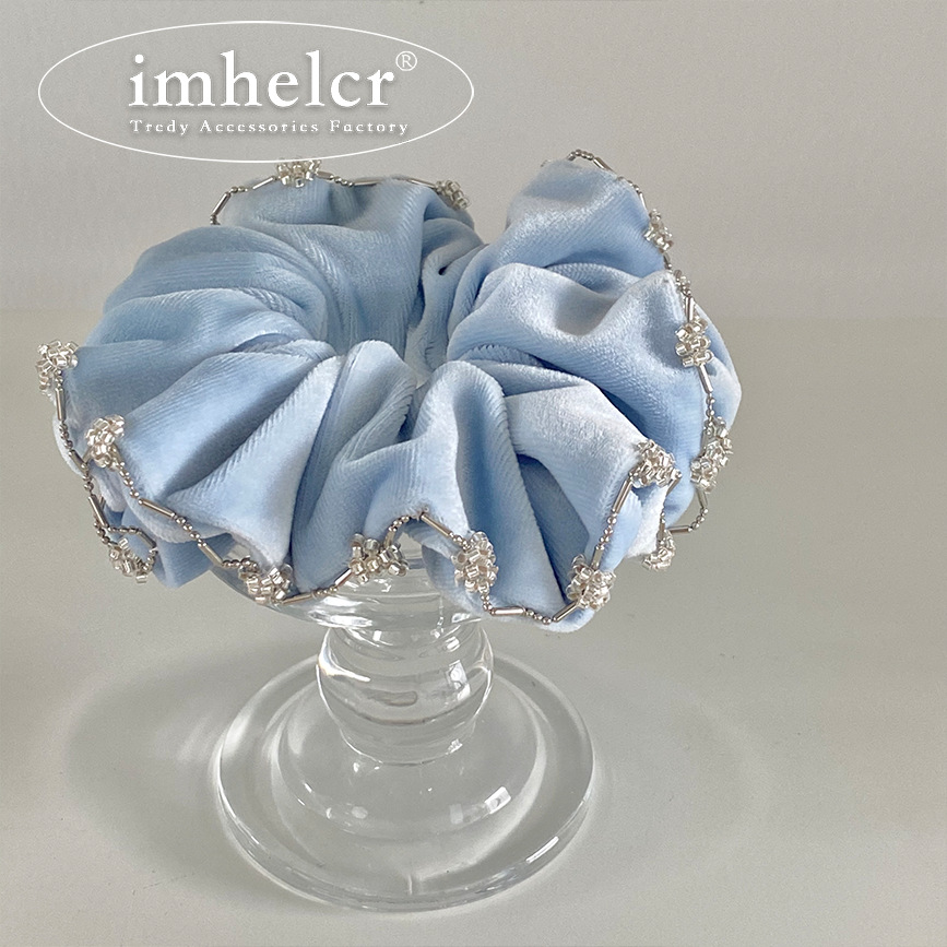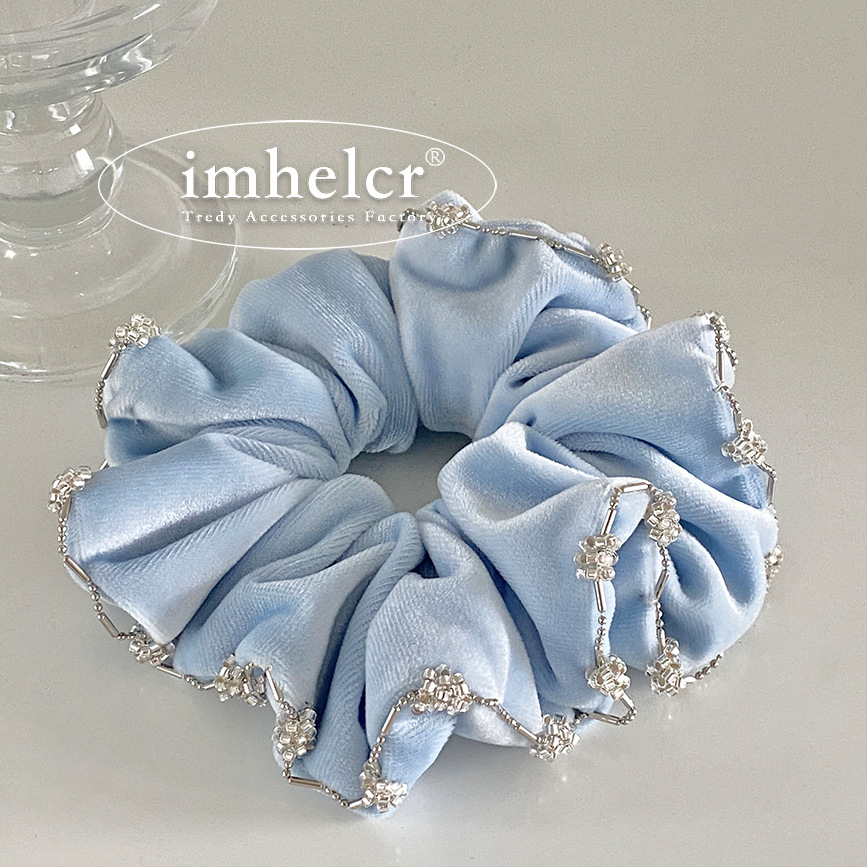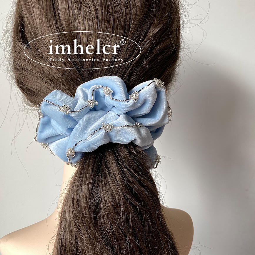 【纯净婴儿蓝水灵珠串丝绒发圈】法式淡蓝色丝绒水钻镶边大肠发圈,细腻工艺惊艳的视觉效果,新款轻奢气质温柔丸子头马尾发绳QQ