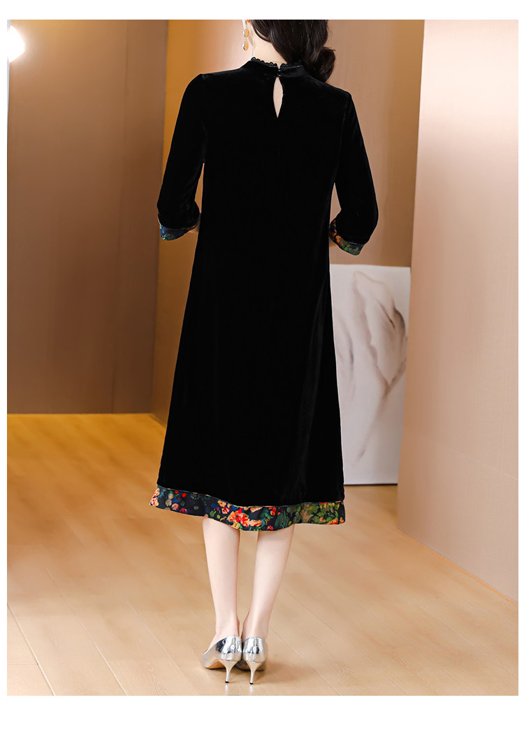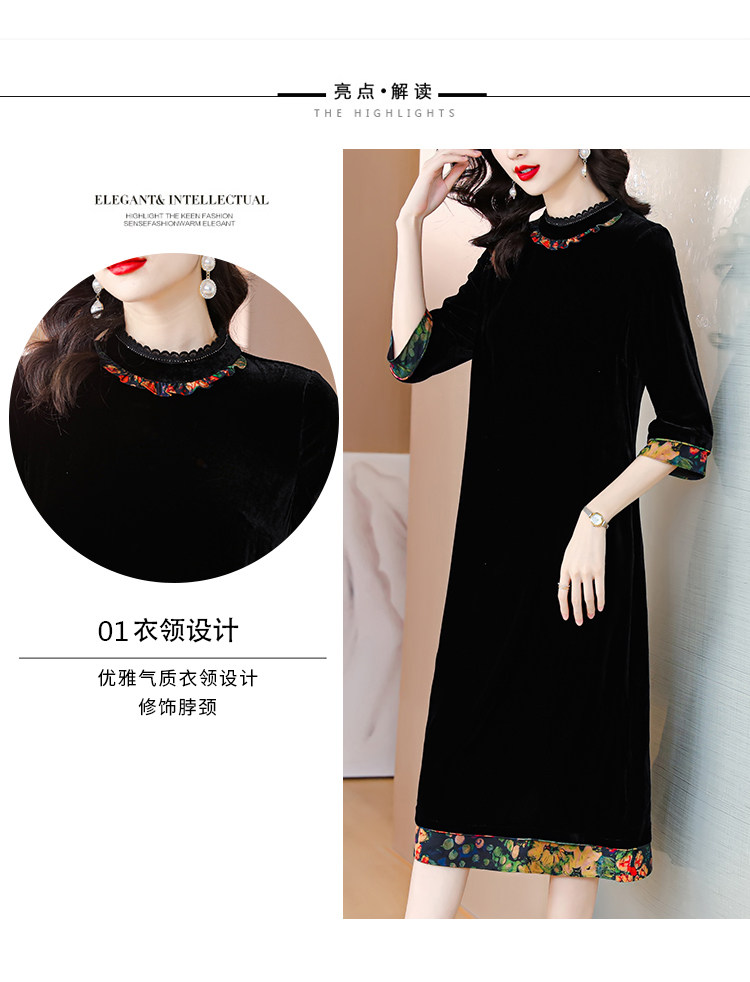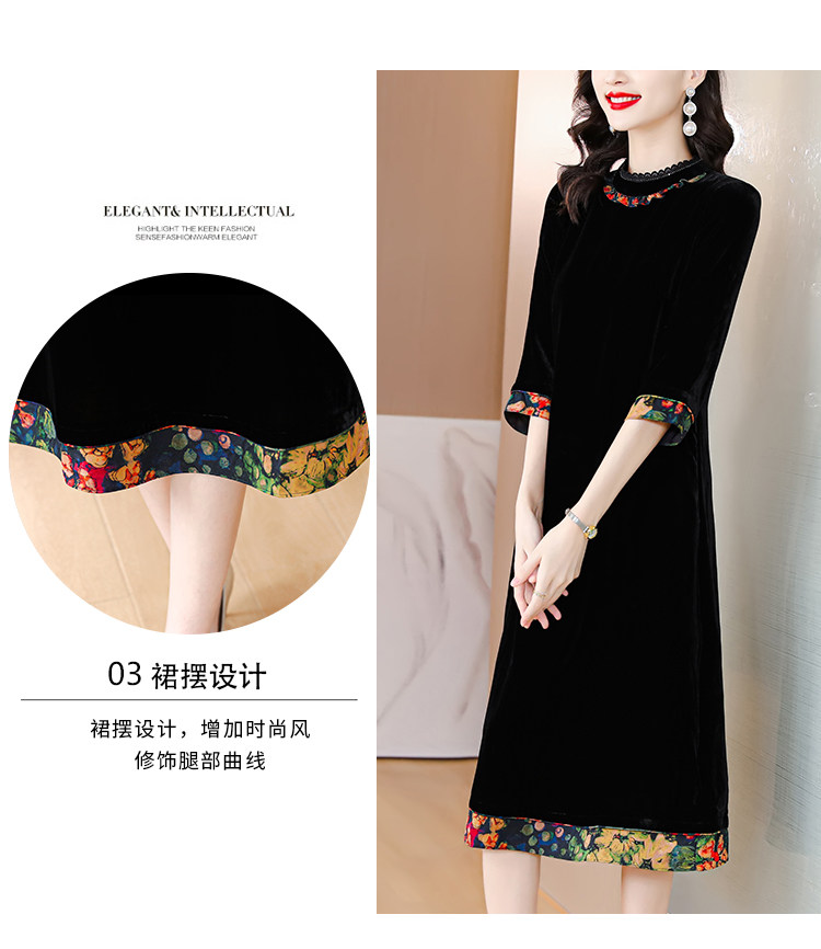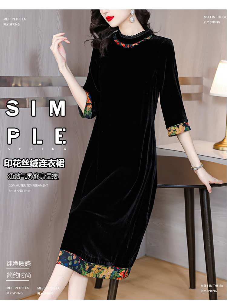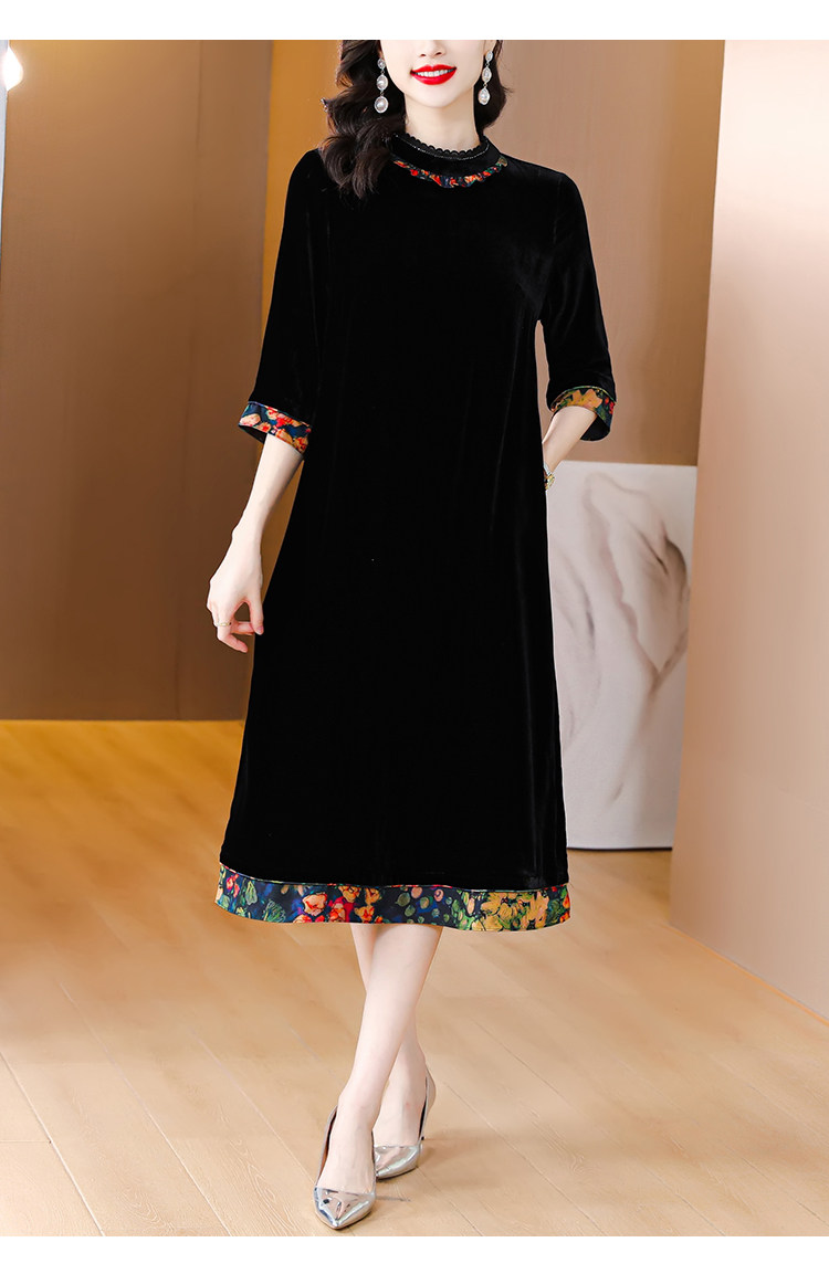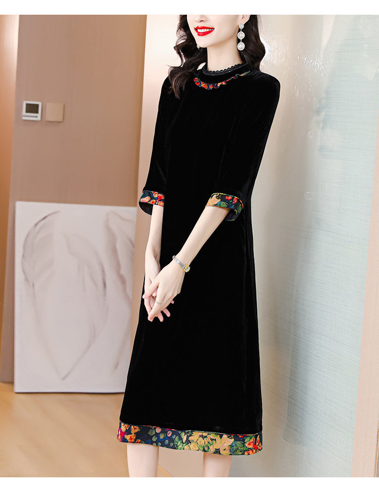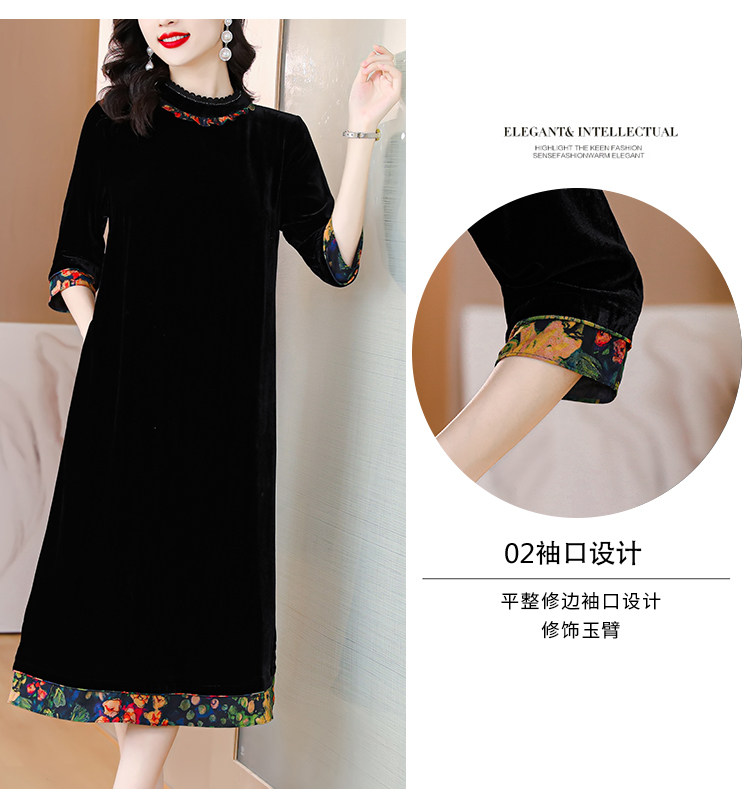 春秋新款2025贵夫人阔太太黑色金丝绒拼接连衣裙女
