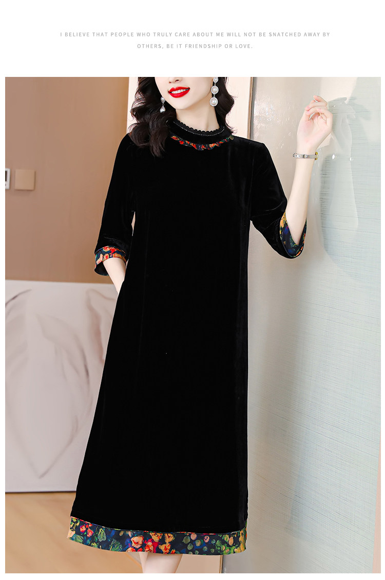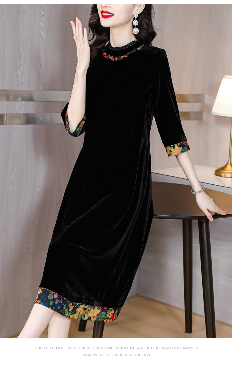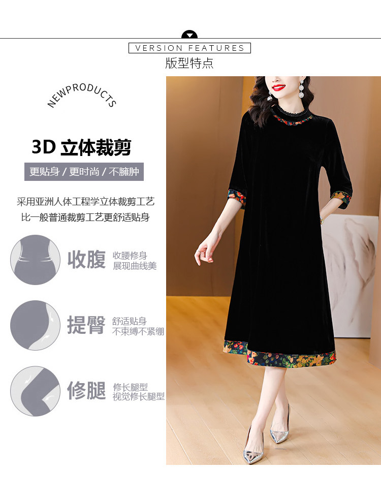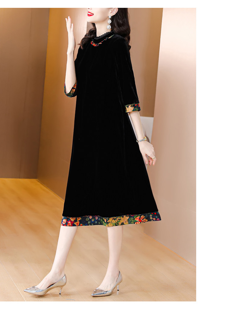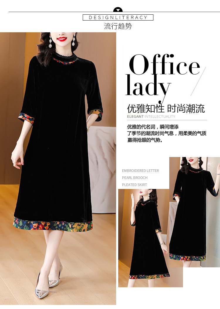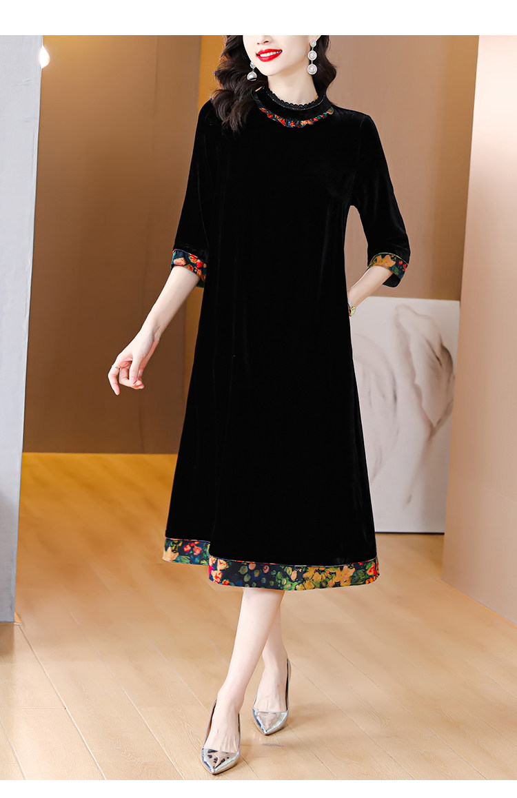 春秋新款2025贵夫人阔太太黑色金丝绒拼接连衣裙女