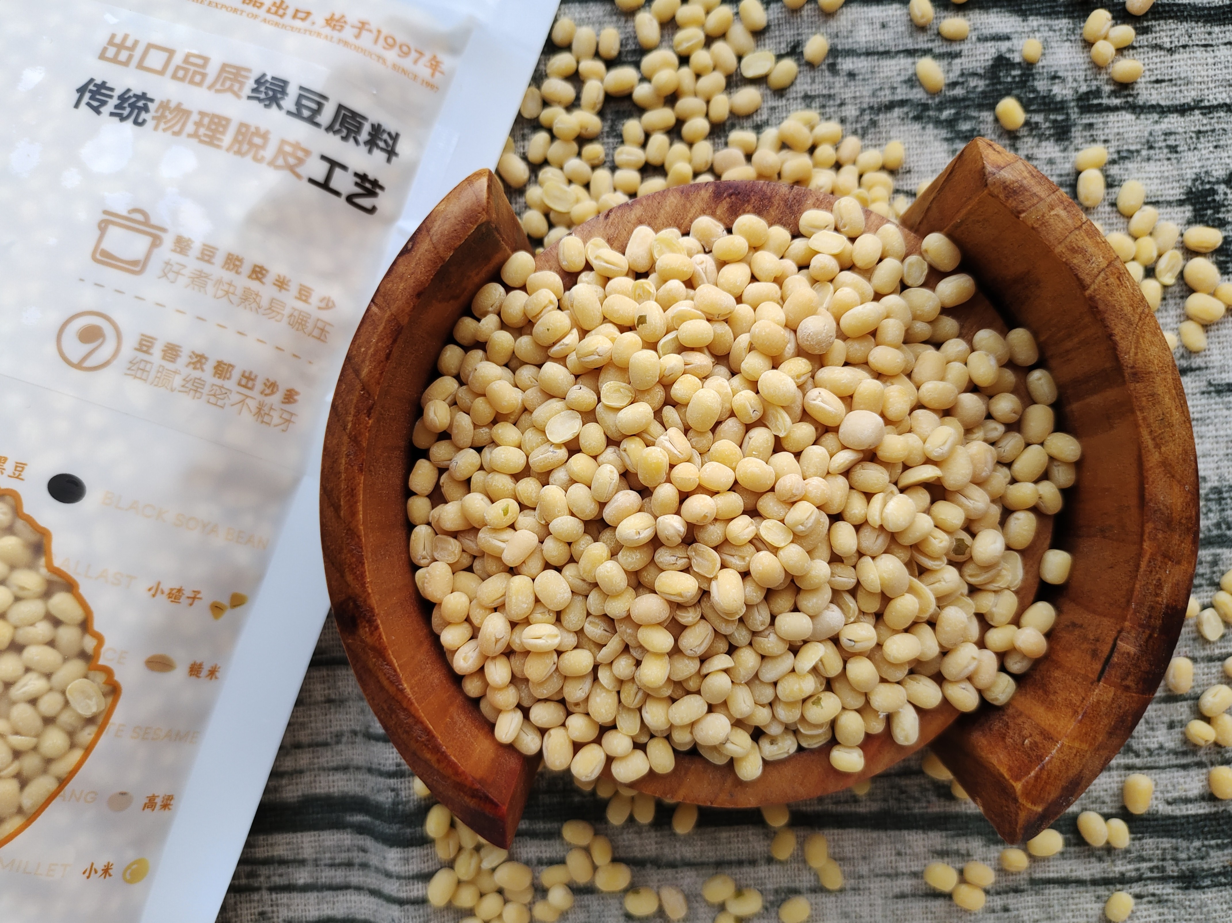 2.使用整粒绿豆传统物理方式脱皮,脱皮干净,不用二次挑选(脱皮绿豆有整粒和半粒之分,半粒是绿豆仁下脚料)