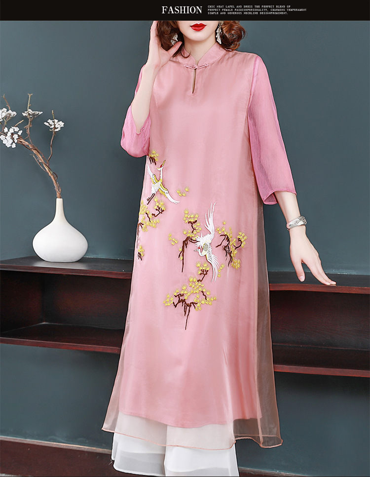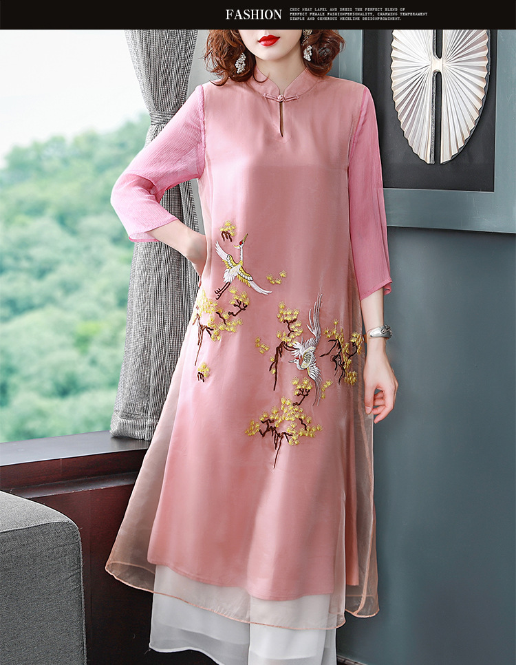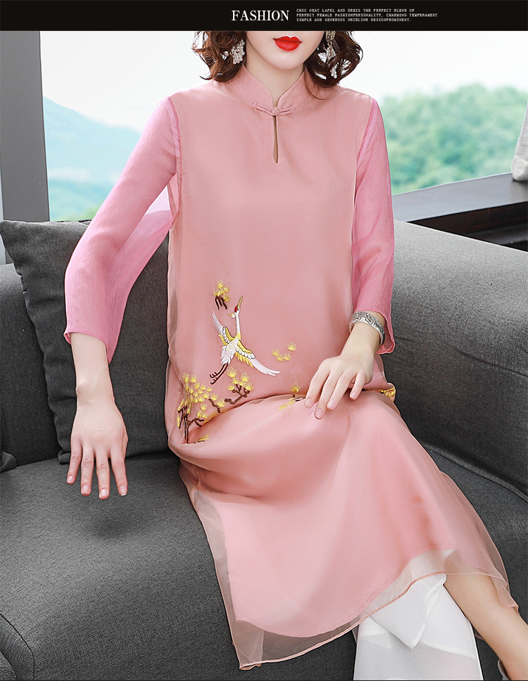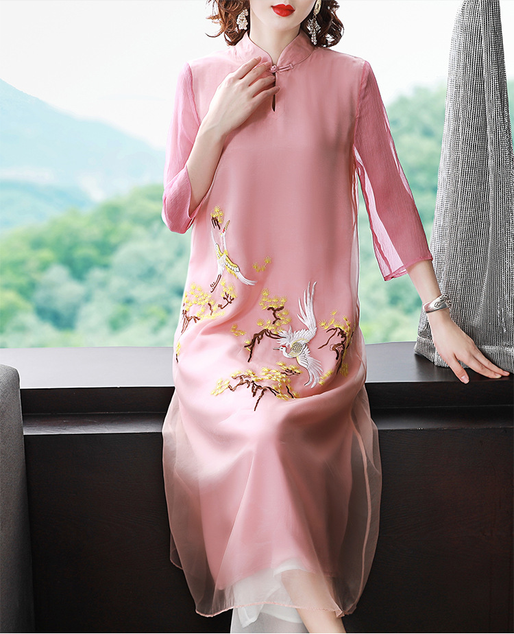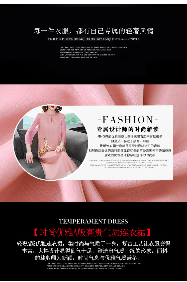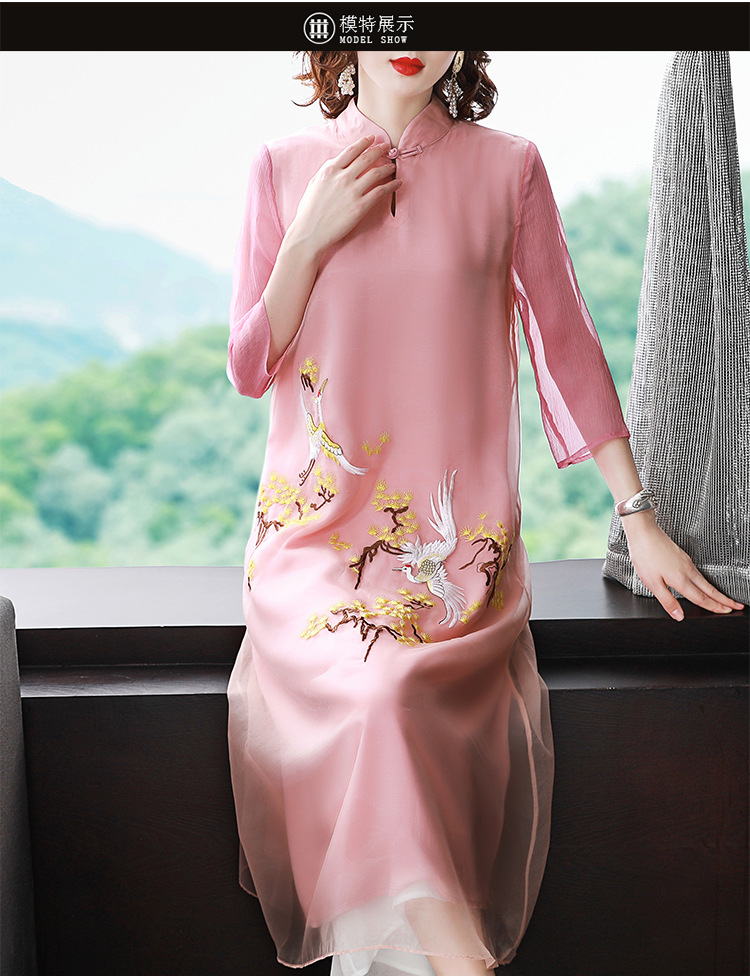SM-SM191007新款时尚改良旗袍领七分袖中长款刺绣绣花连衣裙