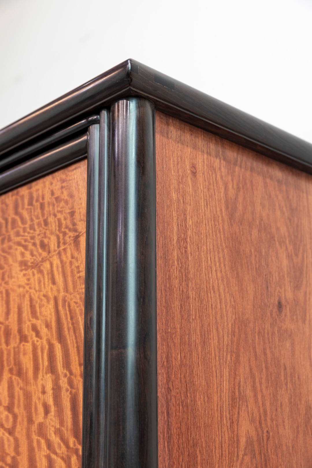 此柜整器全身光素,做撞色效果,四边框之材皆取紫光檀(东非黑黄檀),质坚材硬,暗纹迷人,嵌夹鲜丽缅甸花梨(正宗大果紫檀),赏之如姚黄魏紫。柜帽顶部平镶装板,可摆放器物,柜帽及柜门边抹混面,上下压边线,素牙头。