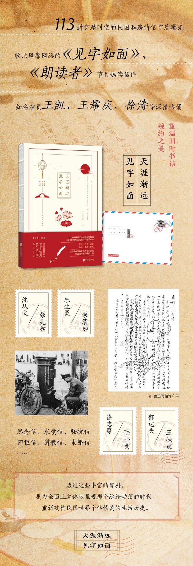 《天涯渐远,见字如面》113封穿越时空的民国私房情信首度曝光,收录风靡网络的《见字如面》、《朗读者》节目热读信件,知名演员王凯、王耀庆、徐涛等深情吟诵,重温旧时书信婉约之美!