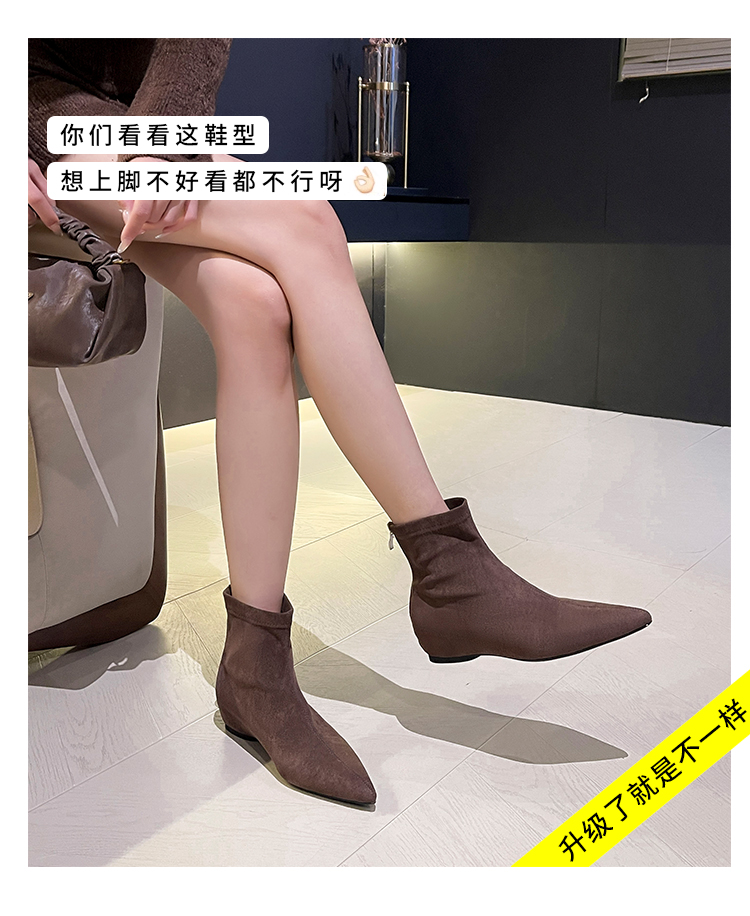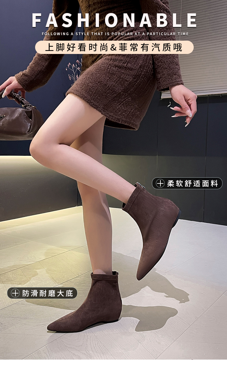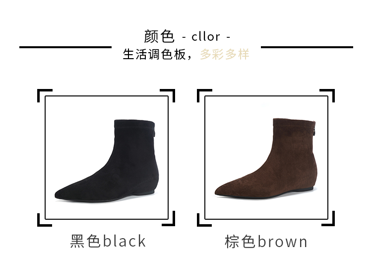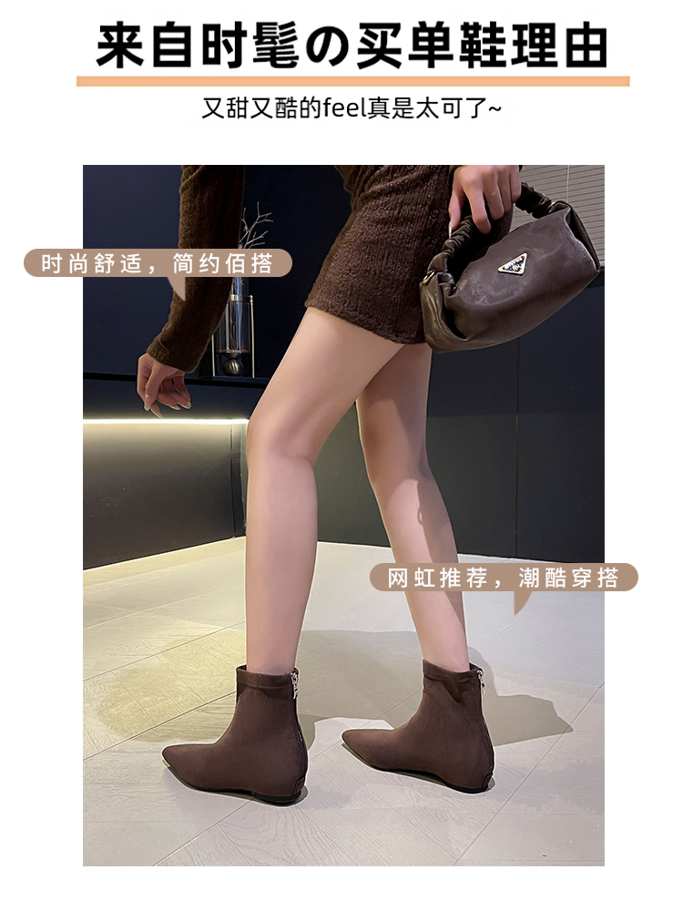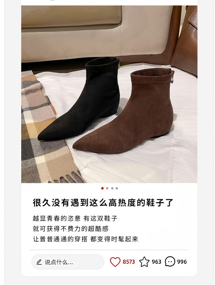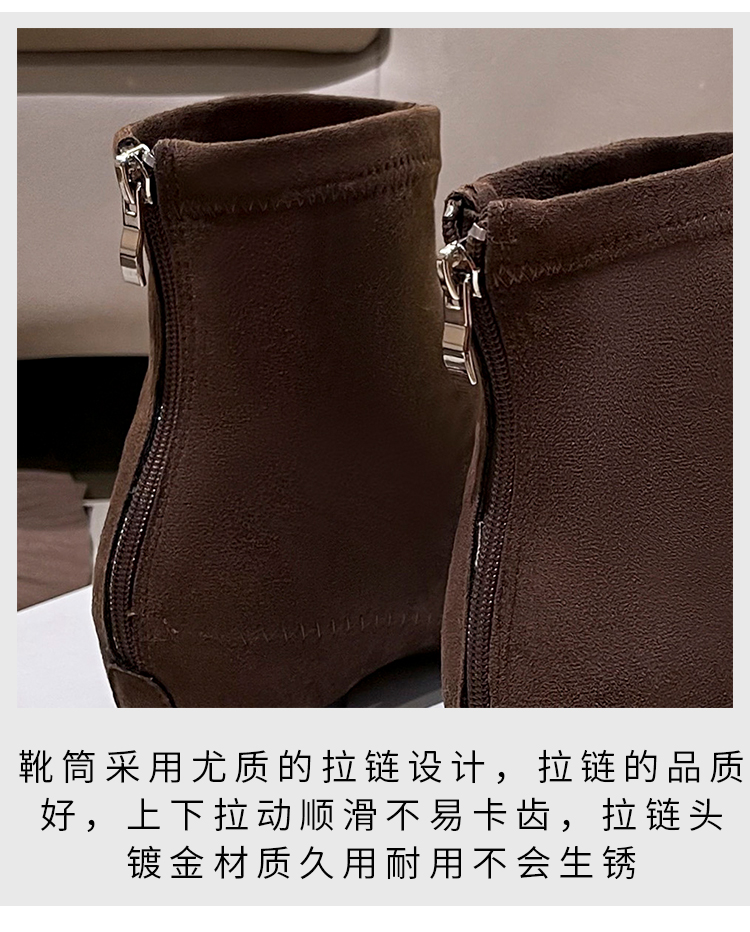 REREJOY精致小尖头绒面后拉链小短靴 尖头设计穿着性感又显瘦 羊猄绒面料舒适柔软 内增3cm显高显腿长 时尚简约百搭