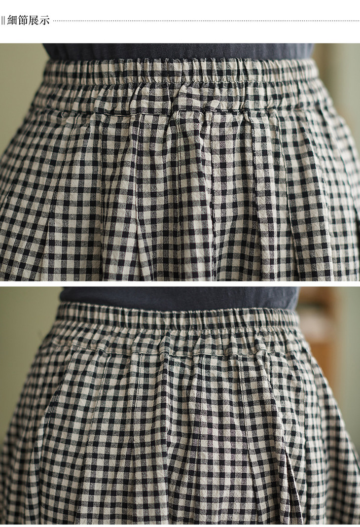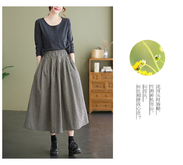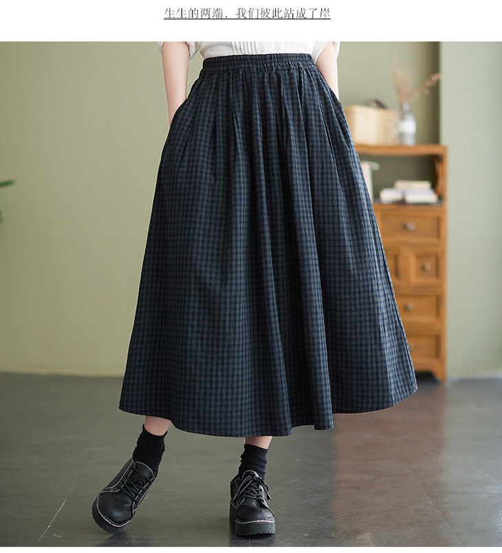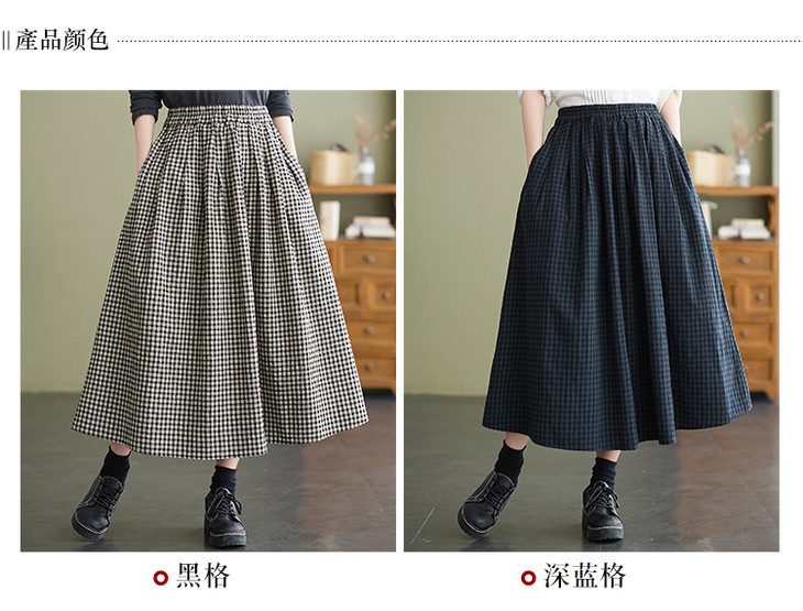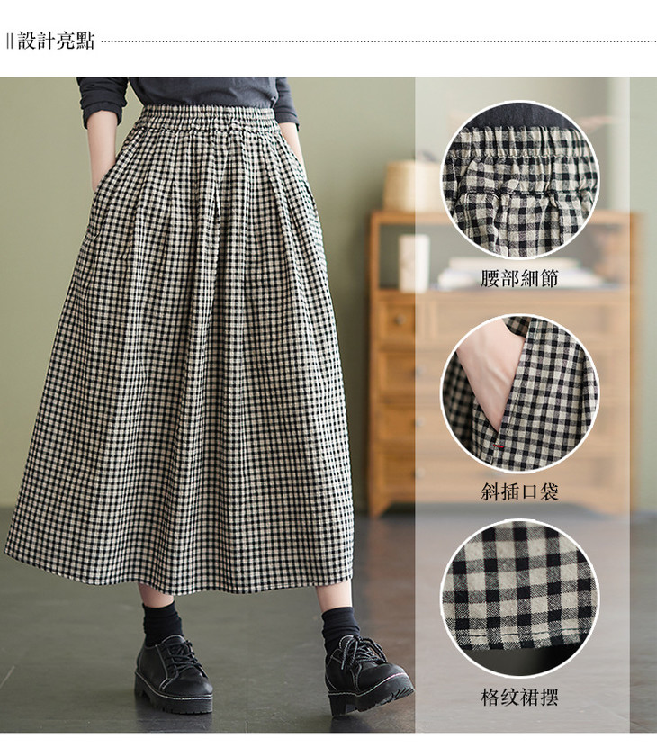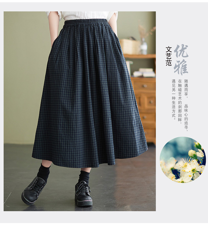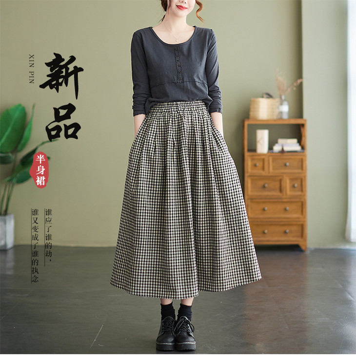 GYH 8281复古棉麻高腰格子半身裙