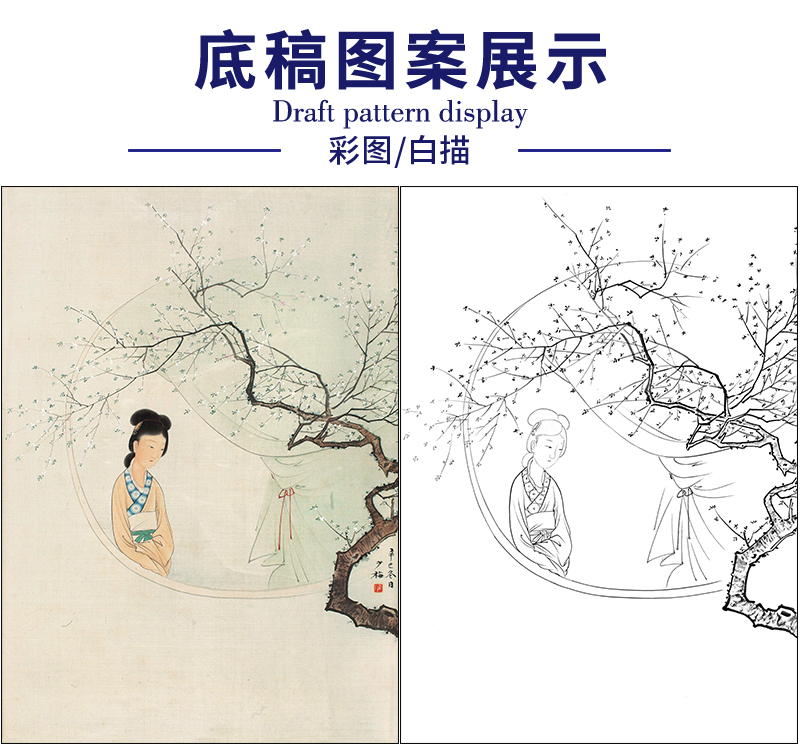陈少梅工笔画人物白描底稿《梅下仕女》临摹勾线高清打印稿SM09