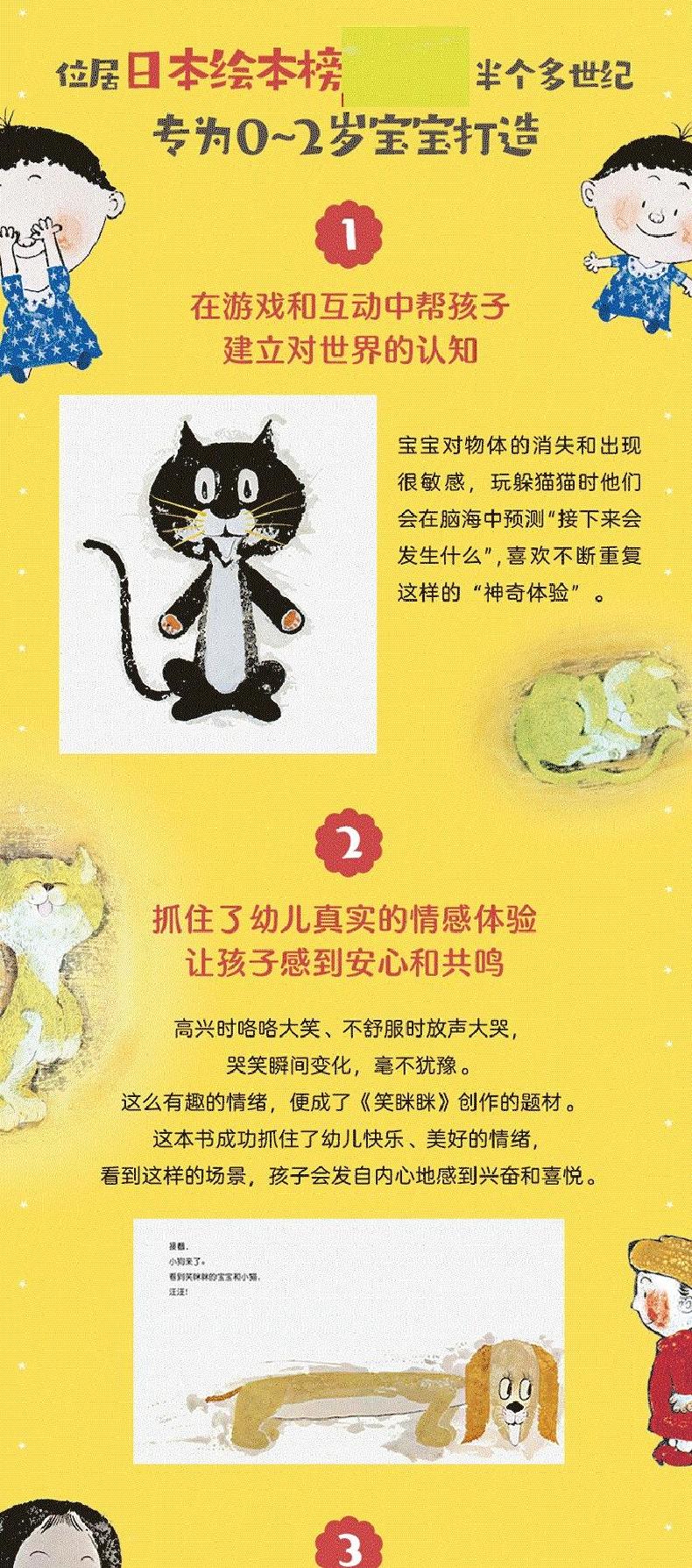 “不见了,不见了!”小手捂住眼睛,小猫不见了。翻到下一页,松开双手,“哇,小猫又出现了!”这样简单的躲猫猫游戏绘本,却成为日本婴儿绘本鼻祖,单册销量超过700万册,无数父母亲测“每个宝宝看了会笑”。这是为什么呢?对0~2岁婴儿来说,捂住眼睛,物品从眼前消失,就意味着它真的不存在了。随着翻页,小动物们一一登场,在宝宝眼前不断地消失又出现,这样充满惊喜的游戏,孩子们不管玩多少遍不会腻。