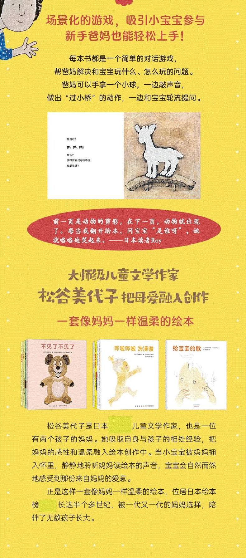 “不见了不见了”是日本绘本史·上第—套成熟的婴儿绘本,系列销量高达1700万册。作者松谷美代子是日本儿童文学作家,也是一位有两个孩子的妈妈。她吸取自身与孩子的相处经验,把妈妈感性和温柔融入绘本创作中。当小宝宝被妈妈拥入怀里,静静地聆听妈妈读绘本的声音,宝宝会自然而然地感受到那份来自妈妈爱意。正是这样一套像妈妈一样温柔的绘本,自1967年发售以来,位居日本绘本榜长达半个多世纪,被一代又一代的妈妈选择,陪伴了无数孩子长大。