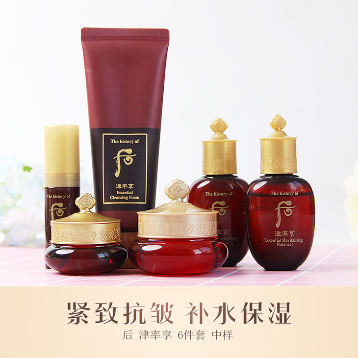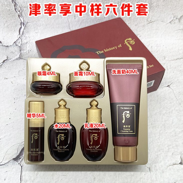 👑WHOO津率享6件中样 👍津率享系列是贵妇专享 💎独特的配方,解决肌肤各种问题 🎈有效:改善气色、调理肌肤粗糙起皮、缺水、松弛 😍给予肌肤水分和营养、提升肌肤弹性 💯适合24岁以上,肌肤干燥、粗糙、有皱纹、脸部缺乏光泽人群 【套盒包括:】洁面40ml+水20ml+乳20ml+眼霜4ml+面霜10ml+精华5ml