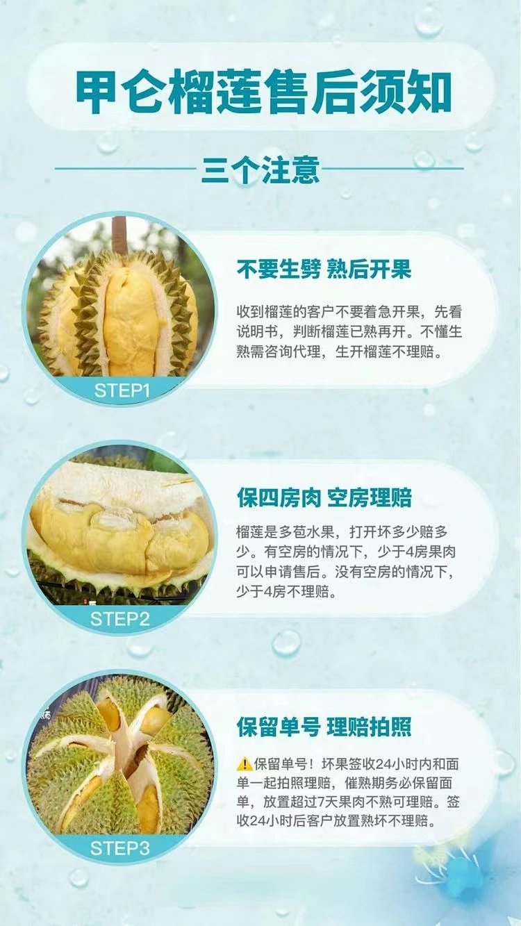 【售后】:甲仑榴莲小果包4房大果包5房。生劈不售后。坏果坏几房赔付几房。不支持局部坏整个售后,个人口感问题不在售后范围,内置售后说明书不懂下单咨询客服,坏果签收24小时内面单合拍。
