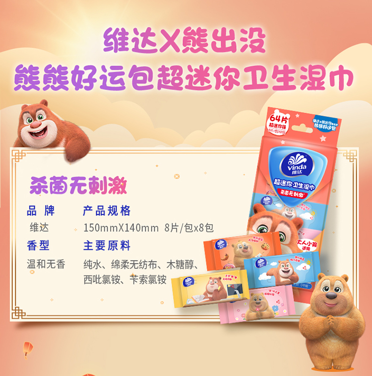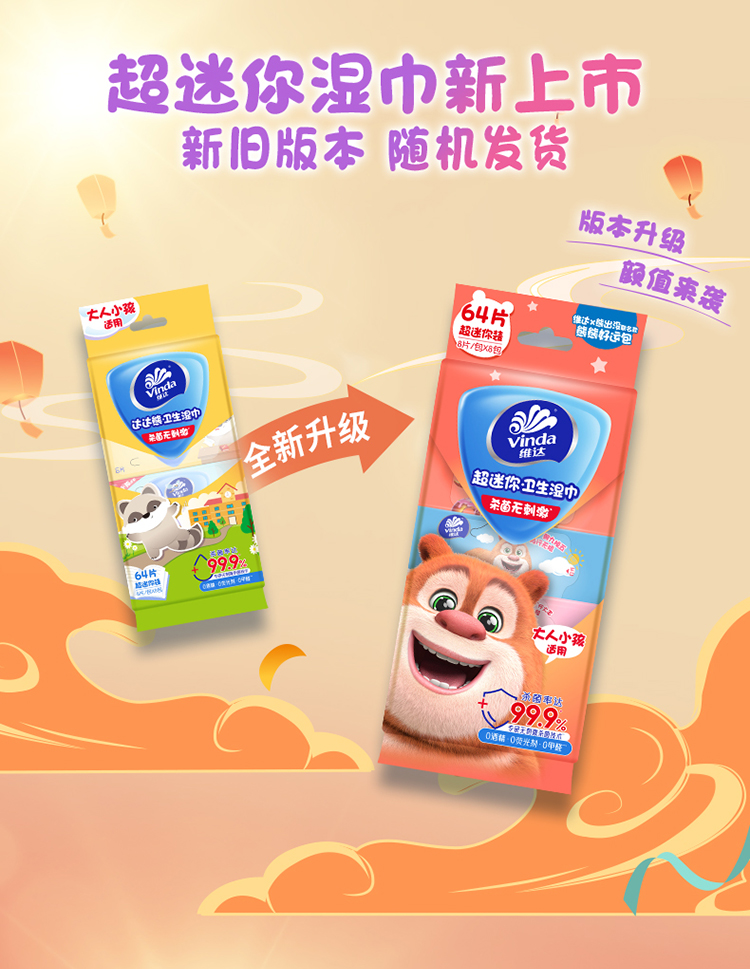 【官方包邮】维达超迷你卫生湿巾(儿童)8包装(熊出没&哒哒熊2款包装随机发)