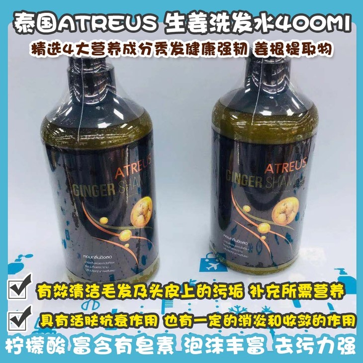 泰國ATREUS 生薑洗髮水400Ml👍特含姜提取物,精选4️⃣大营养成分秀发健康强韧。姜根提取物🌱,有效清洁毛发及头皮上的污垢,补充所需营养。椰油酰胺🌴,具有活肤抗衰作用,也有一定的消炎和收敛的作用。小麦蛋白🥚,有助于改变皮质的组成,减少油光和增加皮肤的柔润程度。柠檬酸🍋,富含有皂素,泡沫丰富,去污力强,用于洗头亦可预防头皮屑具有止痒功效。🌿从养护头皮开始,养护发丝。