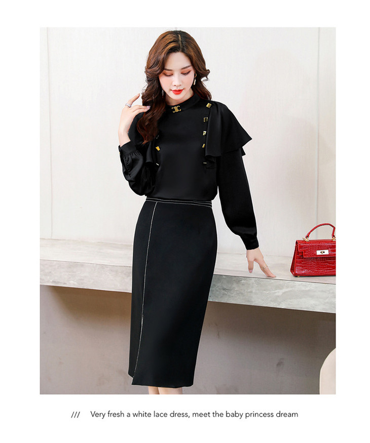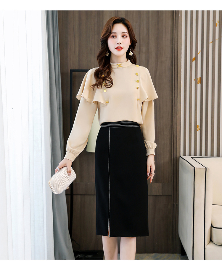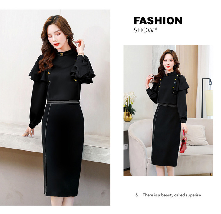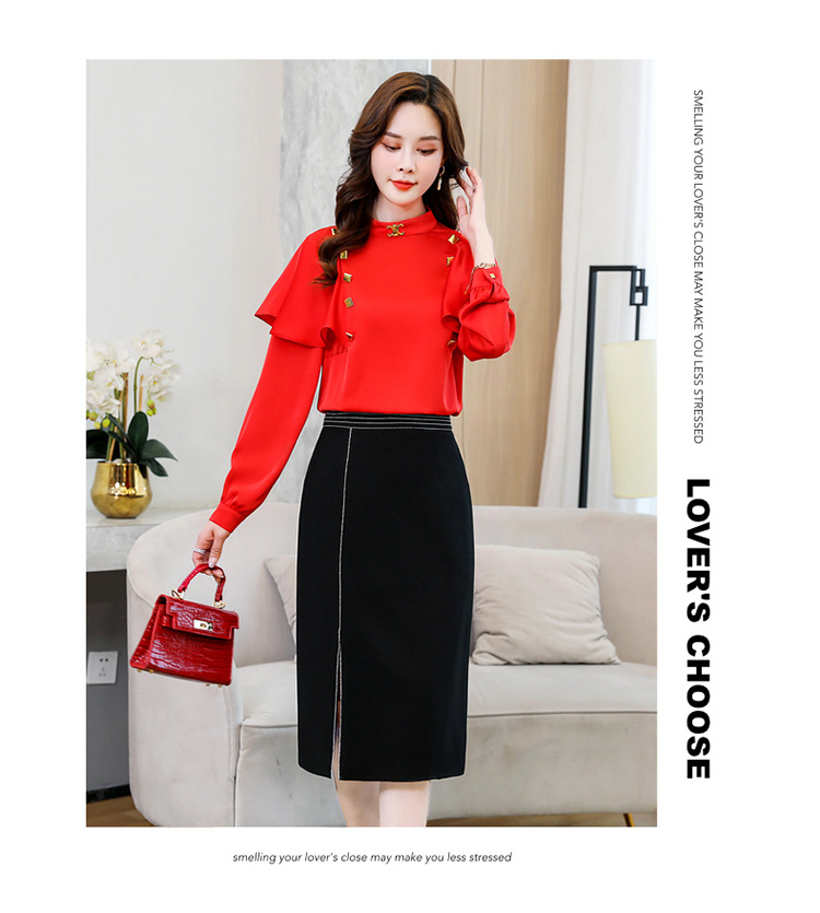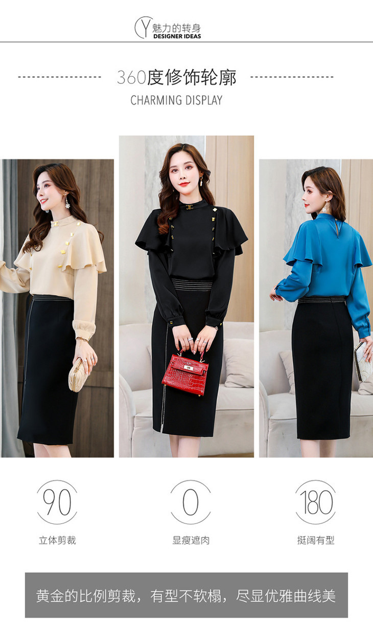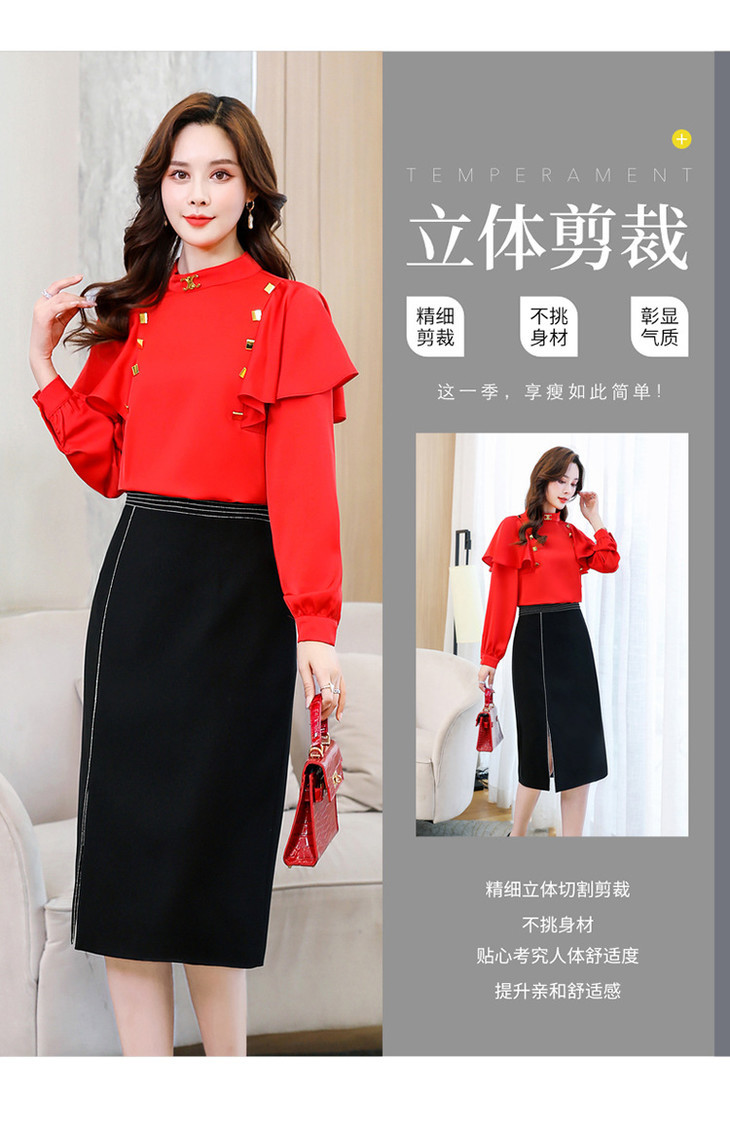HRFS-WHA86699新款潮流时尚气质圆领长袖铆钉拼接雪纺衫半身裙两件套