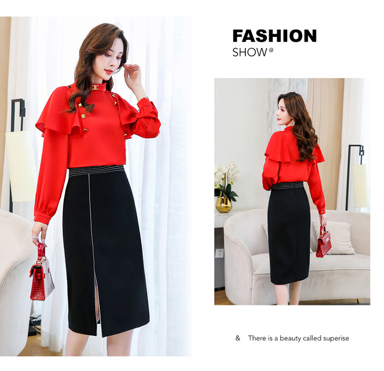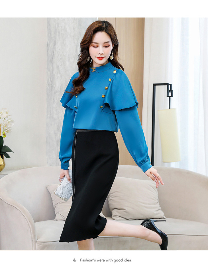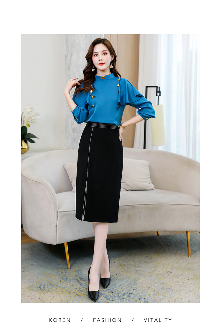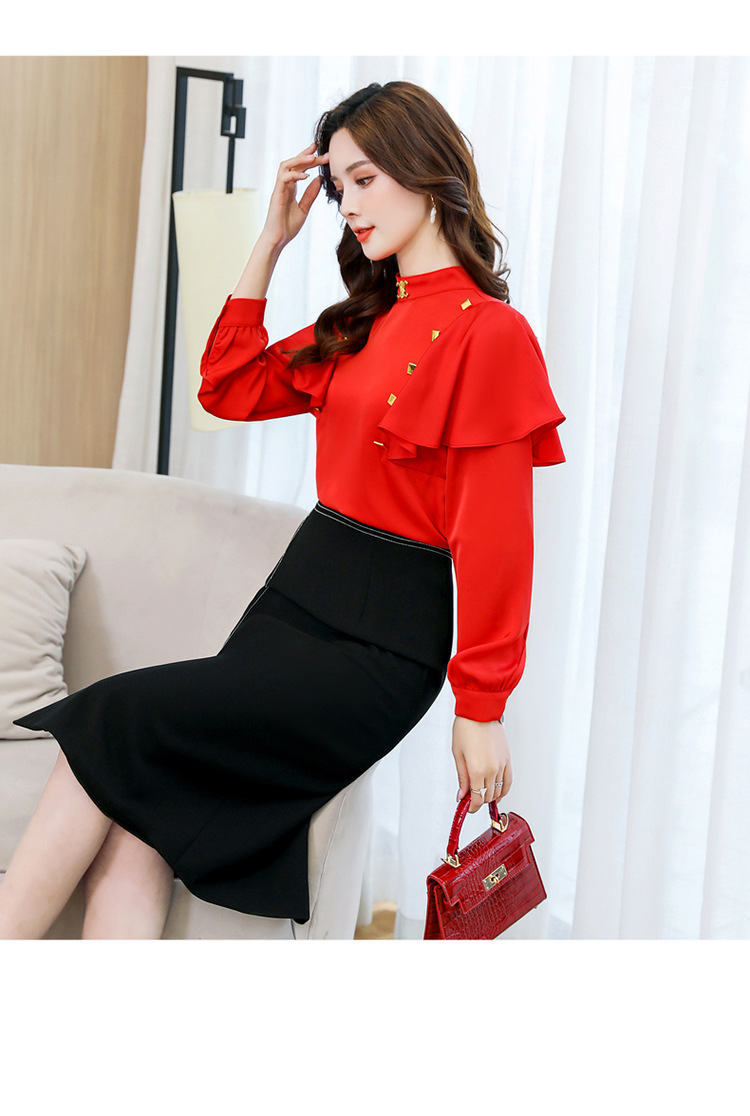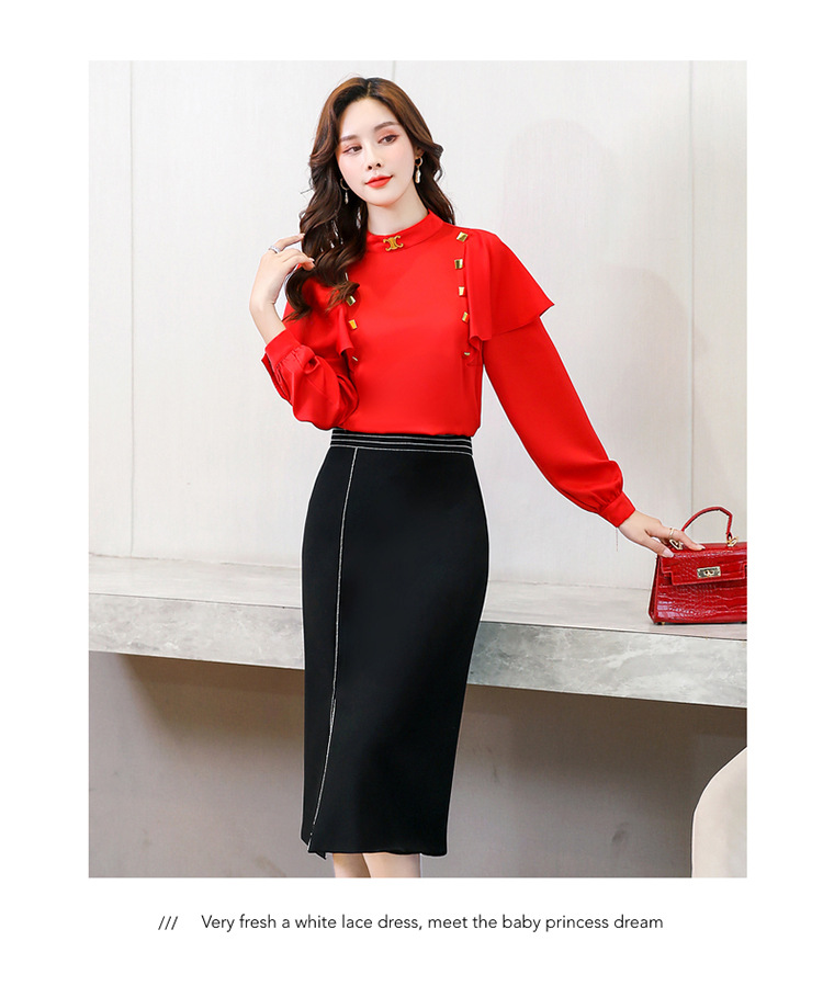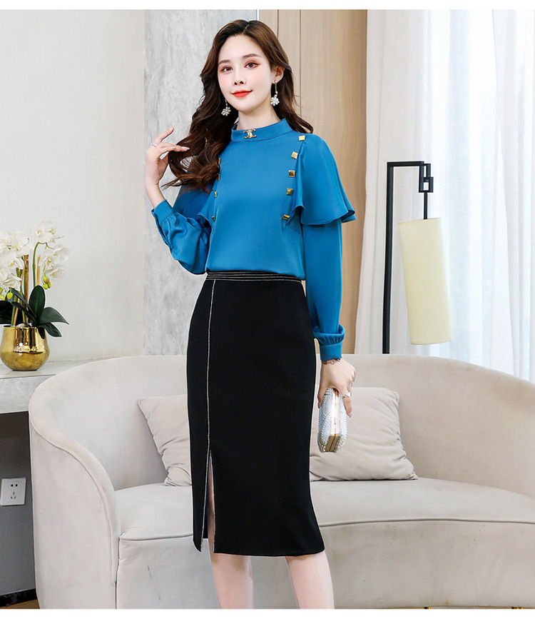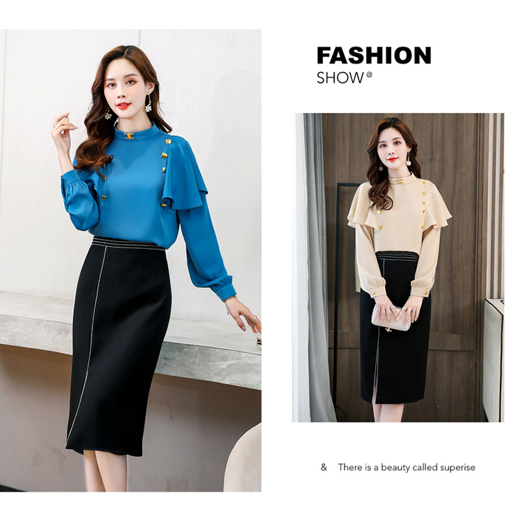 HRFS-WHA86699新款潮流时尚气质圆领长袖铆钉拼接雪纺衫半身裙两件套
