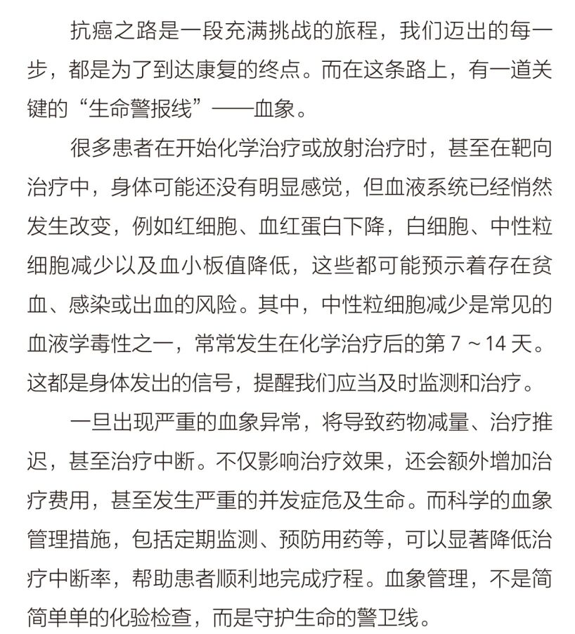 ★抗癌之路是一段充满挑战的旅程,迈出的每一步,都是为了到达康复的终点。而在这条路上,有一道关键的“生命警报线”——血象。