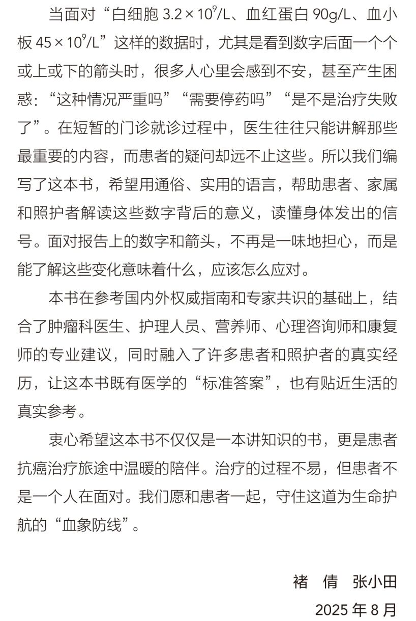 ★本书不仅是一本讲知识的书,更是患者抗癌治疗旅途中温暖的陪伴。治疗的过程不易,但患者不是一个人在面对。愿和患者一起,守住这道为生命护航的“血象防线”。