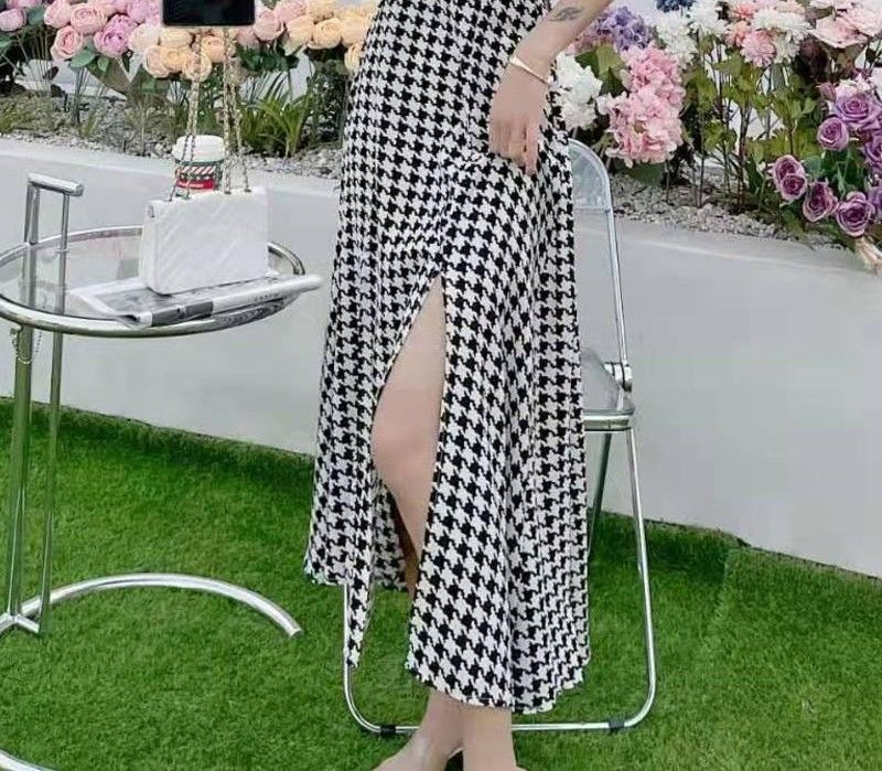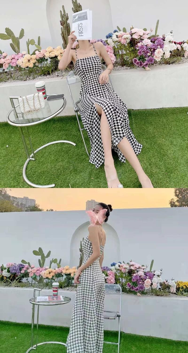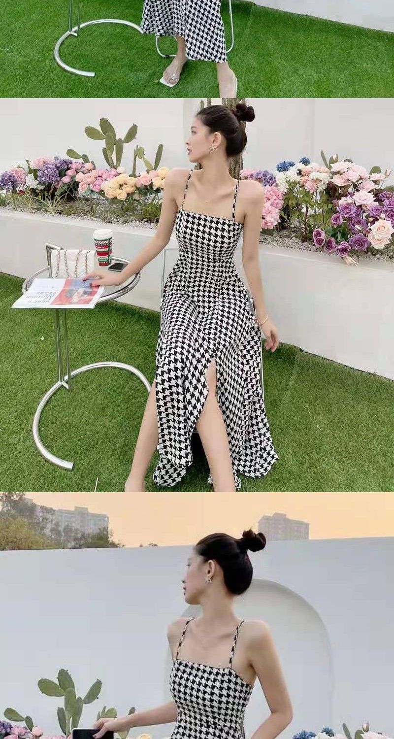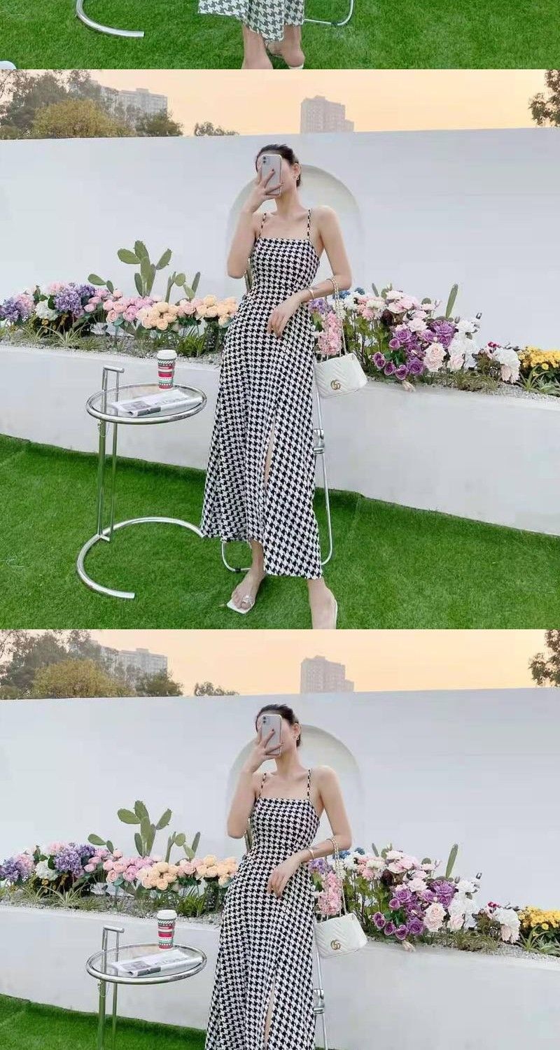 法式小众气质开衩格子吊带裙2021夏季新款可盐可甜温柔风长裙子潮