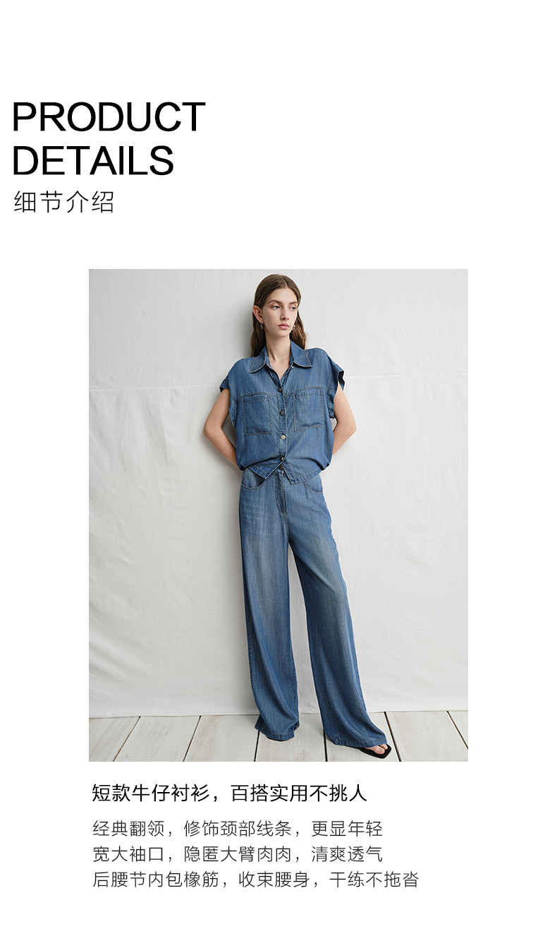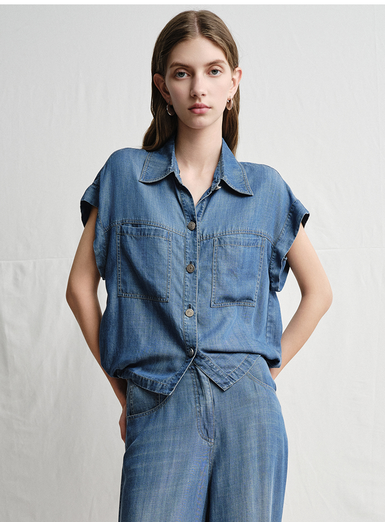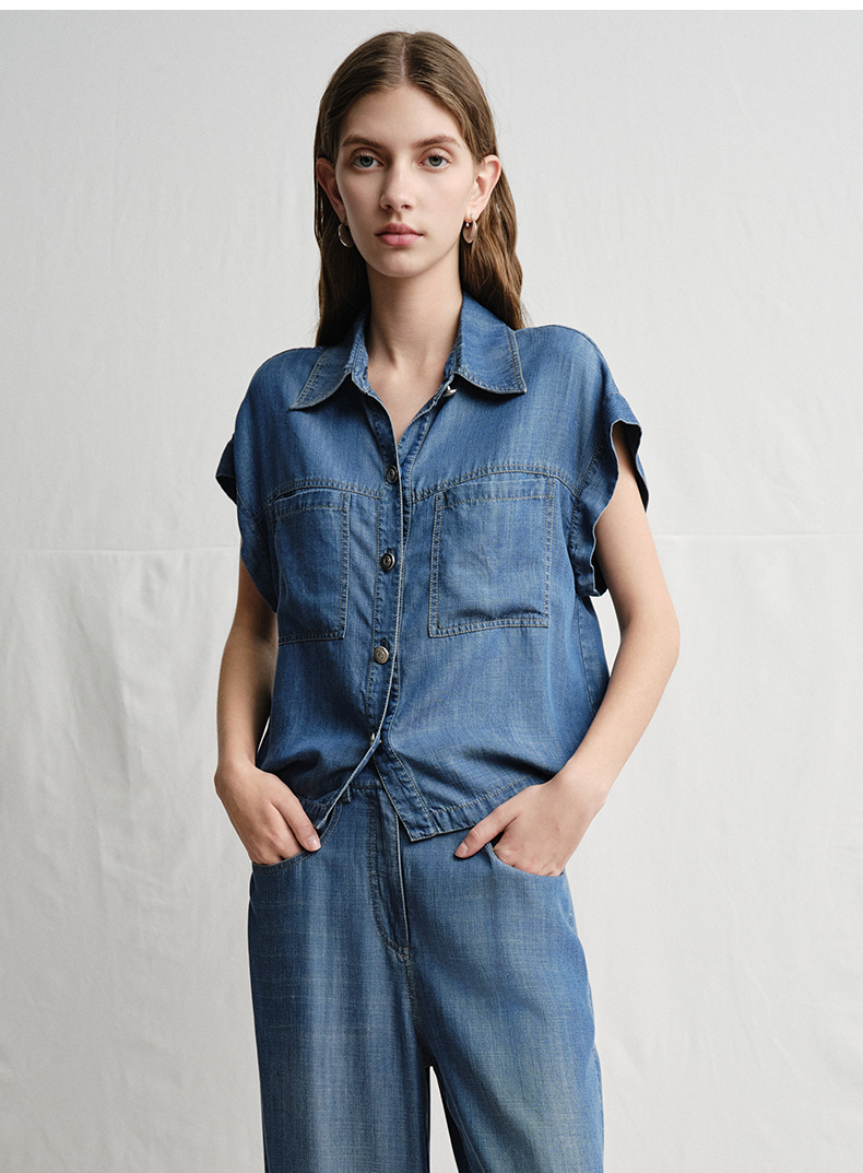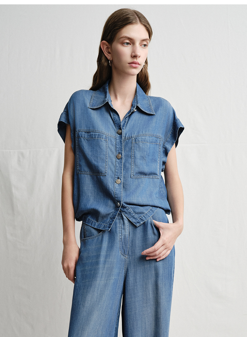 VIMAGE纬漫纪复古港风牛仔蓝短袖衬衫宽松上衣2025夏季新款V2313923