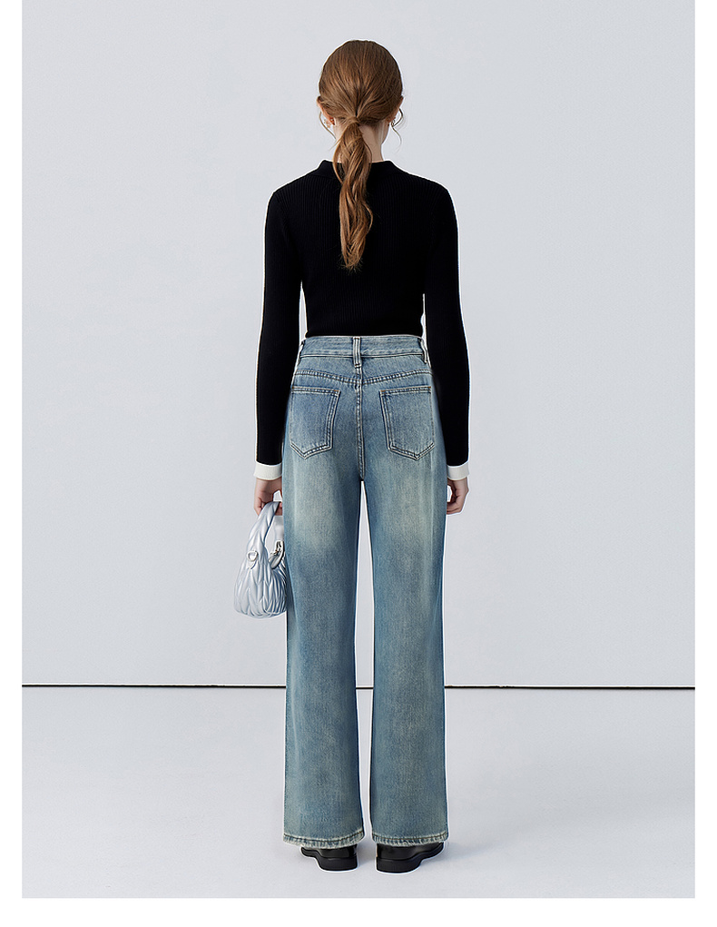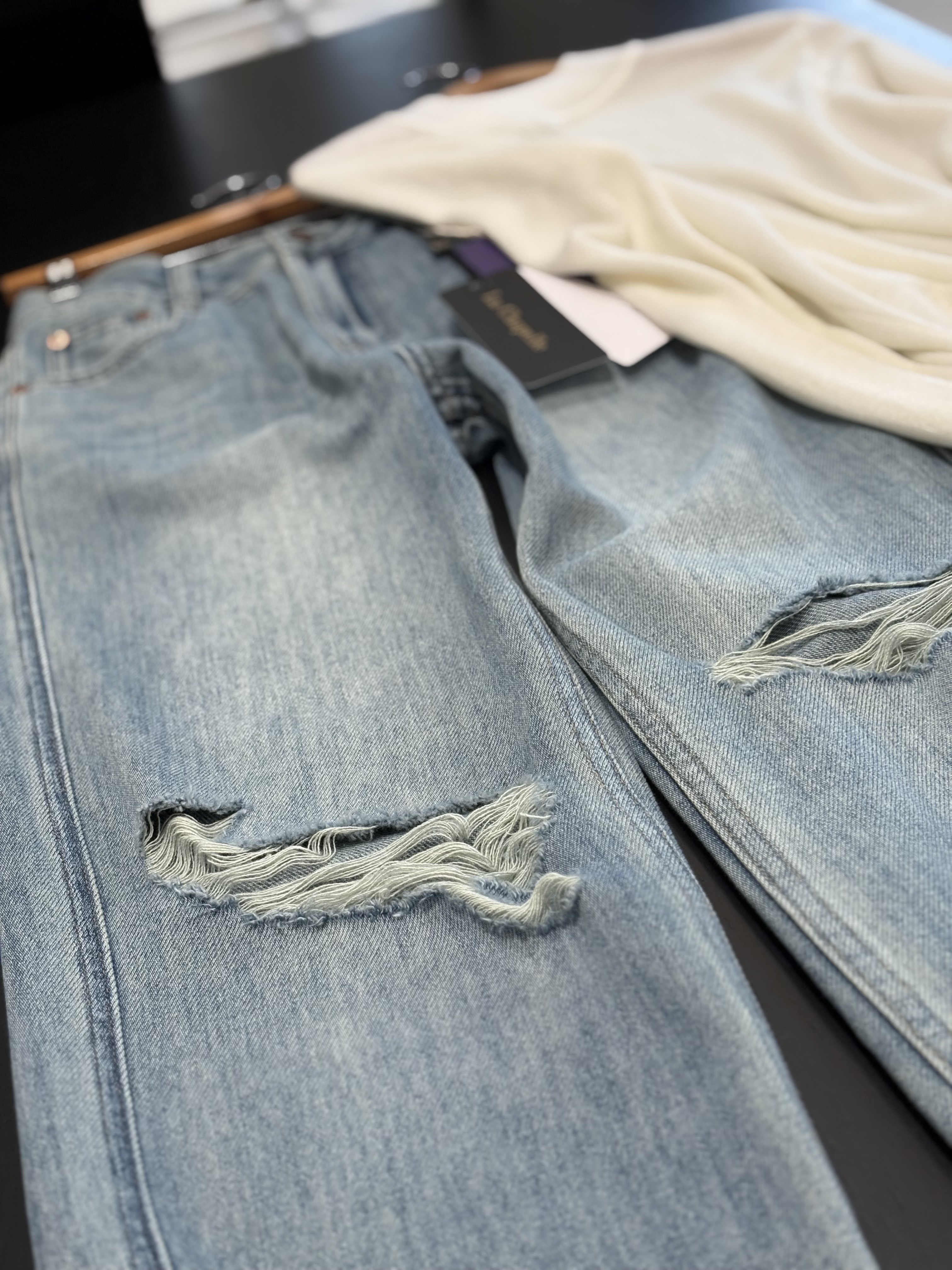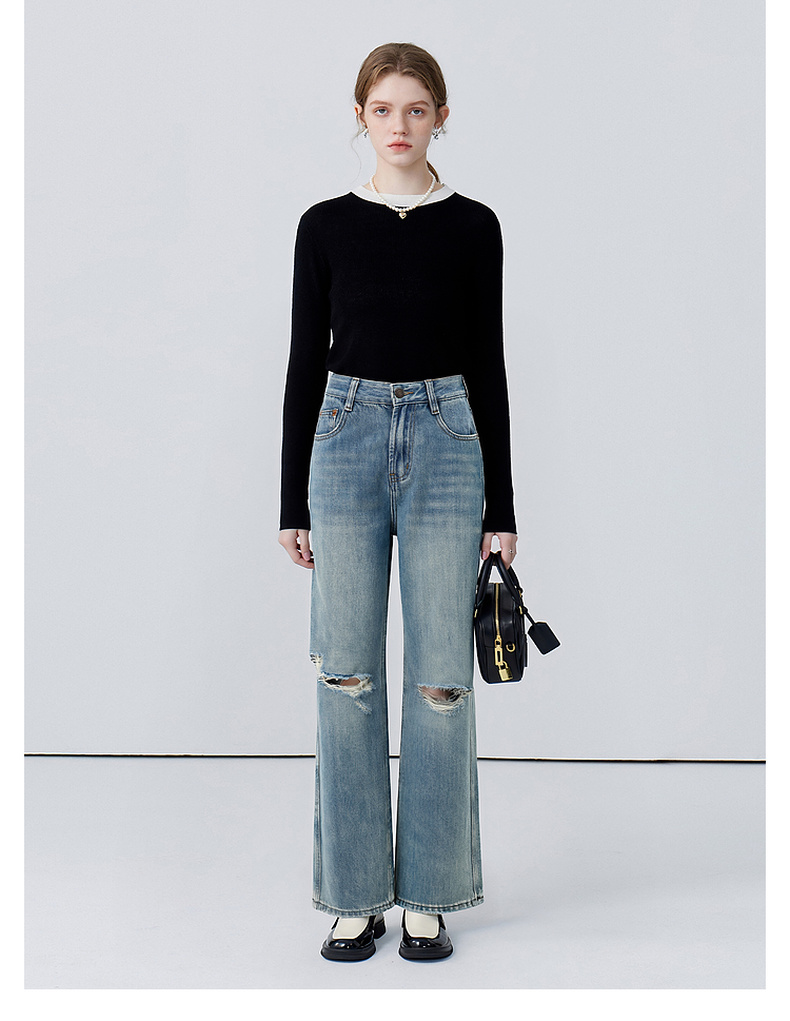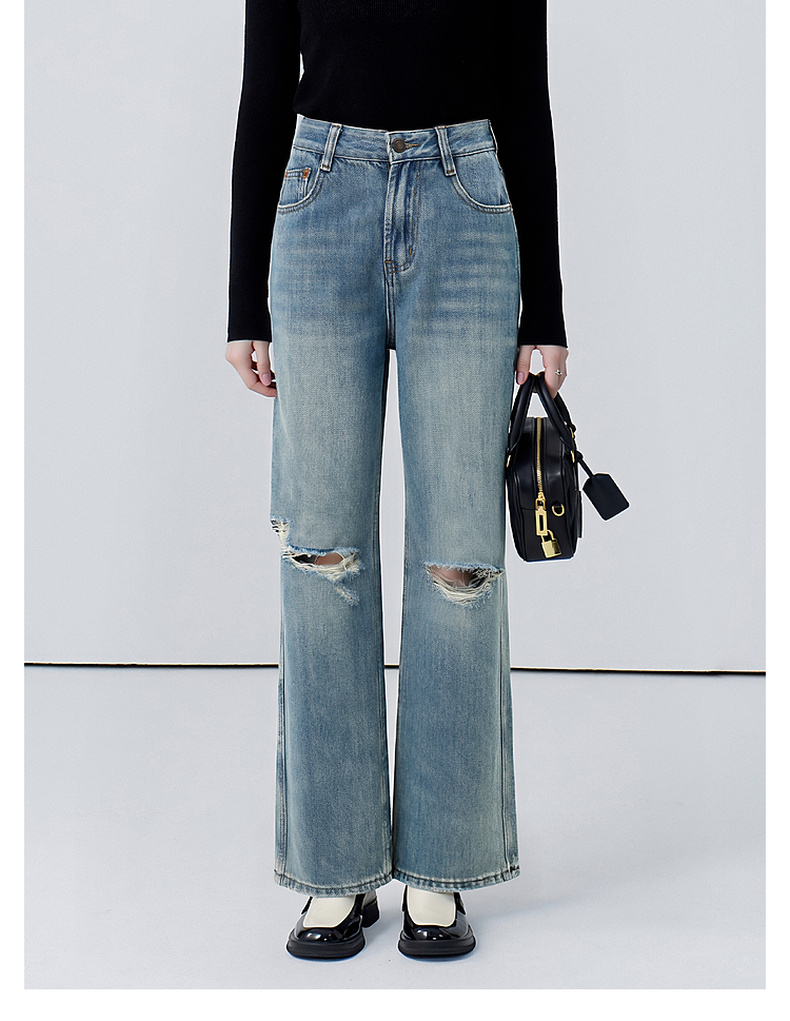 会员福利【美式高阶感】拉夏贝尔/La Chapelle百搭时尚破洞前卫设计精致小众感牛仔裤小个子微喇裤