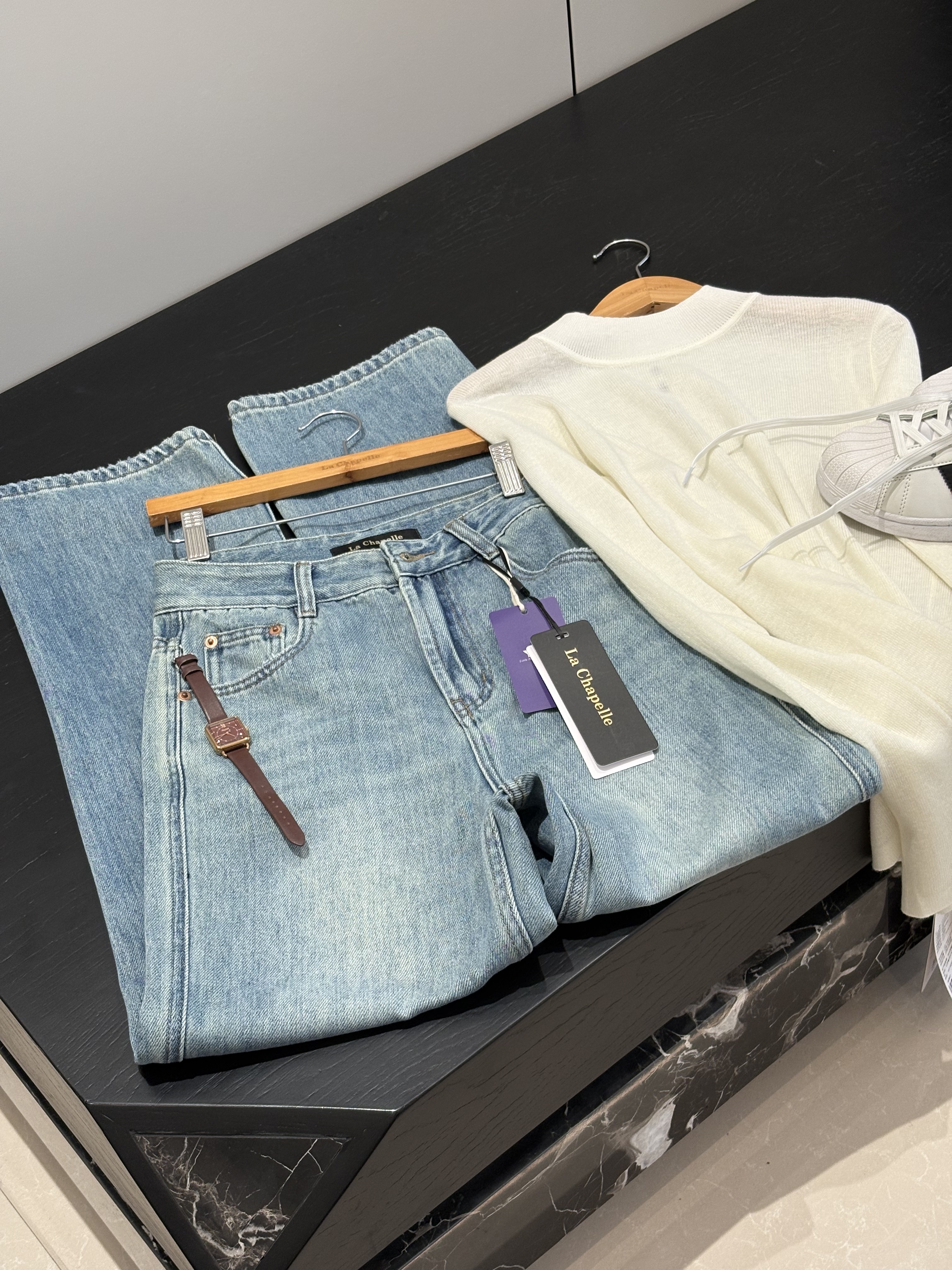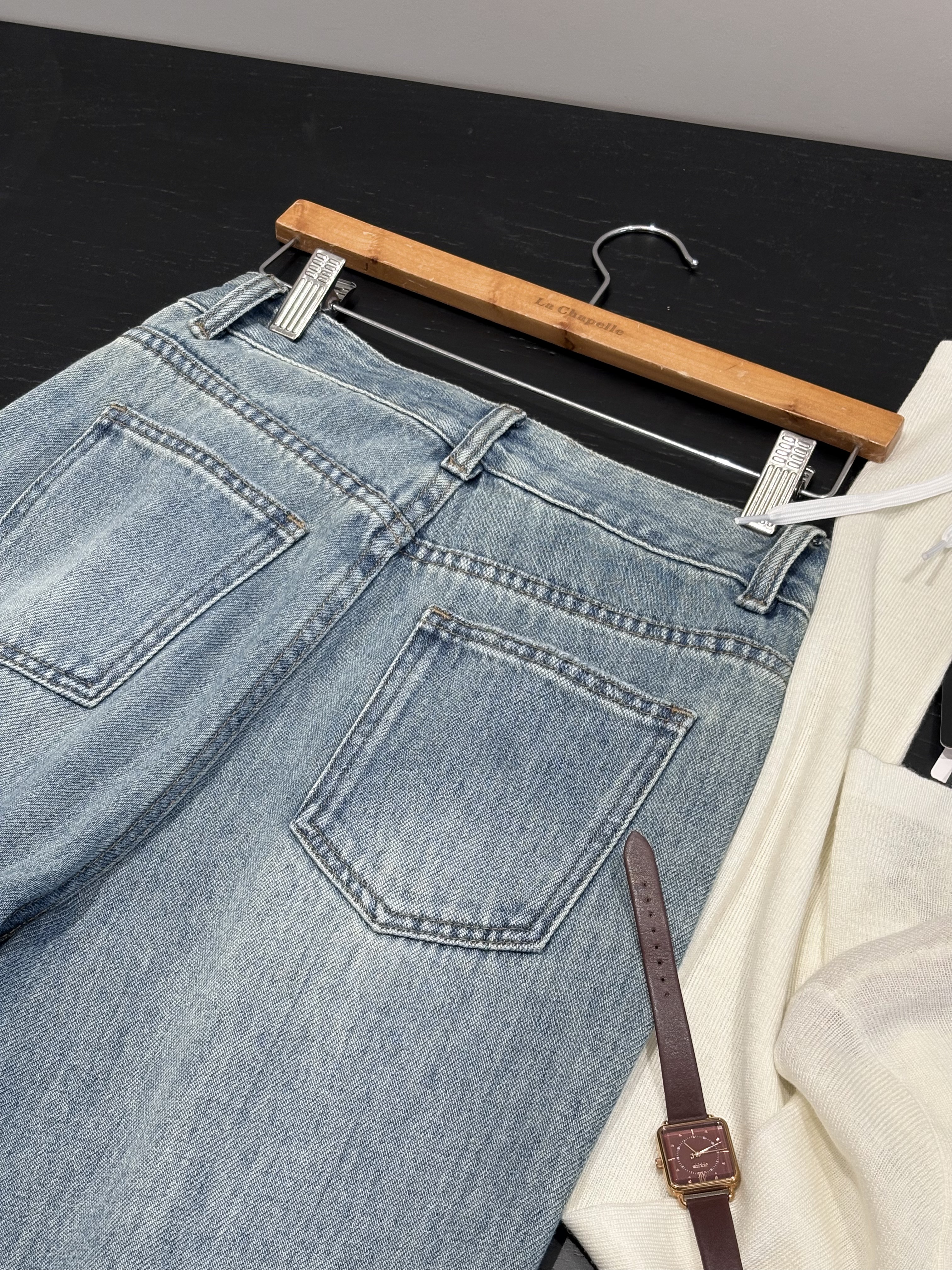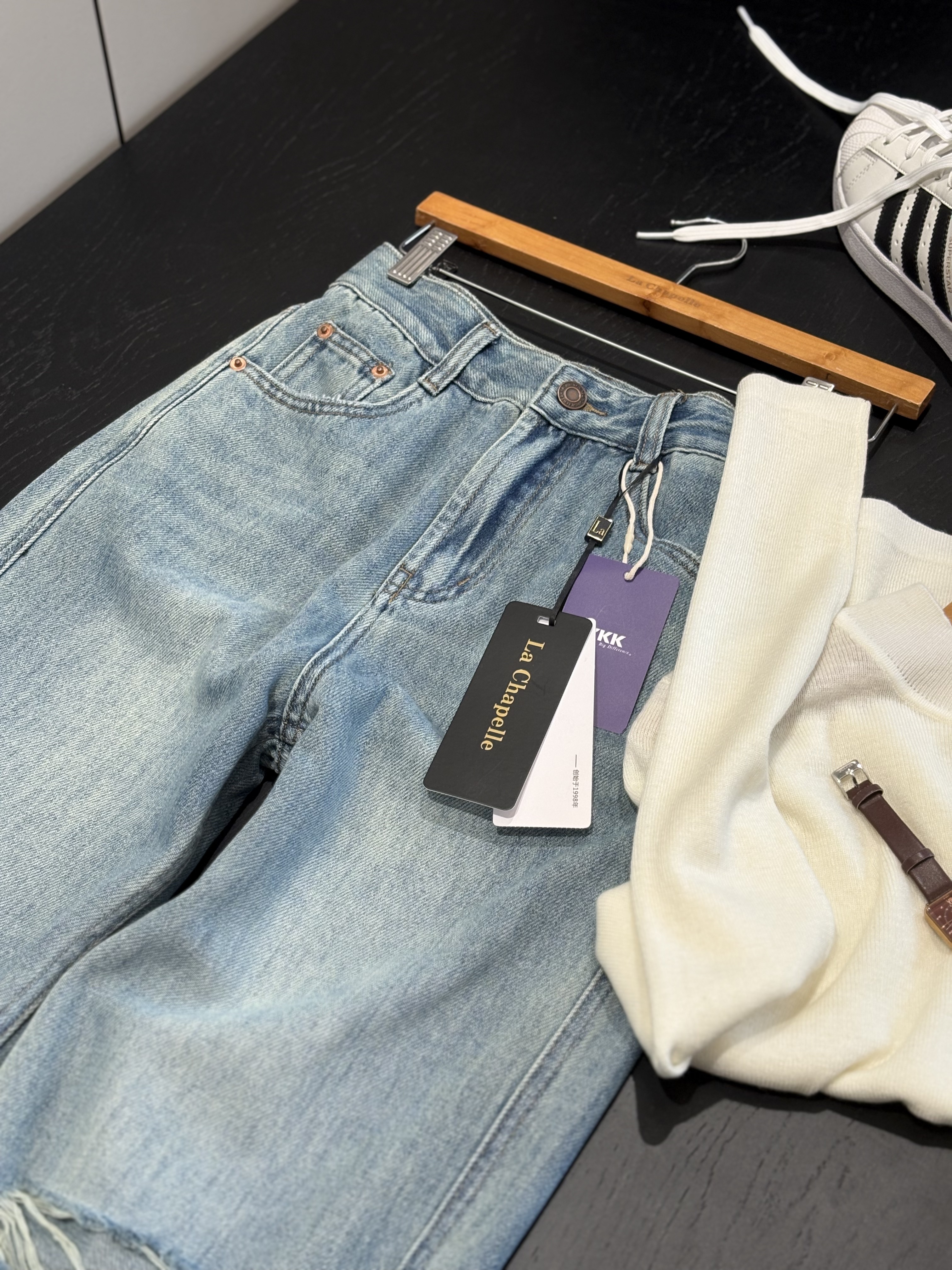 会员福利【美式高阶感】拉夏贝尔/La Chapelle百搭时尚破洞前卫设计精致小众感牛仔裤小个子微喇裤