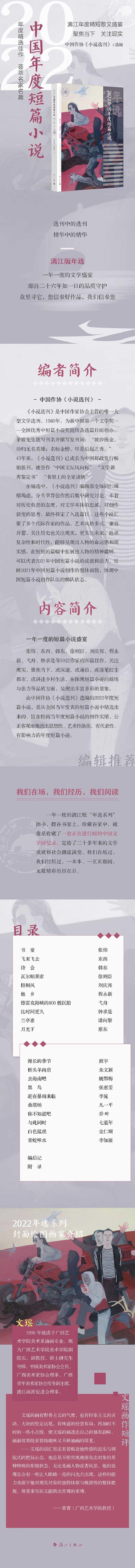 由中国作协《小说选刊》选编的2022年度短篇小说,是从全国当年发表的短篇小说中精选出来的,旨在检阅当年度短篇小说的创作实绩,公正客观地推选出思想性、艺术性俱佳,有代表性、有影响力的年度短篇小说。