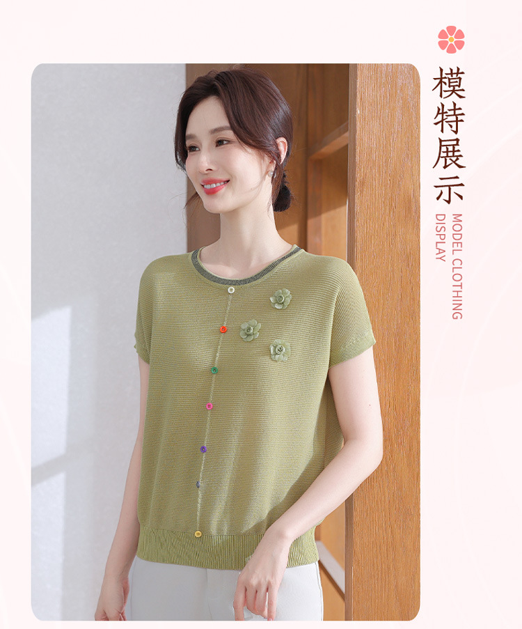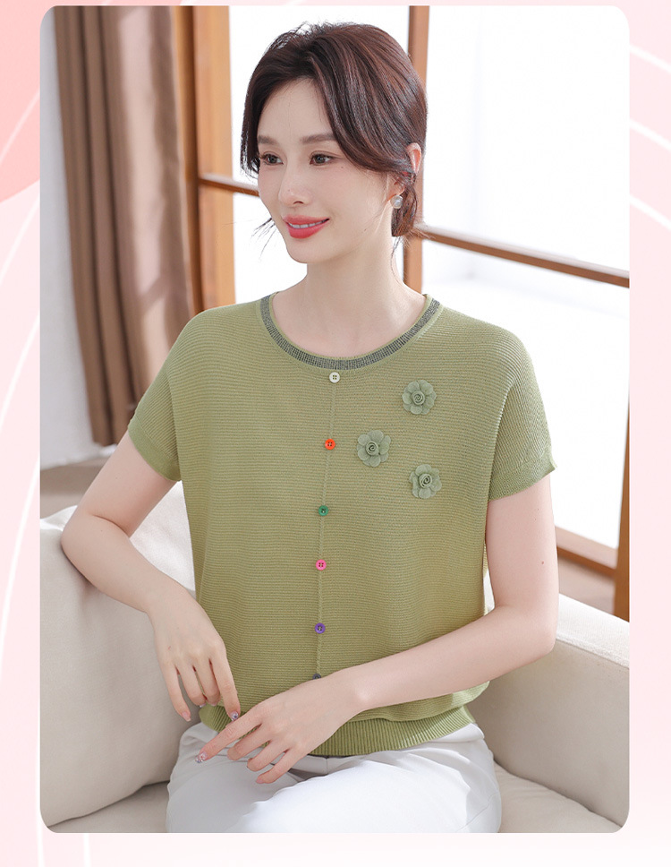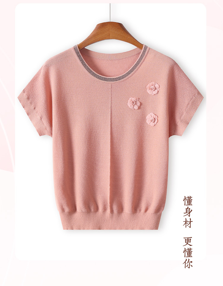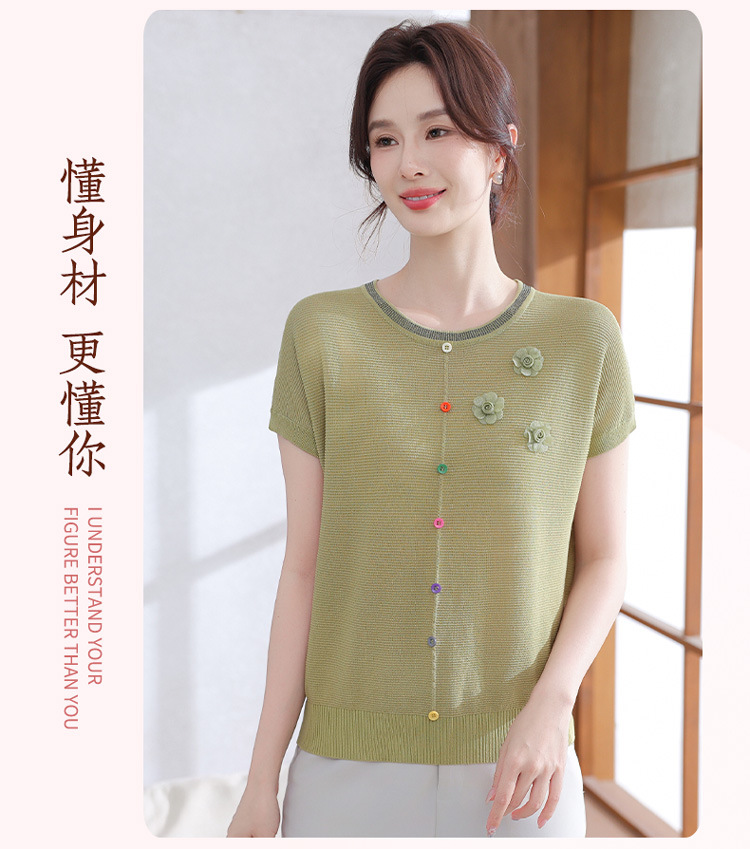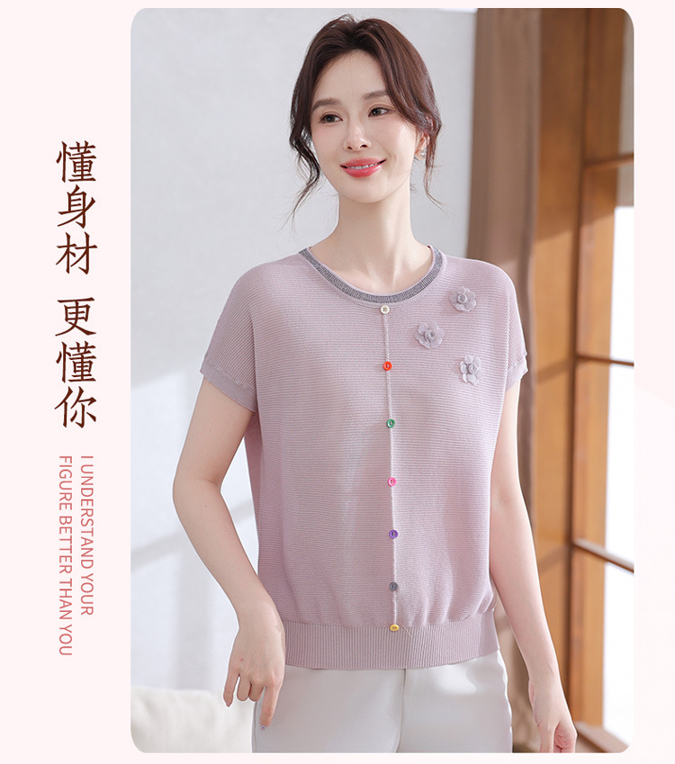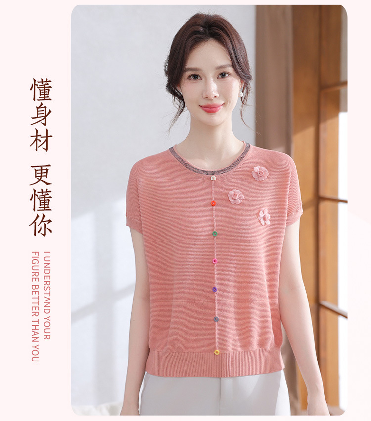 W561-17722-68-1082025新款洋气妈妈夏装短袖针织小衫薄款中年女夏季圆领冰丝t恤衫