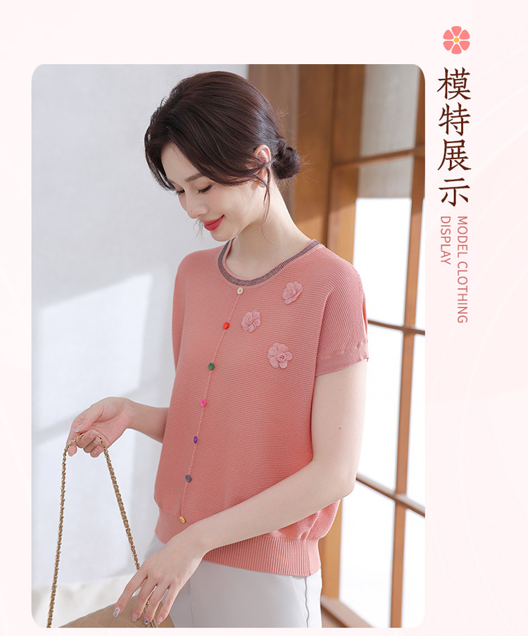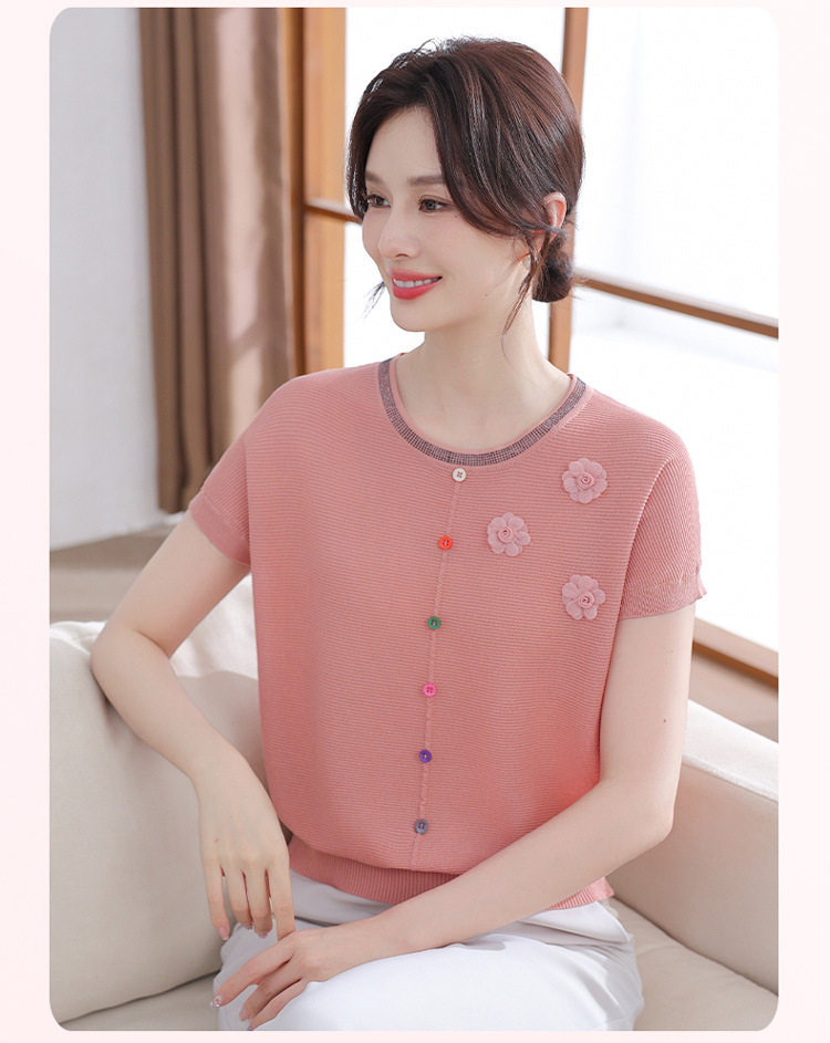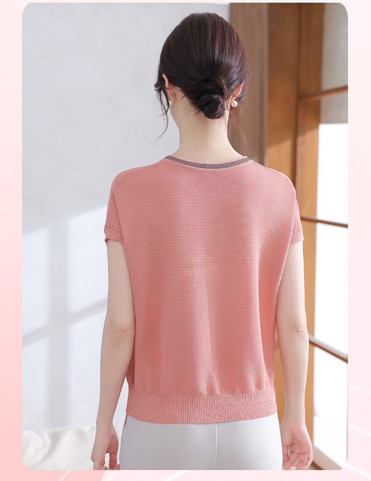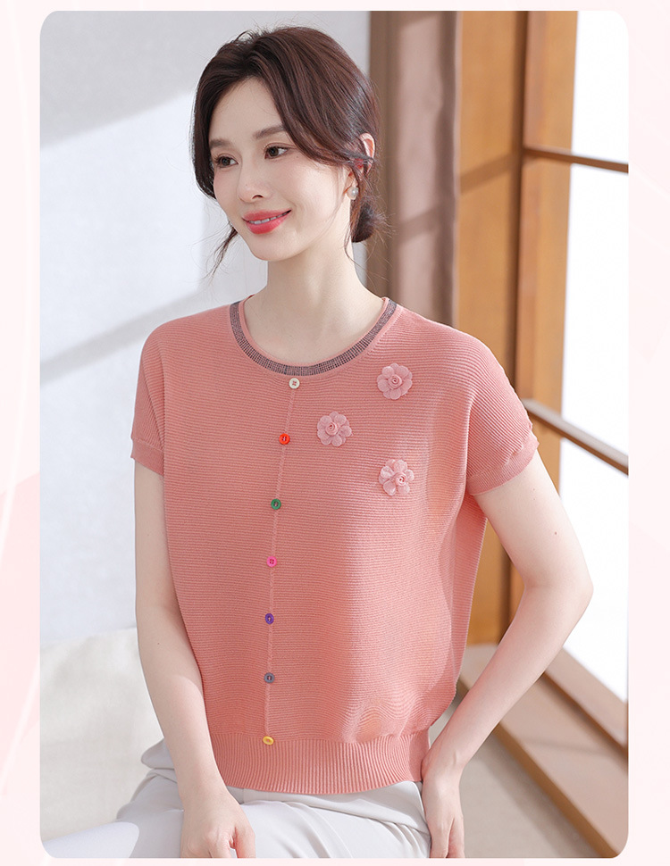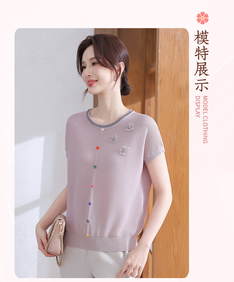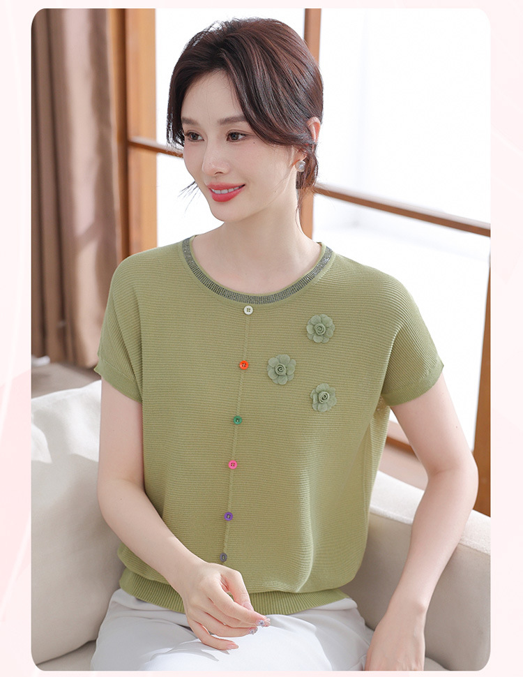 W561-17722-68-1082025新款洋气妈妈夏装短袖针织小衫薄款中年女夏季圆领冰丝t恤衫