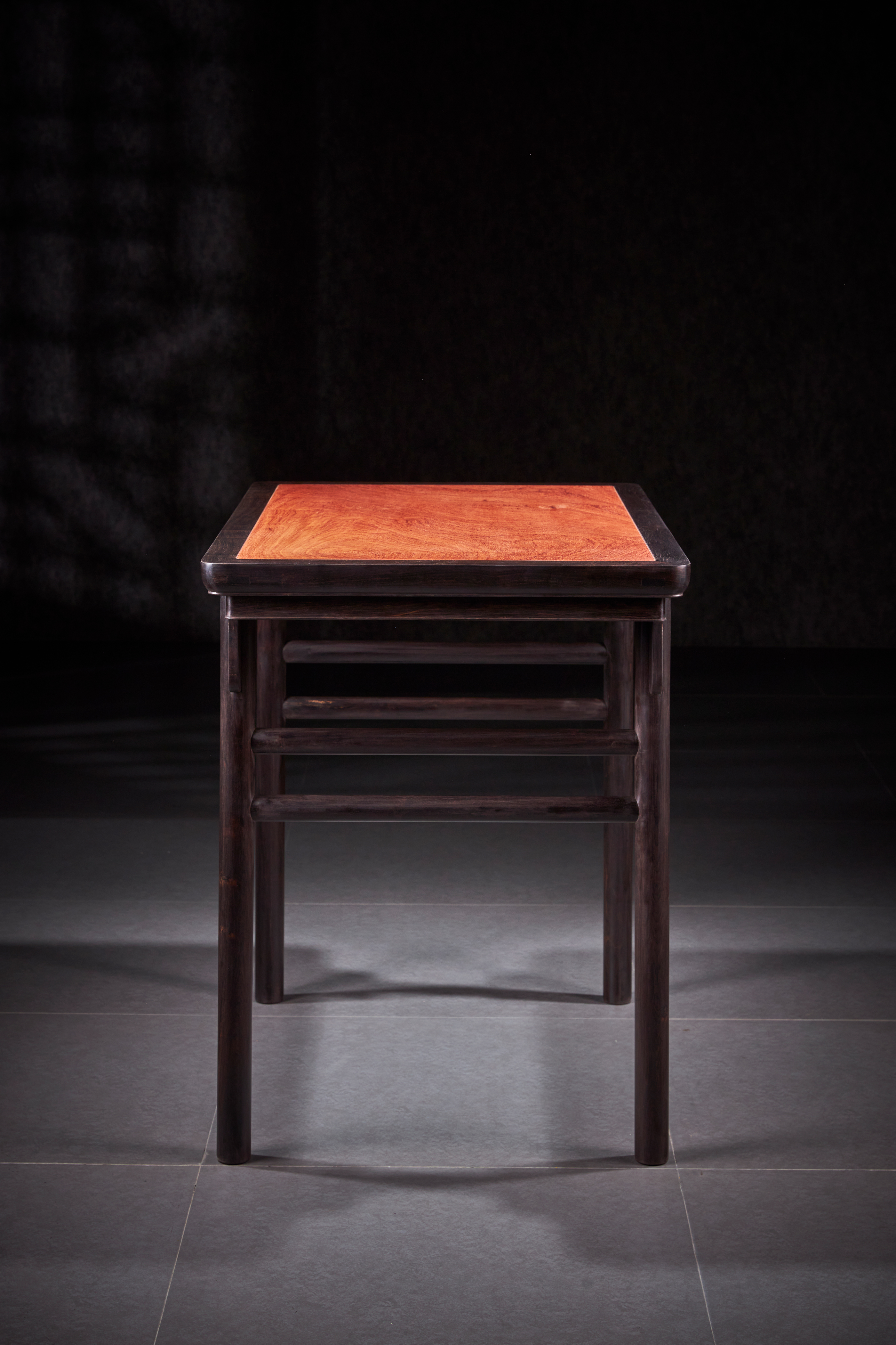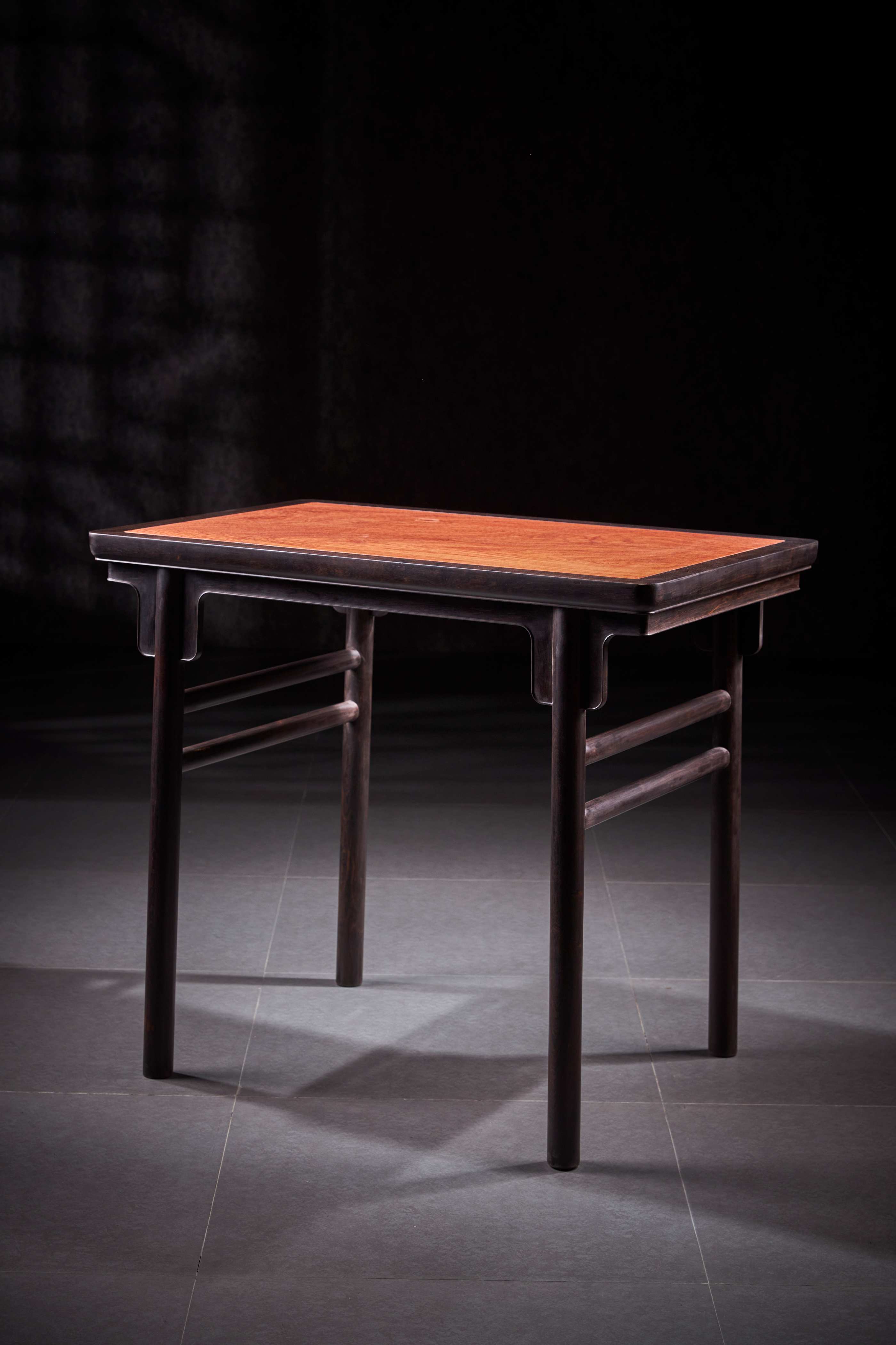 整器做撞色效果,边框及腿足之材皆取紫光檀(东非黑黄檀),质坚材硬,暗纹迷人,面中部嵌夹鲜丽缅甸花梨(正宗大果紫檀),赏之如姚黄魏紫。整体尺寸甚佳,短而阔,稳重端庄,面独板做法窄边框,上四公分,底部六公分,明窄暗宽,使案面整体更显文雅,边框内外大圆角做法,甚为考究。