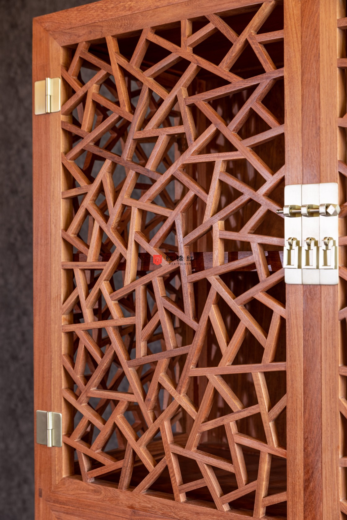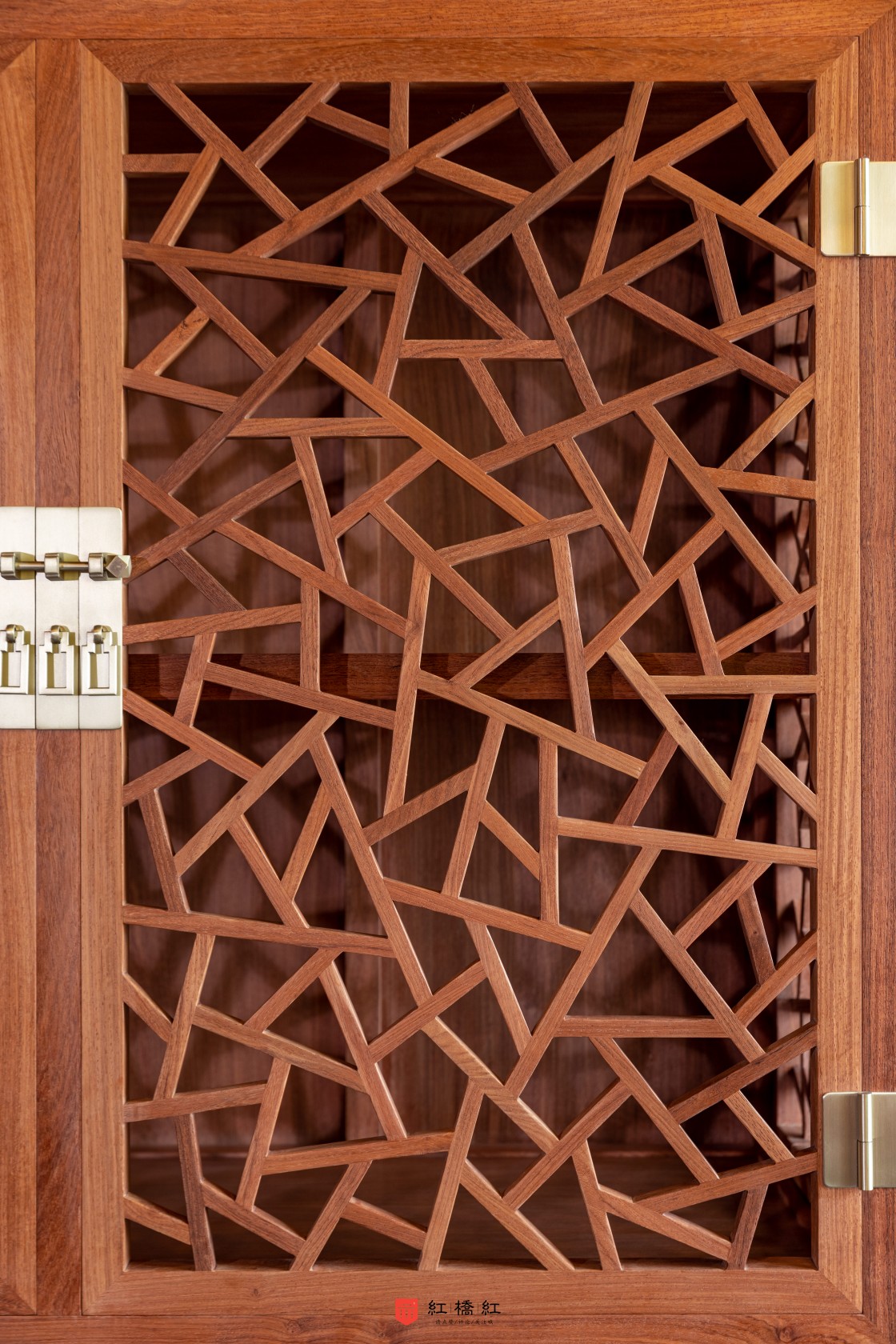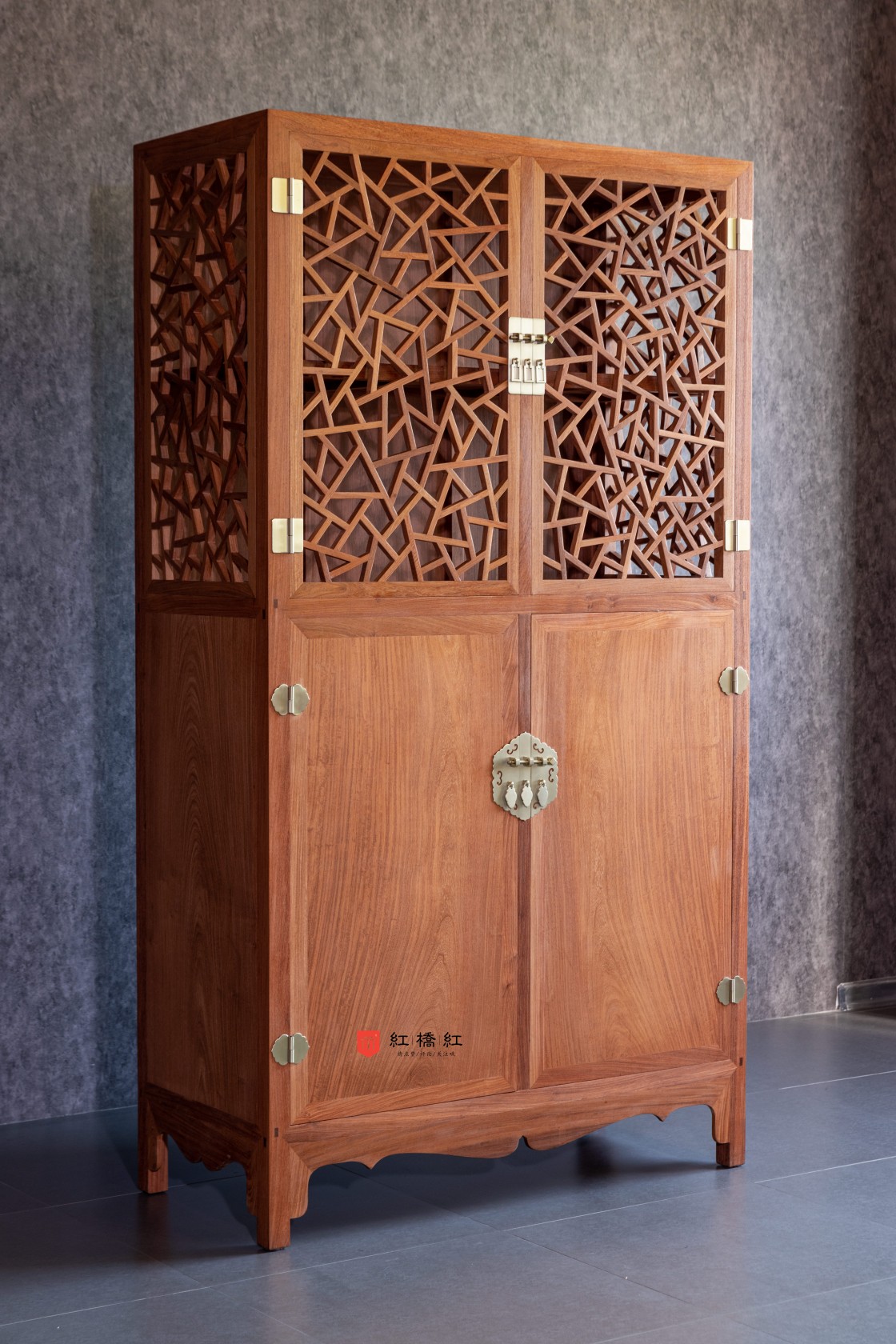此柜始制于明未清初,当时的陈列柜传世品数量稀少,此柜独一无,具有独特的价值。此柜分上下两部,四扇门,以白铜合页安装。上下两扇门间均设活动式门杆,上部透格层与上层柜侧均做榫卯短材攒接成冰绽纹图案;冰绽纹仿照明代建筑中风窗的设计,原为宋青瓷哥窑开片纹。柜身装有白铜长方形合叶与海棠形面叶,三个方形钮头与吊牌,合页与面页上饰有云纹。下层柜身全素,柜门以格角榫攒边打槽平镶面心。柜内中央有一格板装两具抽屉。门下作肩底枨下有壸门牙条,两侧安类似牙条。大柜的方角形轮廓平直单一,其下安线条柔婉的壶门式宽牙子,都是精心营造的设计。