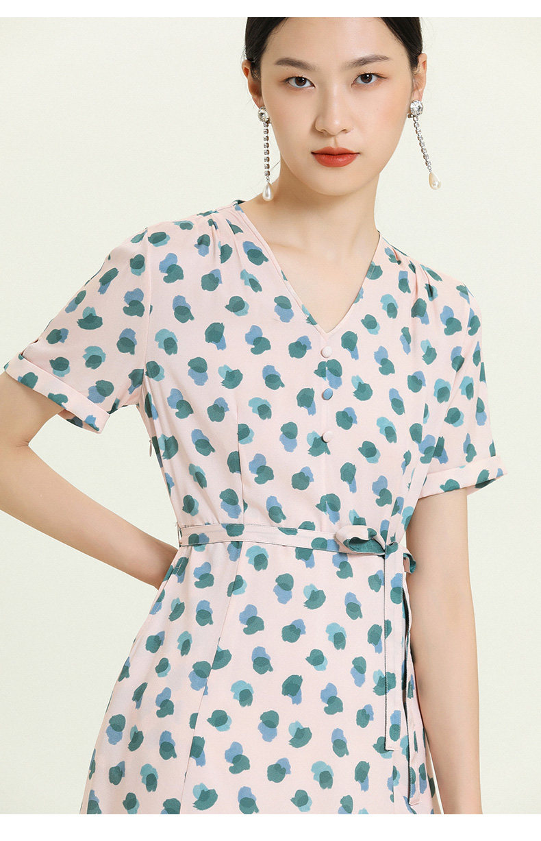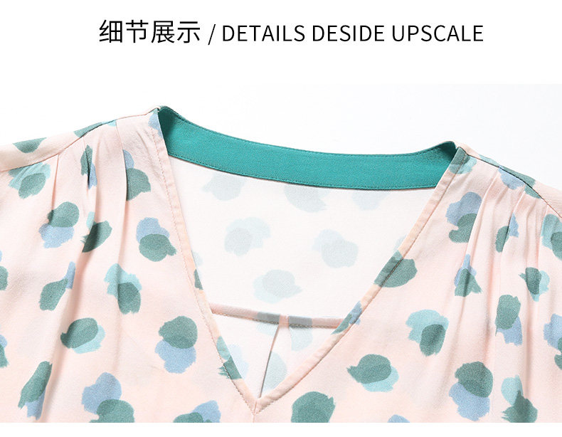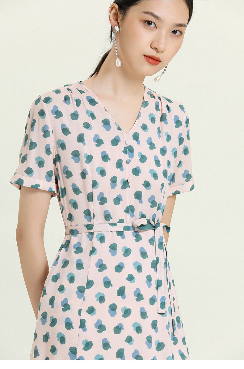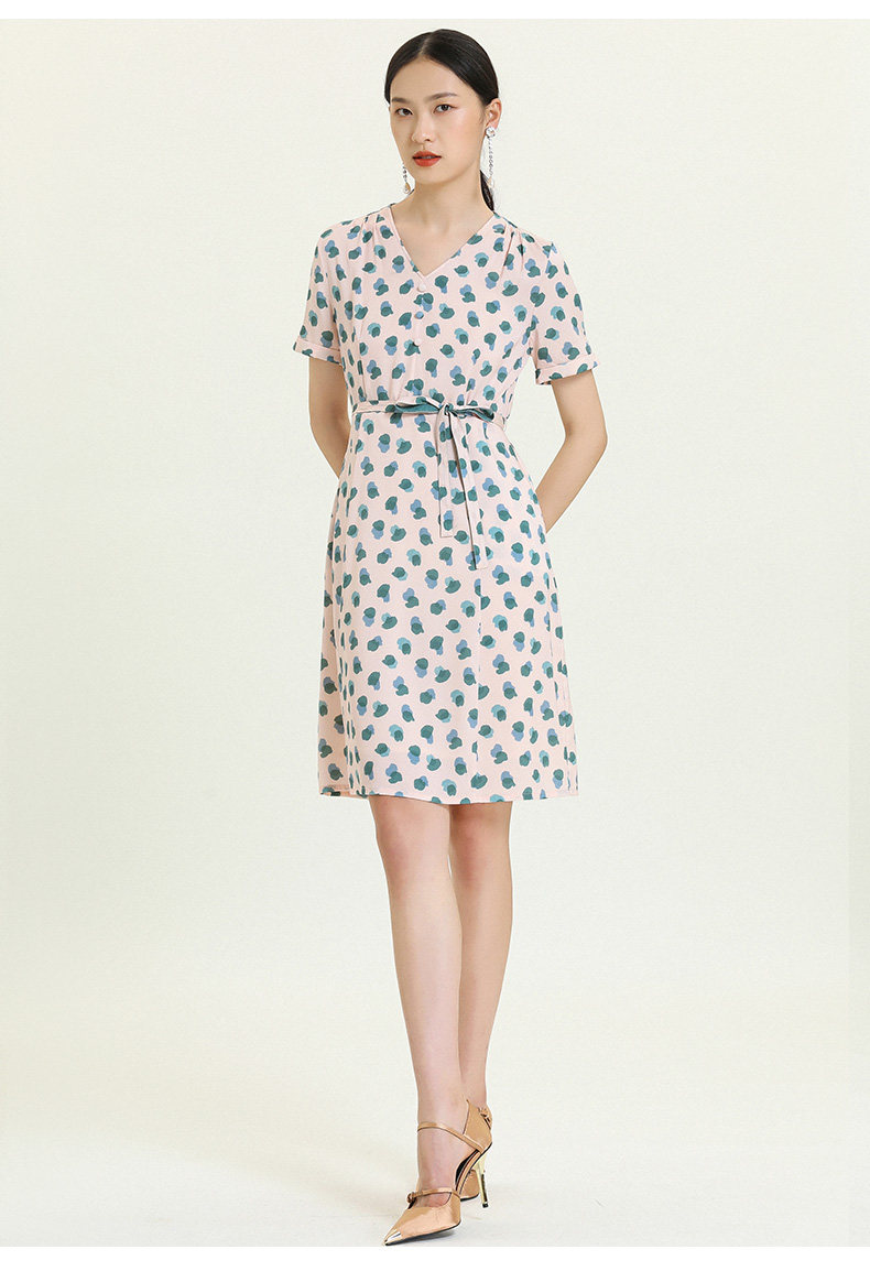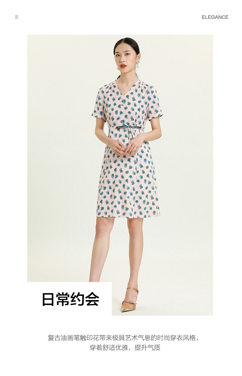 乔万尼夏真丝连衣裙气质修身显瘦V领短袖桑蚕丝中长裙女EN2E575