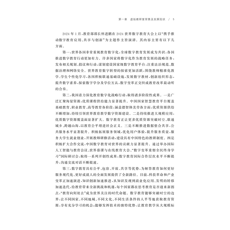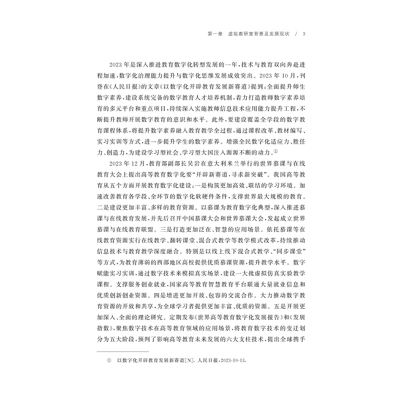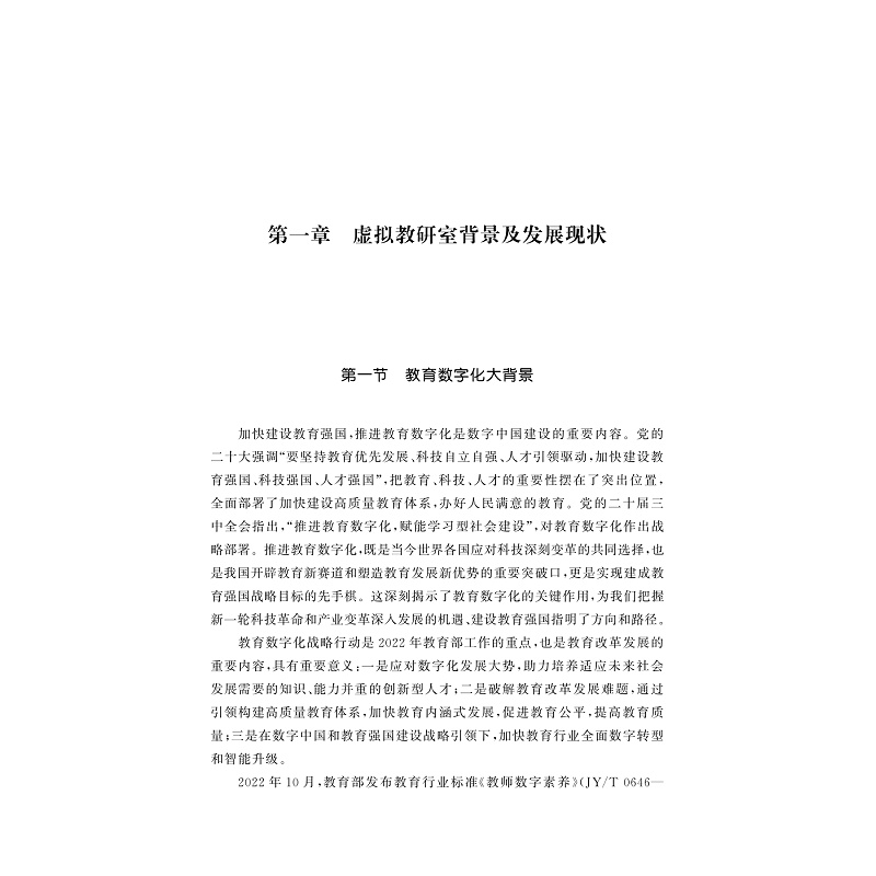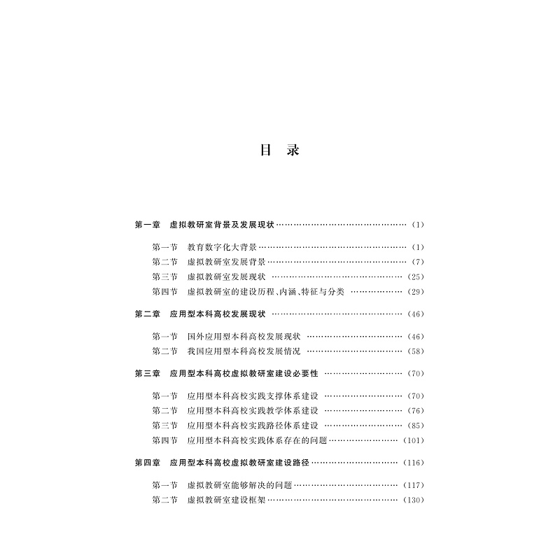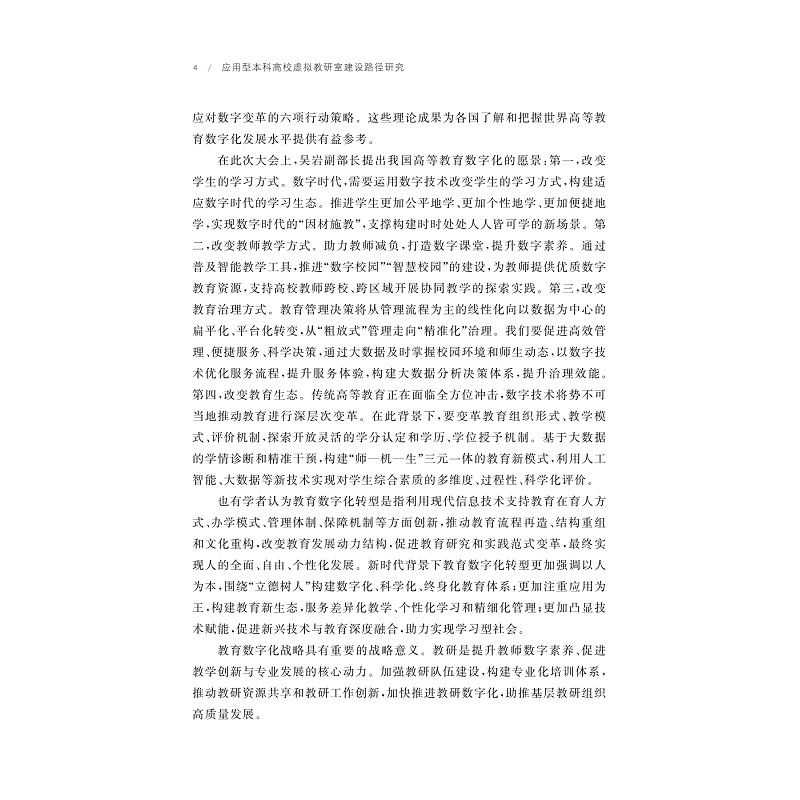 本书围绕应用型本科高校虚拟教研室分四章展开研究。第一章介绍教育数字化大背景,梳理虚拟教研室发展历程,详细阐释内涵、特征与分类,阐述虚拟教研室在解决这些问题时所能发挥的关键作用。第二章提出应用型本科高校虚拟教研室建设路径,明确建设方向与重点,从教学资源整合、教学研究与改革推进、教师专业发展支持等多个方面阐述。第三章以财务管理专业为例,阐述财务管理专业虚拟教研室的建设目标、任务和具体建设内容。第四章 基于虚拟教研室当前的发展趋势和潜在机遇,对应用型本科高校虚拟教研室的未来发展进行展望,并提出富有建设性的思考与建议,为其长远发展提供思路,也为其他高校提供实践样本。