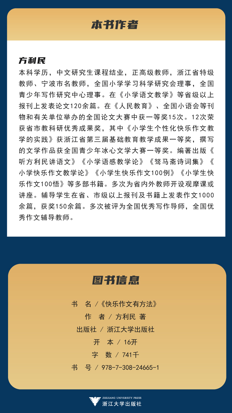 本科学历,中文研究生课程结业,正高级教师,浙江省特级教师、宁波市名教师,全国小学学习科学研究会理事,全国青少年写作研究中心理事。在《小学语文教学》等省级以上报刊上发表论文120余篇。在《人民教育》、全国小语会等刊物和有关单位举办的全国论文大赛中获一等奖15次。12次荣获省市教科研优秀成果奖,其中《小学生个性化快乐作文教学的实践》获浙江省第三届基础教育教学成果一等奖,撰写的文学作品获全国青少年冰心文学大赛一等奖。编著出版《听方利民讲语文》《小学语感教学论》《驽马斋诗词集》《小学快乐作文教学论》《小学生快乐作文100例》《小学生快乐作文100悟》等多部书籍。多次为省内外教师开设观摩课或讲座。辅导学生在省、市级以上报刊及书籍上发表作文1000余篇,获奖150余篇。多次被评为全国优秀写作导师,全国优秀作文辅导教师。