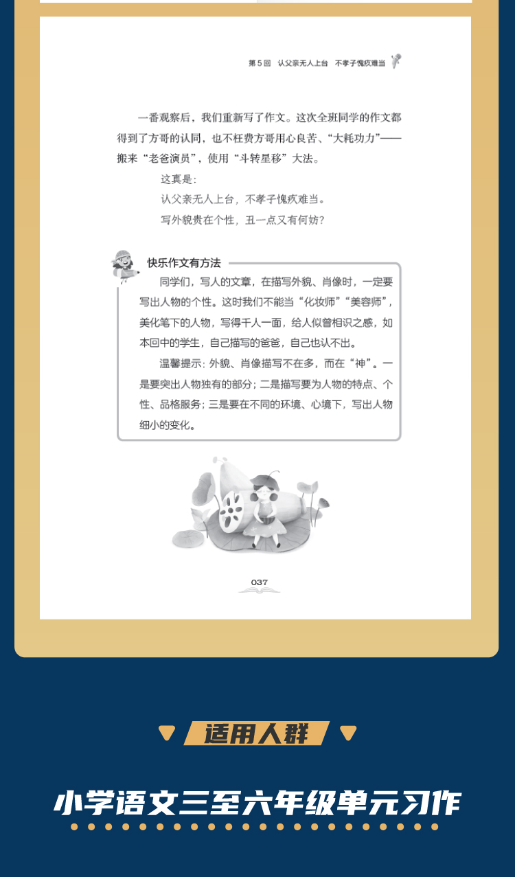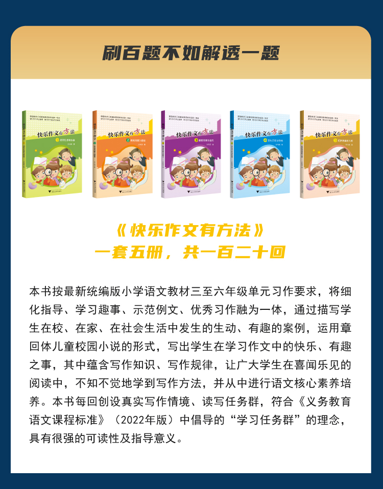 《快乐作文有方法》,一套五册,共一百二十回。本书按新统编版小学语文教材三至六年级单元习作要求,将细化指导、学习趣事、示范例文、优秀习作融为一体,通过描写学生在校、在家、在社会生活中发生的生动、有趣的案例,运用章回体儿童校园小说的形式,写出学生在学习作文中的快乐、有趣之事,其中蕴含写作知识、写作规律,让广大学生在喜闻乐见的阅读中,不知不觉地学到写作方法,并从中进行语文核心素养培养。本书每回创设真实写作情境、读写任务群,符合《义务教育语文课程标准》(2022年版)中倡导的“学习任务群”的理念,具有很强的可读性及指导意义。