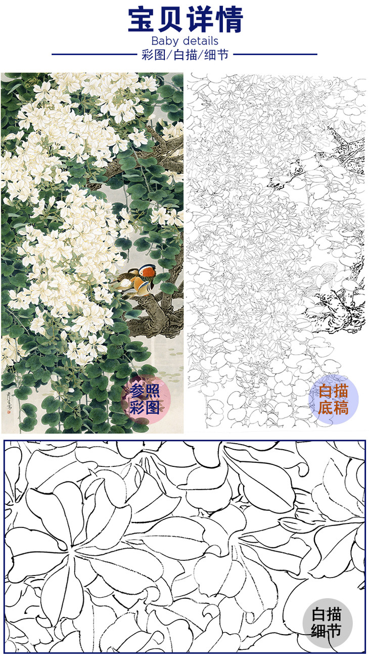 竖幅工笔花鸟白描底稿-周彦生-白荆花鸳鸯《春睡》-多种白描尺寸可选-LV03